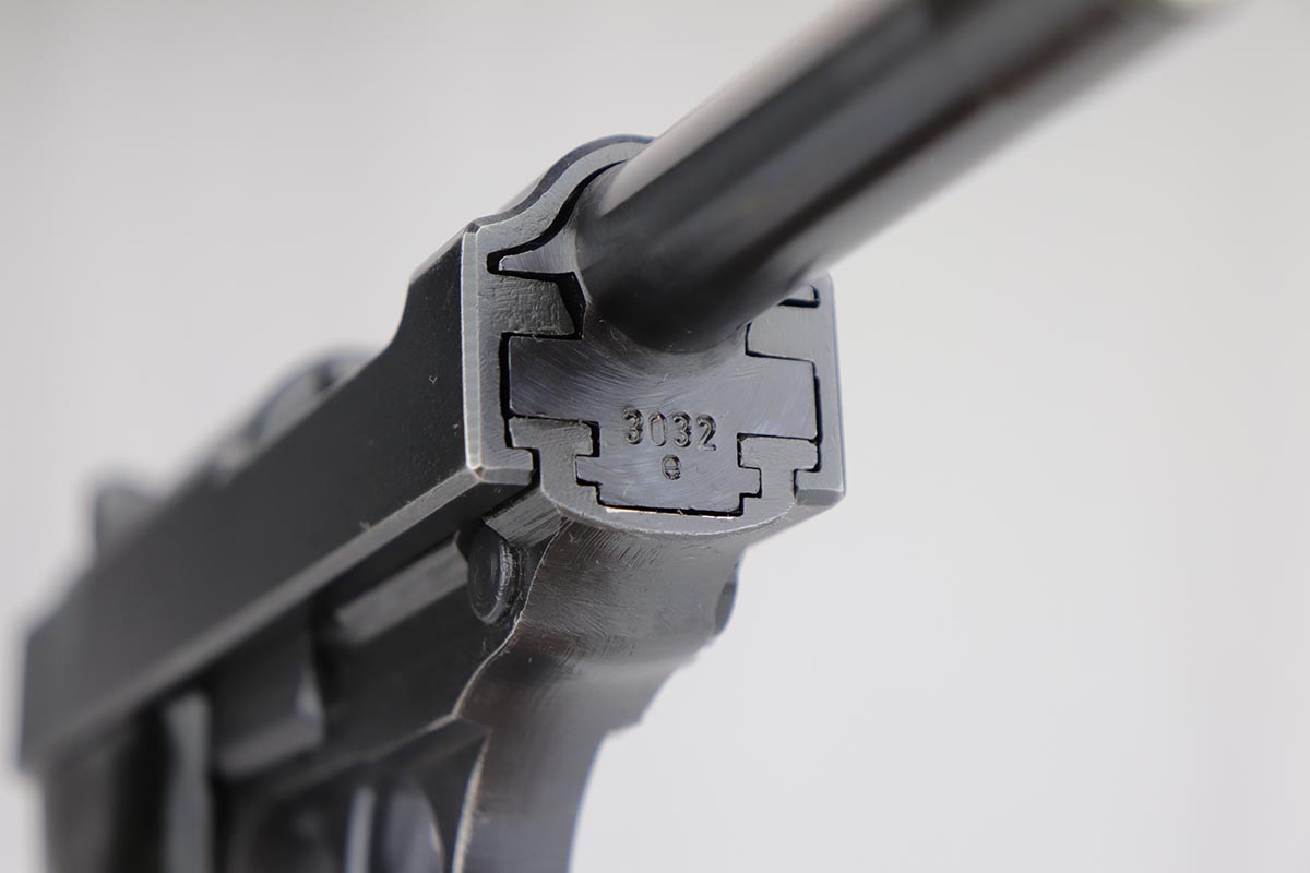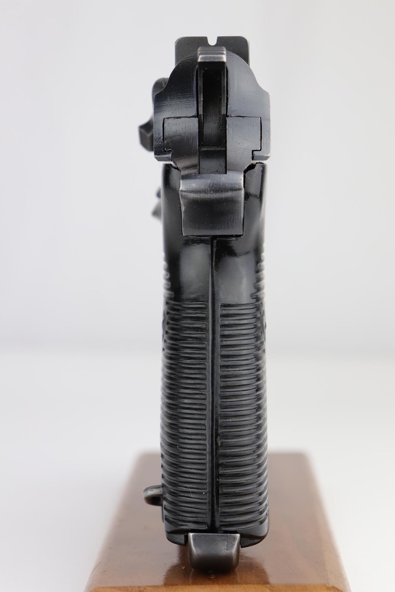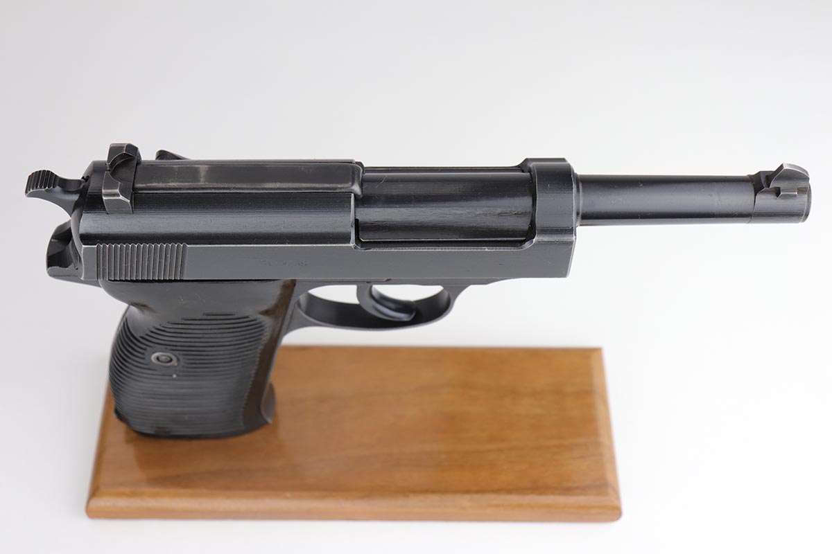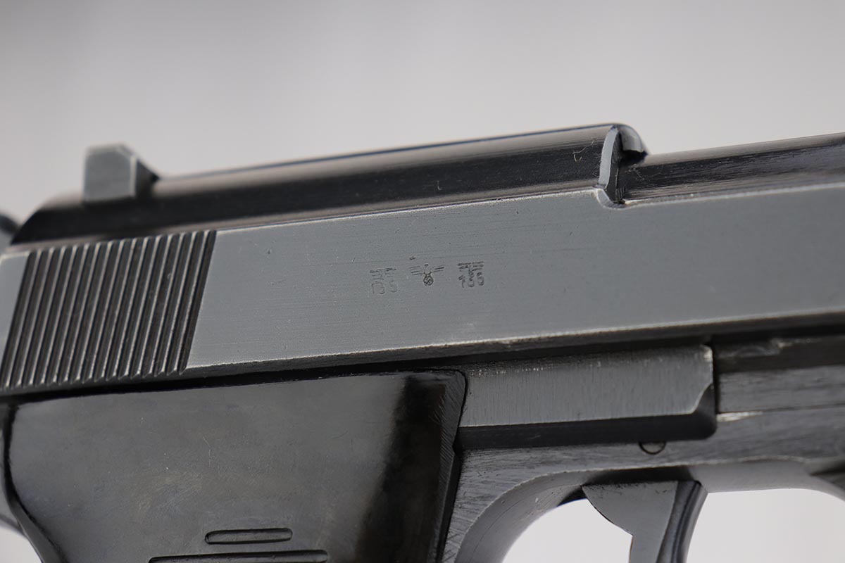 8/21/19 – This is a beautiful Mauser P.38 from May of 1943, with 97-98% of the original dust blue finish remaining. There is only very minor high edge wear, and a little bit of finish loss on the top plate. Good mechanics, including de-cocker. Minty bore and excellent grips.