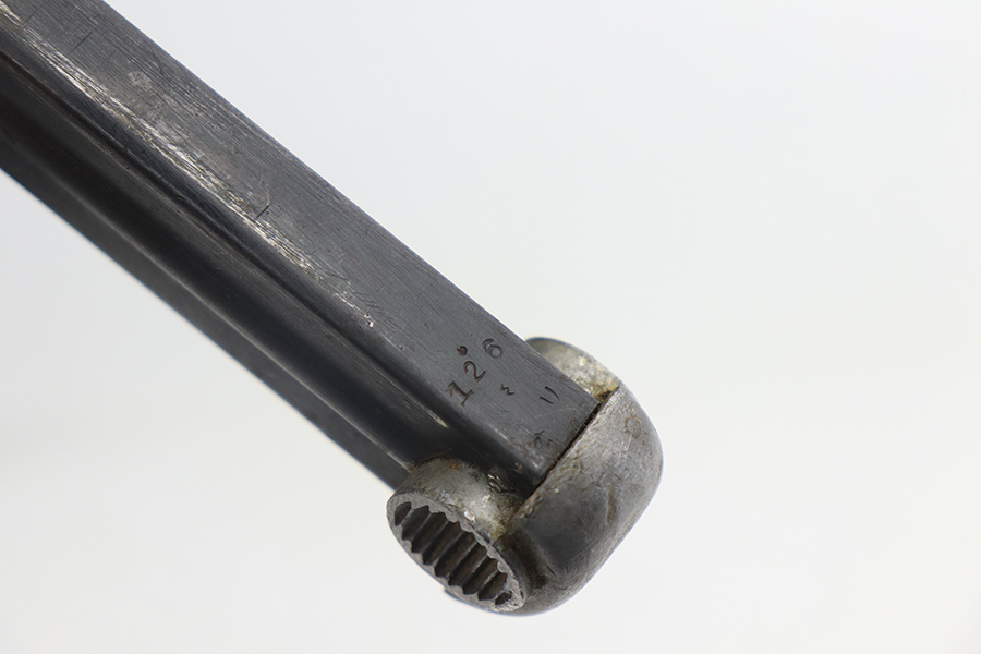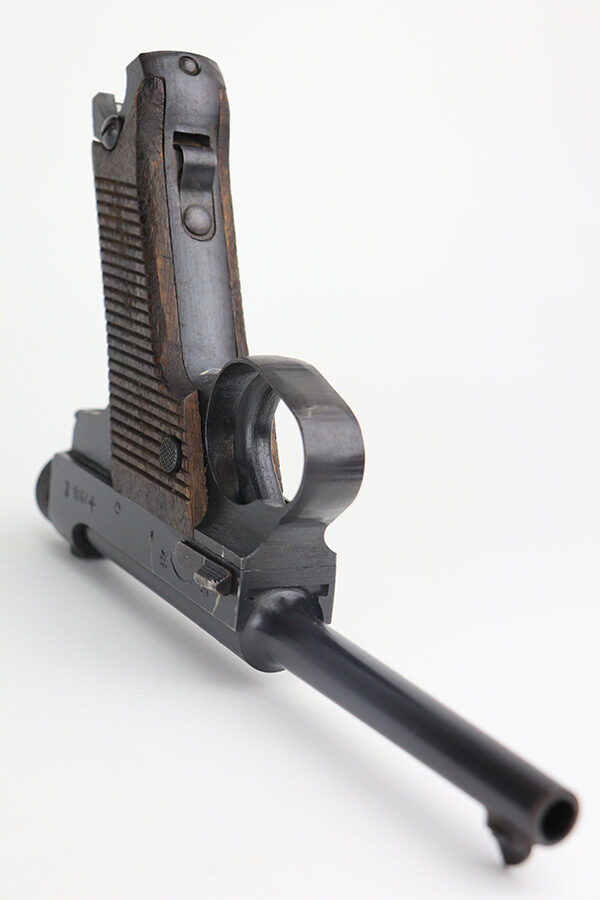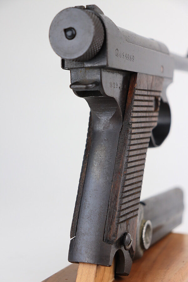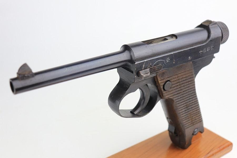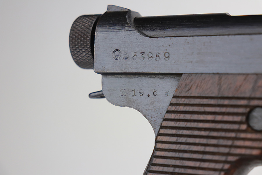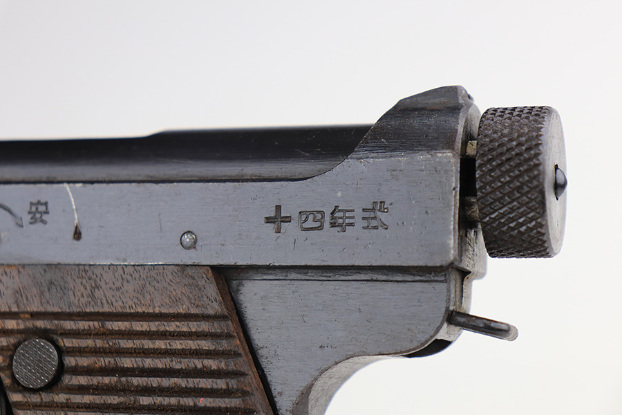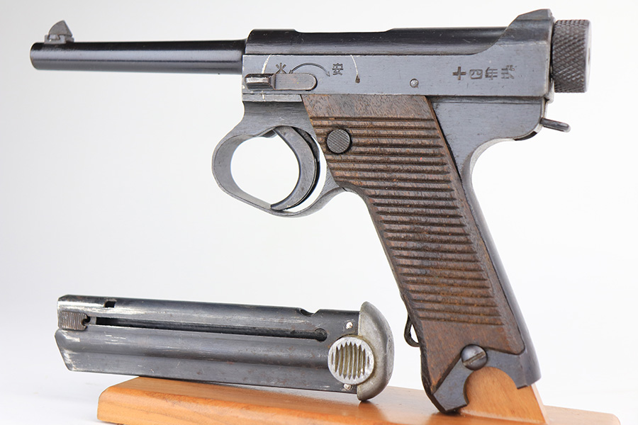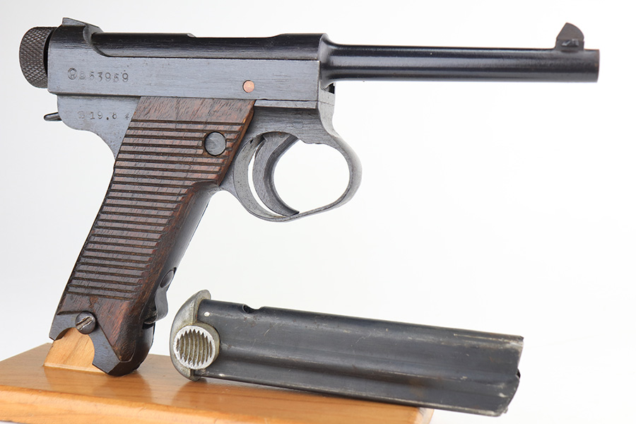 1/26/22 – This is a beautiful example of a Nambu Type 14 issued to the Japanese military in August of 1944. The gun is all matching and has retained about 99% of its original finish. There is just a hint of wear on the left side of the frame near the cocking knob and one tiny spot on the back strap. There are tiny dots of oxidation here and there. Comes with excellent matching-numbered wood grips and one mismatched but period-correct magazine. The bore is stone-mint.
