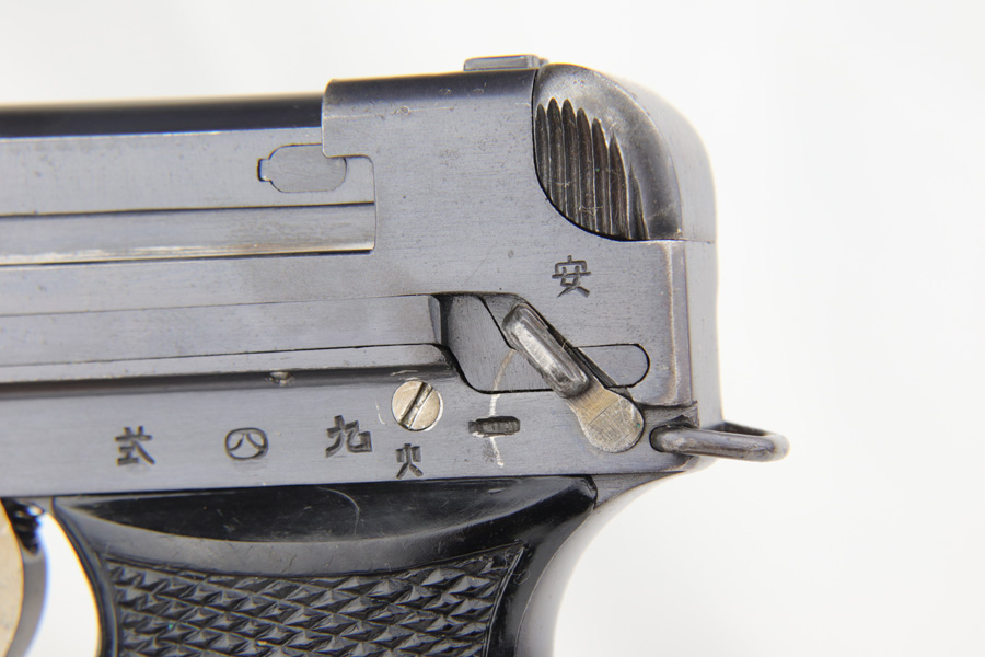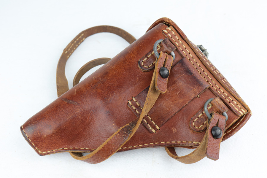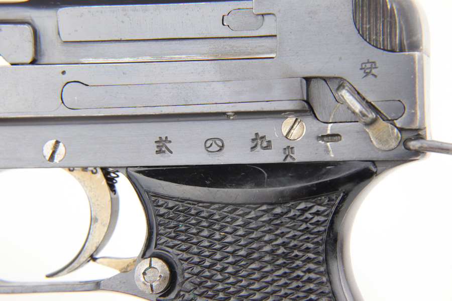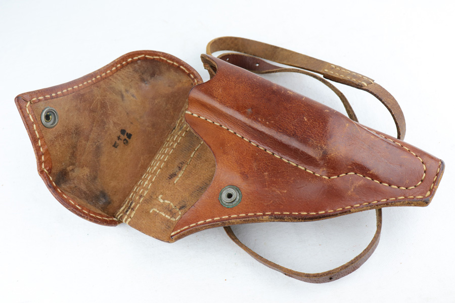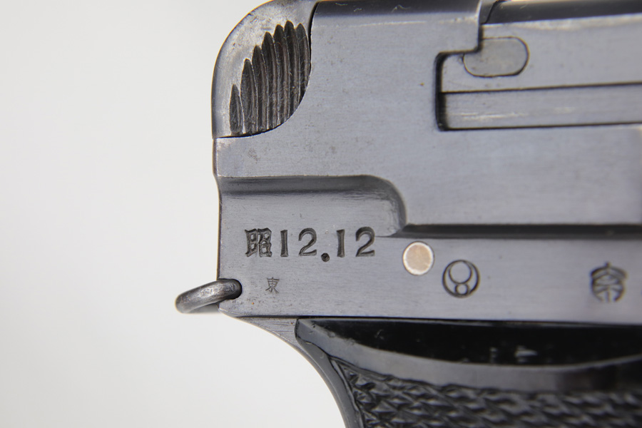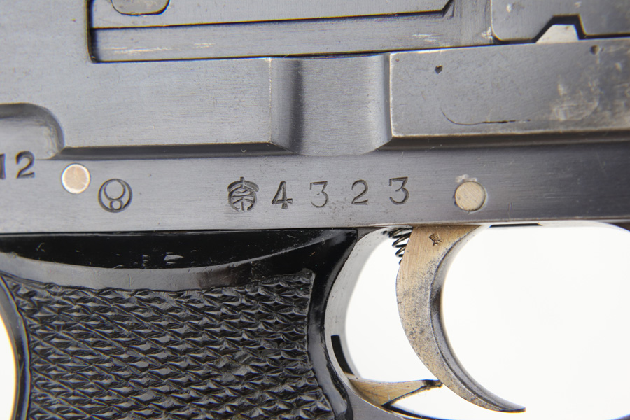 1/15/19 – This is one of the more complete, early Type 94 Japanese pistol rigs that we have come across in years. It’s a third year production, made in December of 1937, and dated year 12.12 of Showa Emperor reign. The gun retains 95-97% of its original blue, with just minimal holster wear present as per pictures and some patina on the straps. There is no pitting anywhere. It is complete with an early leather holster with rarely seen shoulder strap, dated inside the lid, in outstanding condition. The pistol has both matching magazines, though they appear to be from separate arsenals, and an original lanyard cord. Excellent bore and grips. Only about 71,000 Type 94 pistols were made over a period of 10 years, earmarked primarily for air force pilots and tank crews, compared to nearly half a million of T14 pistols made. Early, complete examples in such outstanding condition are nearly impossible to find.