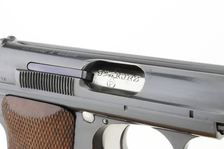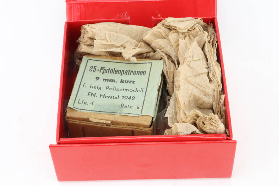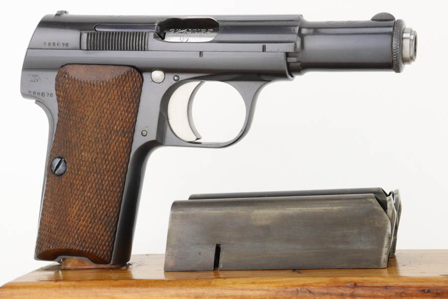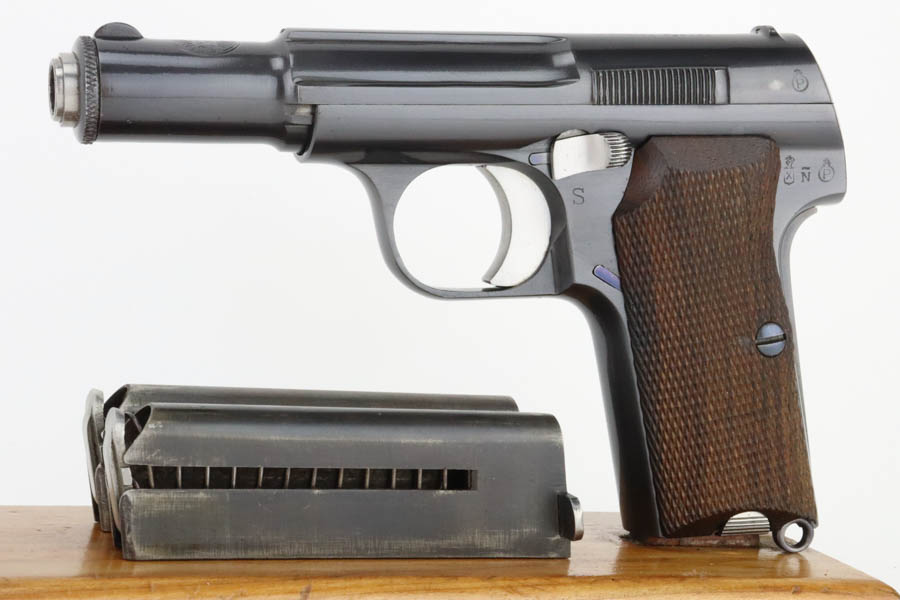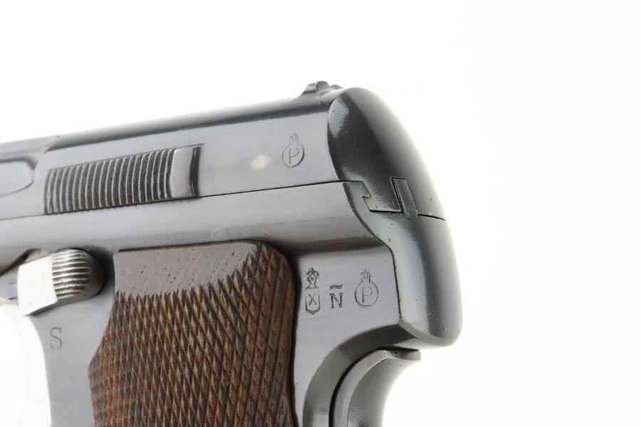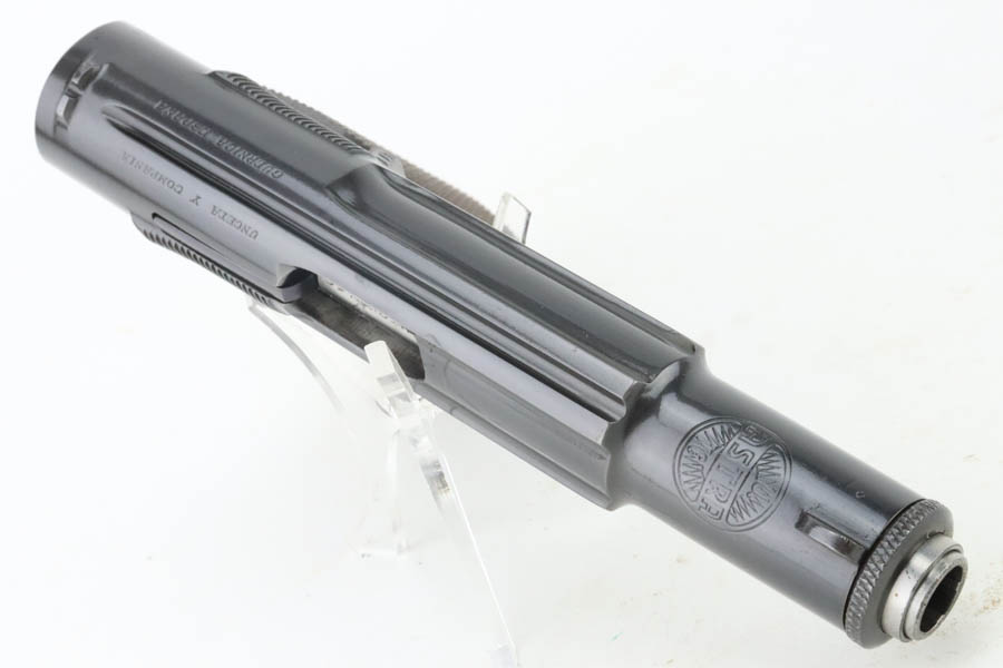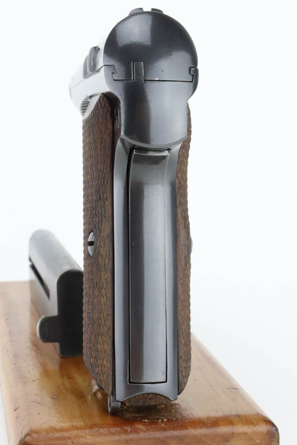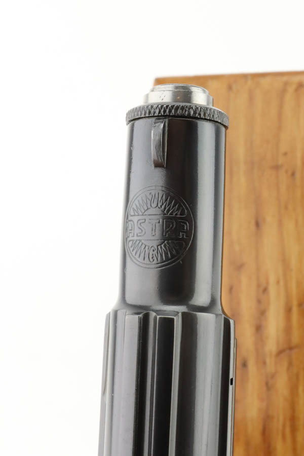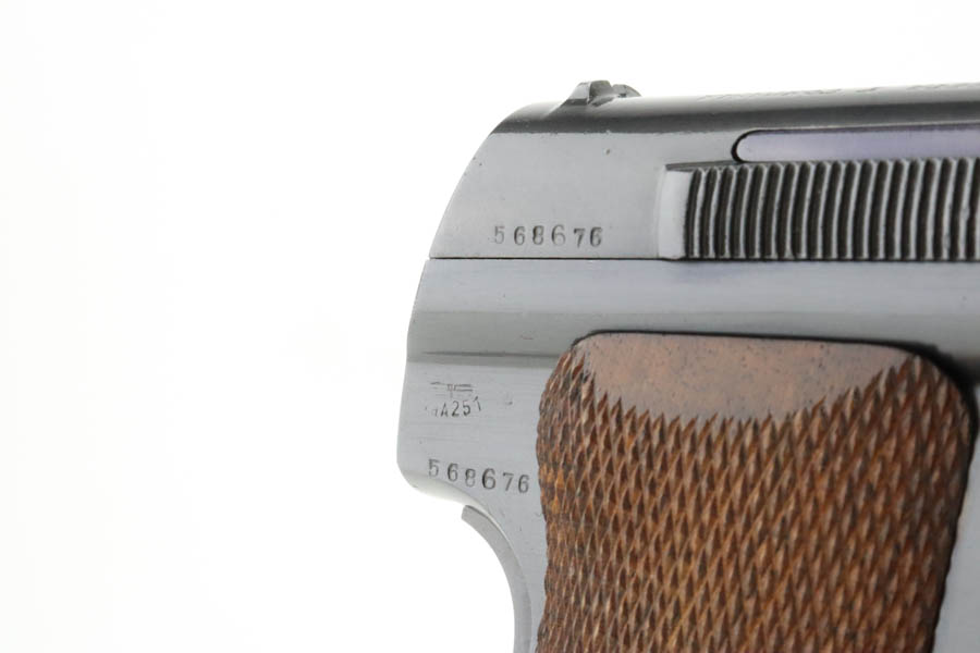 7/10/24 – This is a beautiful example of a Spanish Astra Model 300 issued to the Nazi military on March 13th, 1943, along with 3,500 other guns. Chambered in 9mm kurz. All matching with the proper “Waffen 251” military acceptance proof on the right side of the frame. It comes as a rig with an un-issued holster (very clear ink stamps on the inside), two proper magazines, an original box of ammo (dated 1942), and an un-circulated owners manual. The manual is a rare, original example printed in German and is in mint condition. The gun has retained all of its finish with no signs of wear or use. Mint wood grips. The bore has great rifling with just light pin-pricking throughout.
