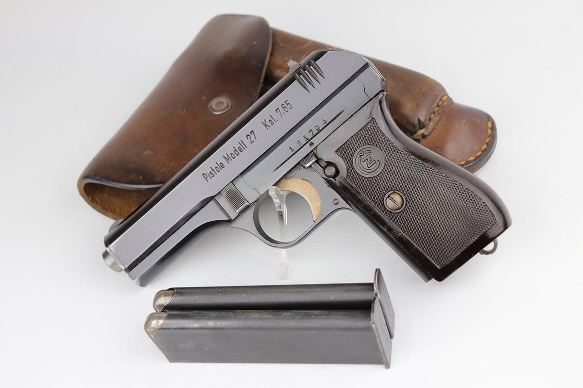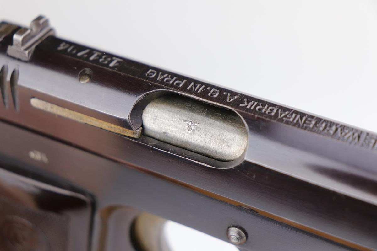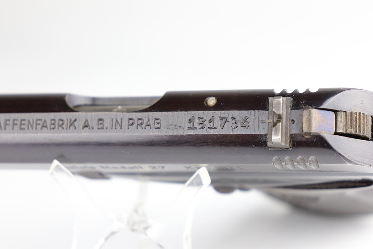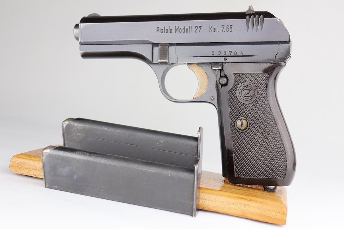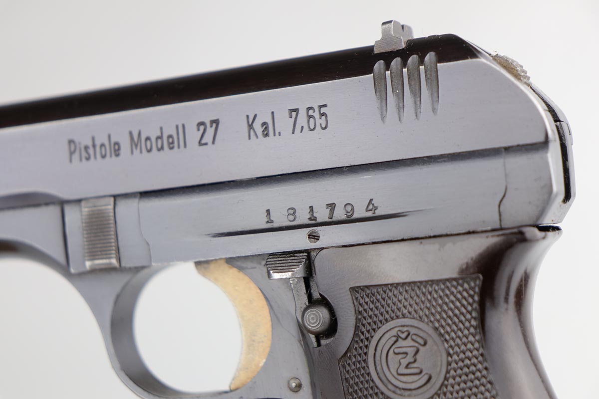 2/14/20 – This is a terrific and complete CZ 27 rig that was made in the early 1940s for the German Army. The high-polish blue rates at about 98% with minor muzzle wear on the slide, and a bit of finish loss on the front edge of the frame. There’s also a couple minor scuffs on the right slide edge, and hint of wear on the front strap. Sharp waffenamt on frame. Mint bore and a fantastic grip with no chips, which is extremely uncommon for these. The rig includes a total of two magazines, and is completed by a very nice holster that is 1942 dated and has a sharp waffenamt. The leather is in great condition, and the only notable drawback is the large name written inside the flap.