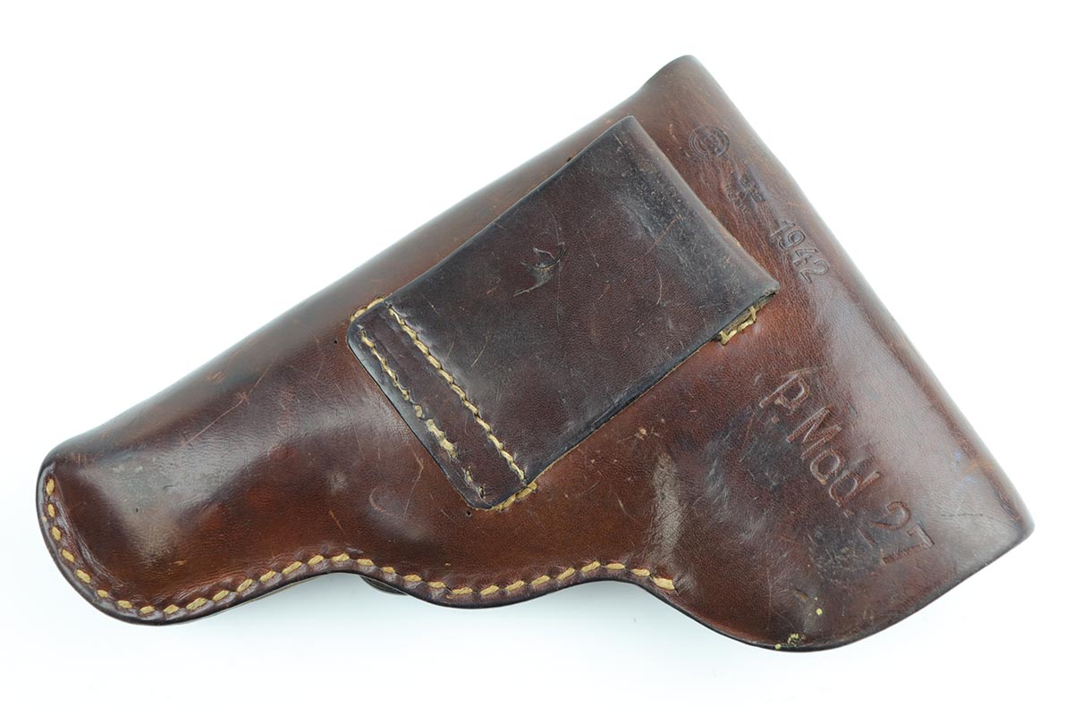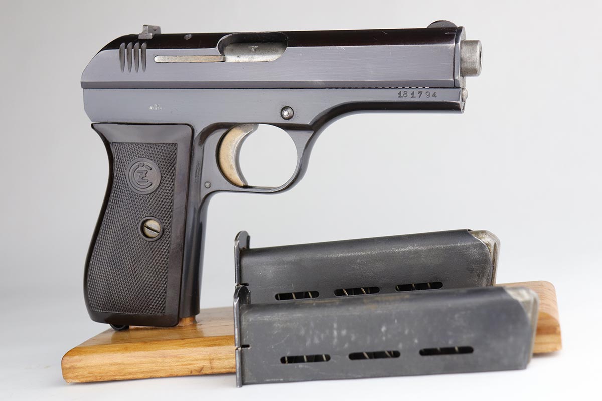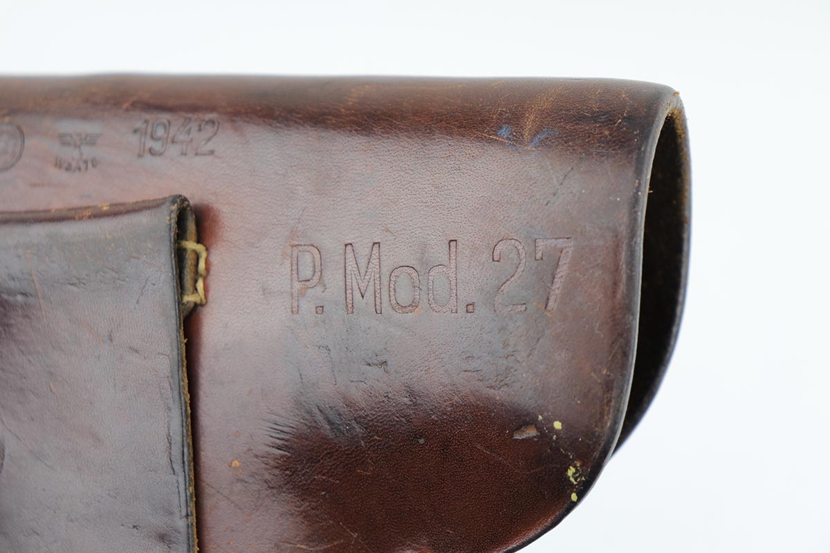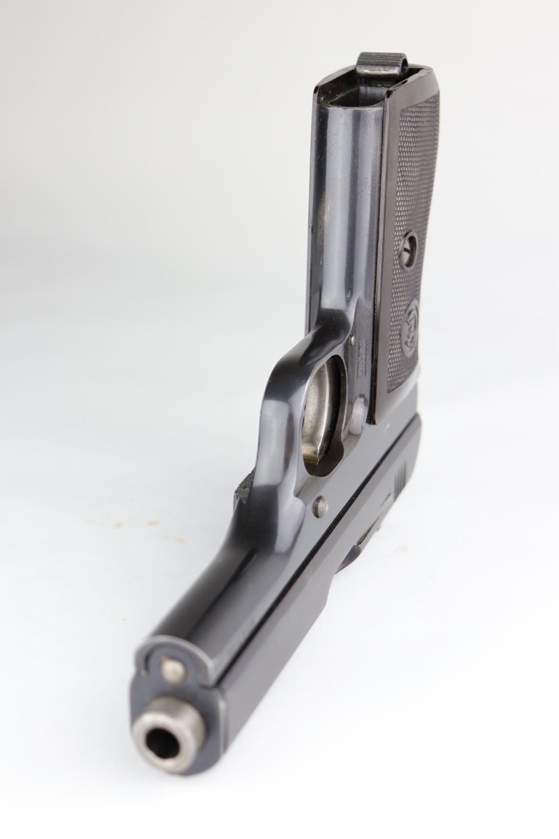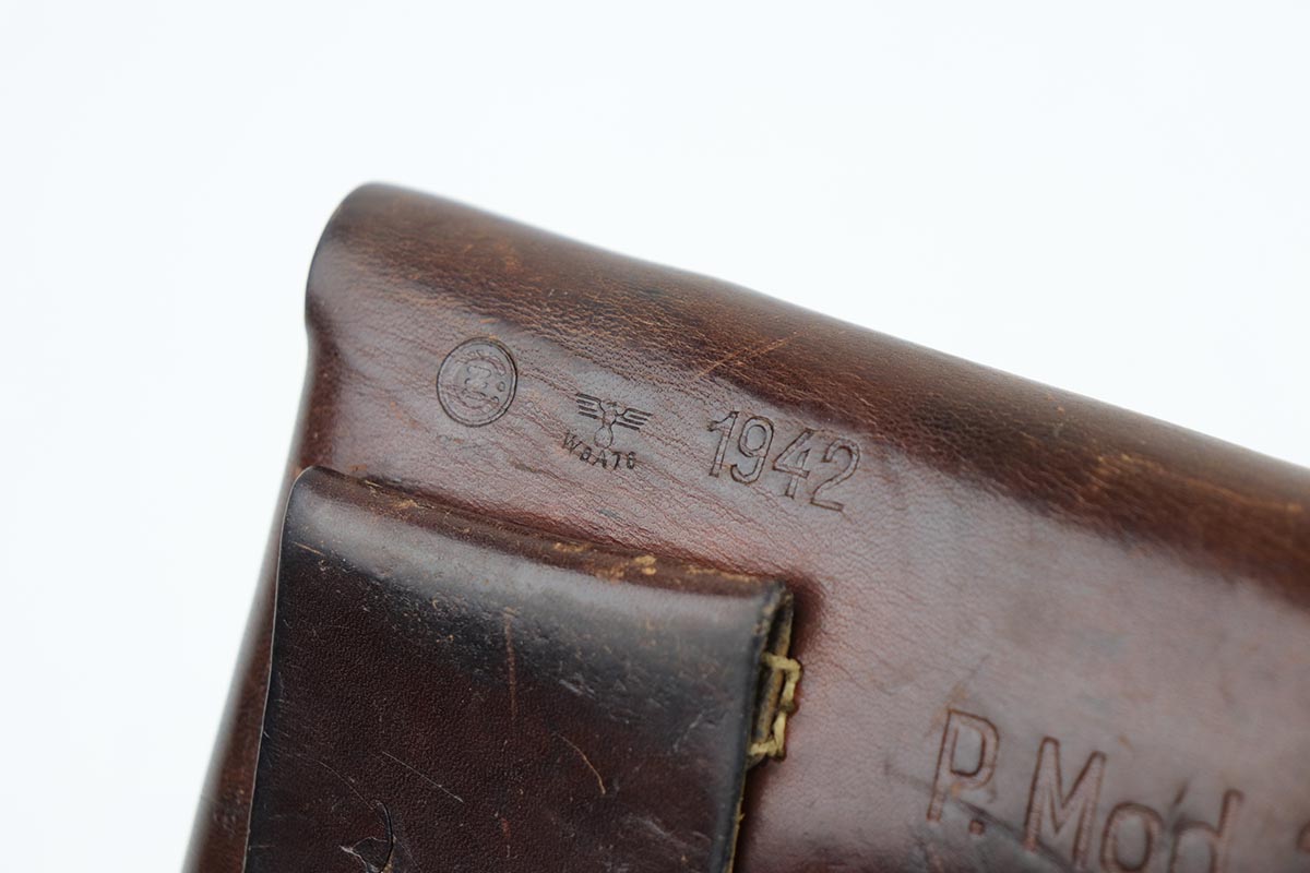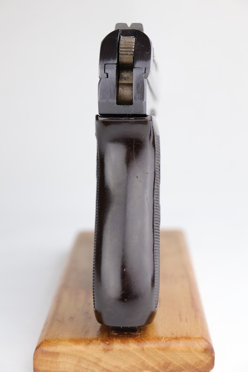 2/14/20 – This is a terrific and complete CZ 27 rig that was made in the early 1940s for the German Army. The high-polish blue rates at about 98% with minor muzzle wear on the slide, and a bit of finish loss on the front edge of the frame. There’s also a couple minor scuffs on the right slide edge, and hint of wear on the front strap. Sharp waffenamt on frame. Mint bore and a fantastic grip with no chips, which is extremely uncommon for these. The rig includes a total of two magazines, and is completed by a very nice holster that is 1942 dated and has a sharp waffenamt. The leather is in great condition, and the only notable drawback is the large name written inside the flap.