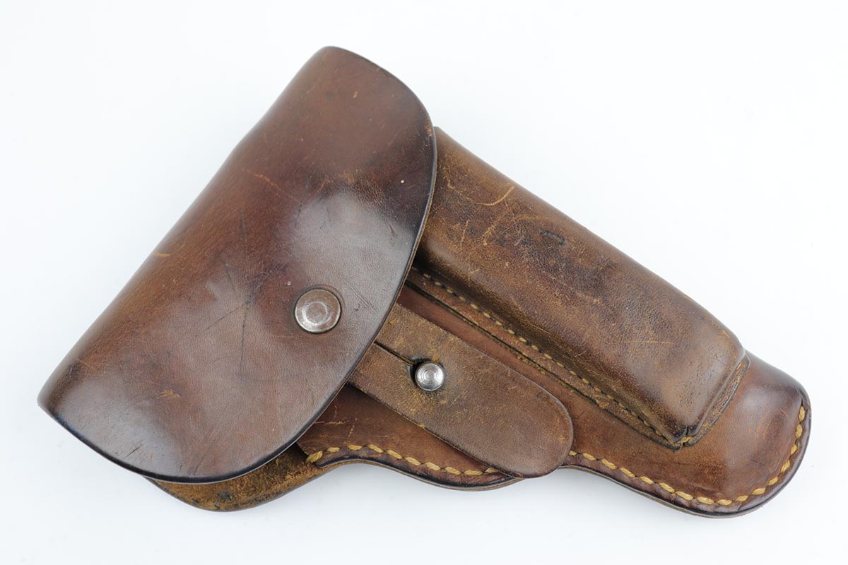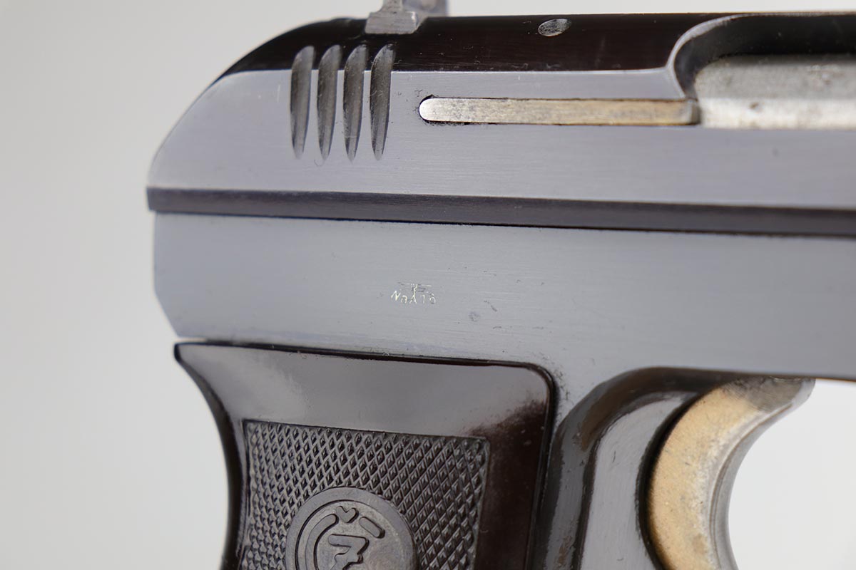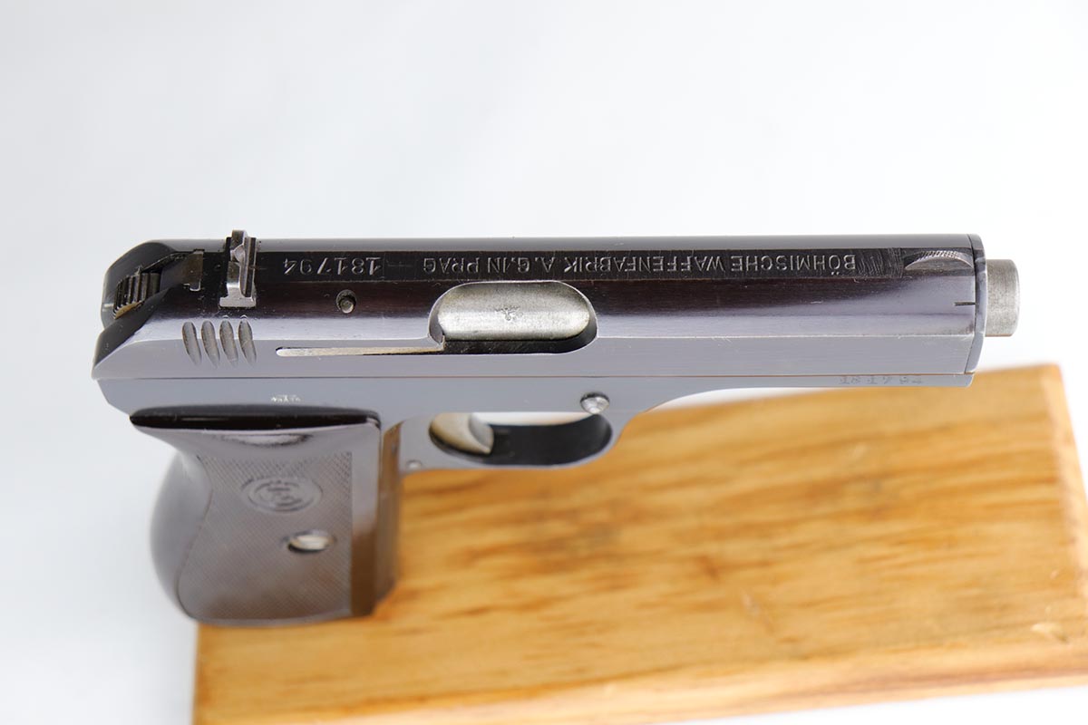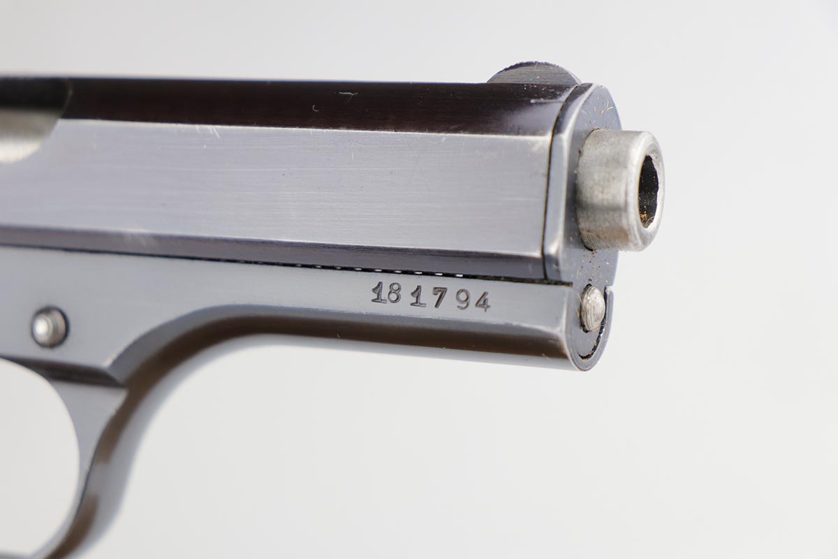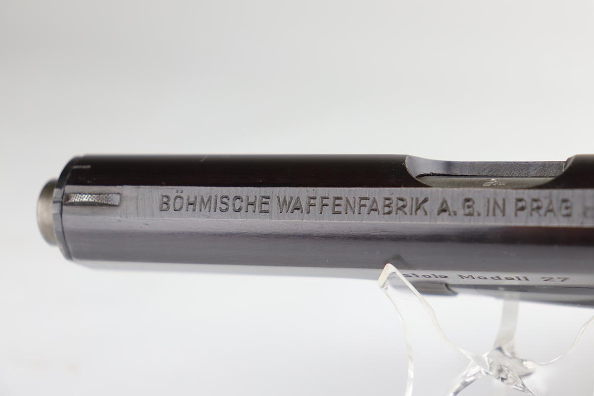 2/14/20 – This is a terrific and complete CZ 27 rig that was made in the early 1940s for the German Army. The high-polish blue rates at about 98% with minor muzzle wear on the slide, and a bit of finish loss on the front edge of the frame. There’s also a couple minor scuffs on the right slide edge, and hint of wear on the front strap. Sharp waffenamt on frame. Mint bore and a fantastic grip with no chips, which is extremely uncommon for these. The rig includes a total of two magazines, and is completed by a very nice holster that is 1942 dated and has a sharp waffenamt. The leather is in great condition, and the only notable drawback is the large name written inside the flap.