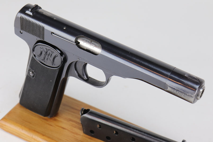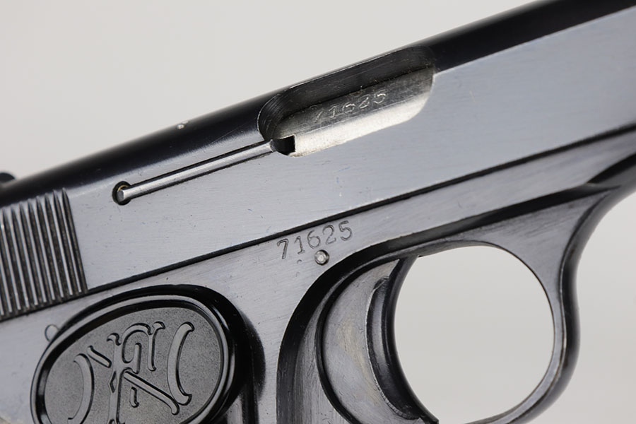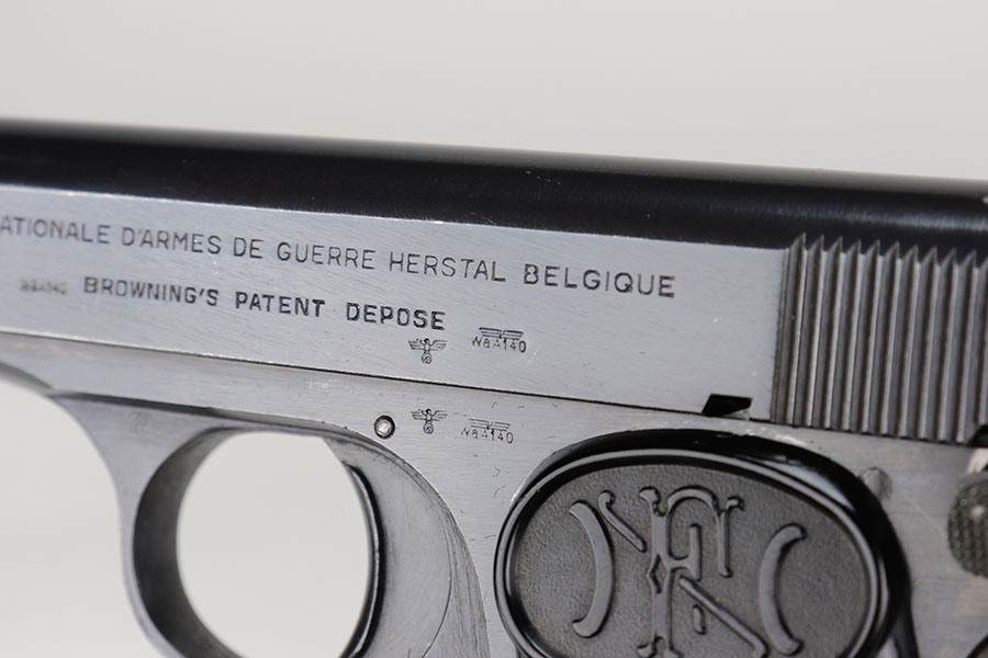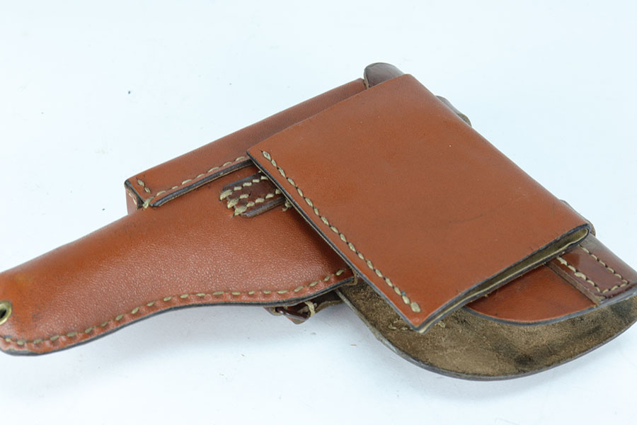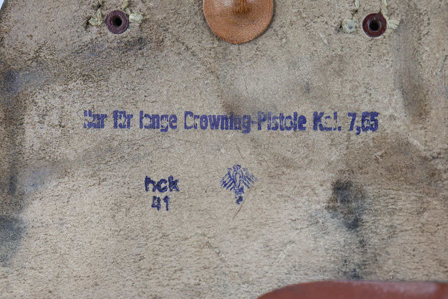10/28/20 – This is an excellent and complete FN Browning Model 1922 rig that was issued to the German military during the war. It’s all matching and original with about 96-97% of the blue remaining. Standard muzzle wear from the holster, and a tiny bit more on the back of the frame. Minty bore and grips. Both magazines have WaA140 proofs, same as the pistol. Rig completed by an excellent holster which is 1941 dated with ‘hck’ maker mark and internal inkstamp.