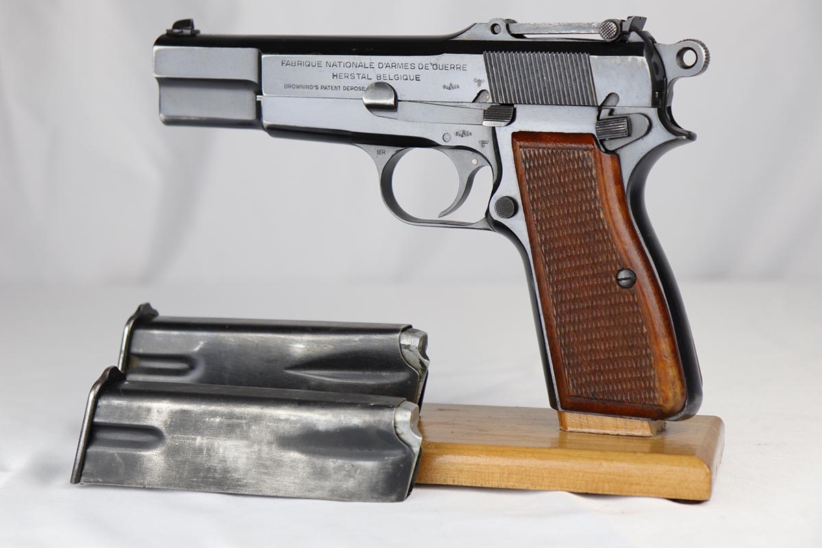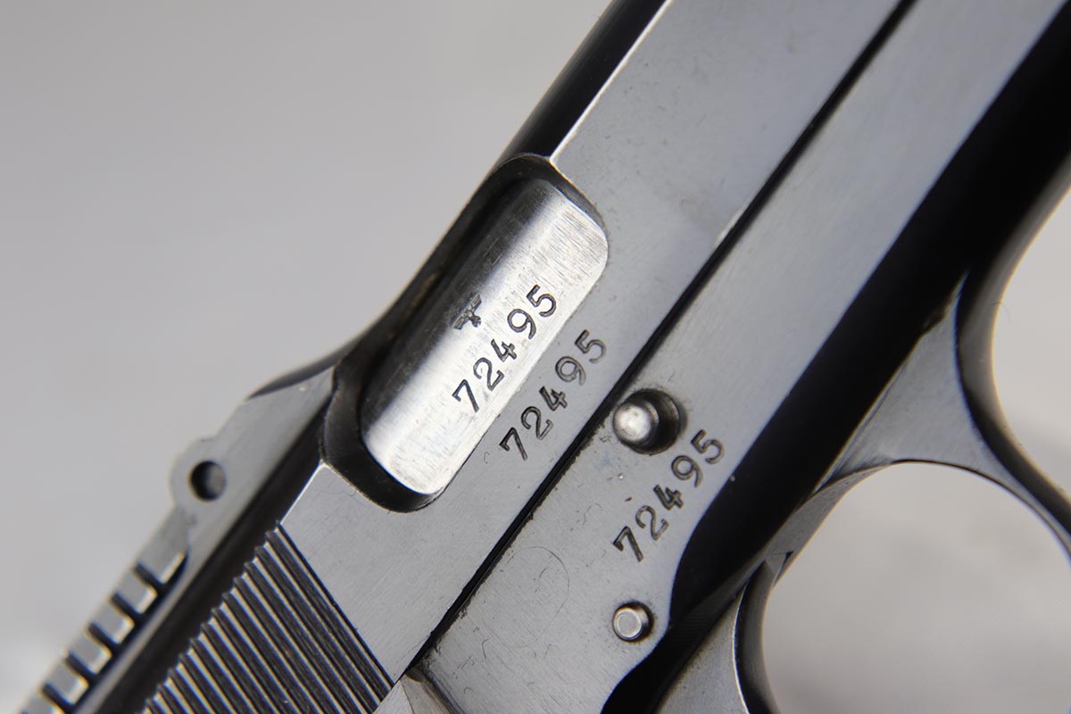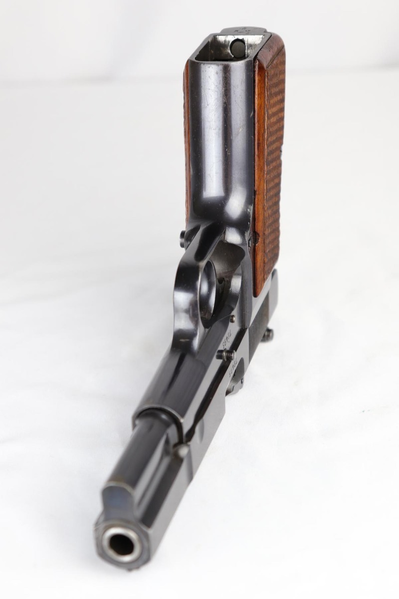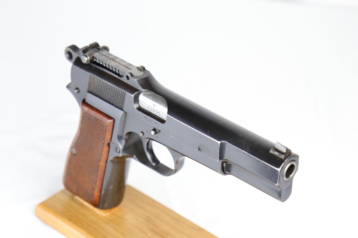 5/9/18 – This is a beautiful Browning High Power rig with tangent sight from the early days of the Nazi occupation in Belgium.  It has an excellent and original high-polish finish, rating at about 96%.  The wear is on the high edges of slide and very bottom of the back strap.  The slide and frame are WaA103 proofed, as are both of the magazines.  The holster is very nice, and dated ’43 with maker mark and waffenamt.  There were only ~30,000 of this variation produced.  Excellent bore and grips.