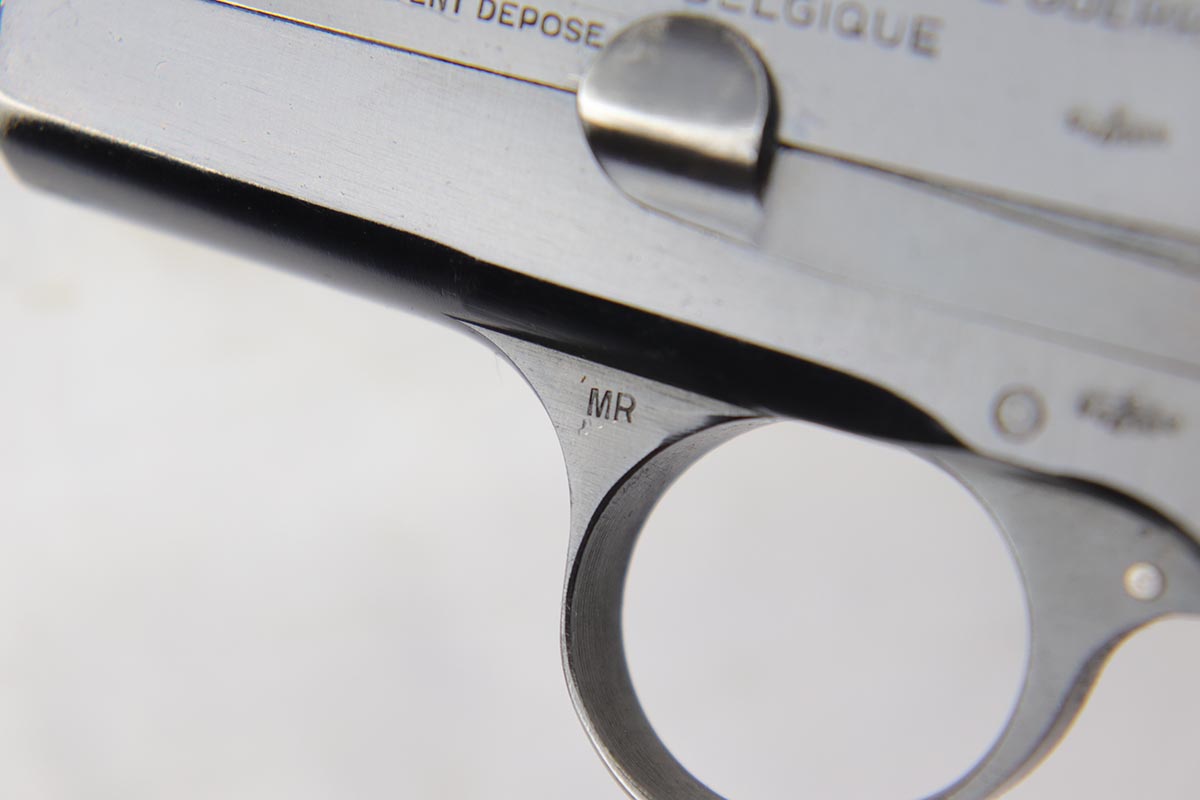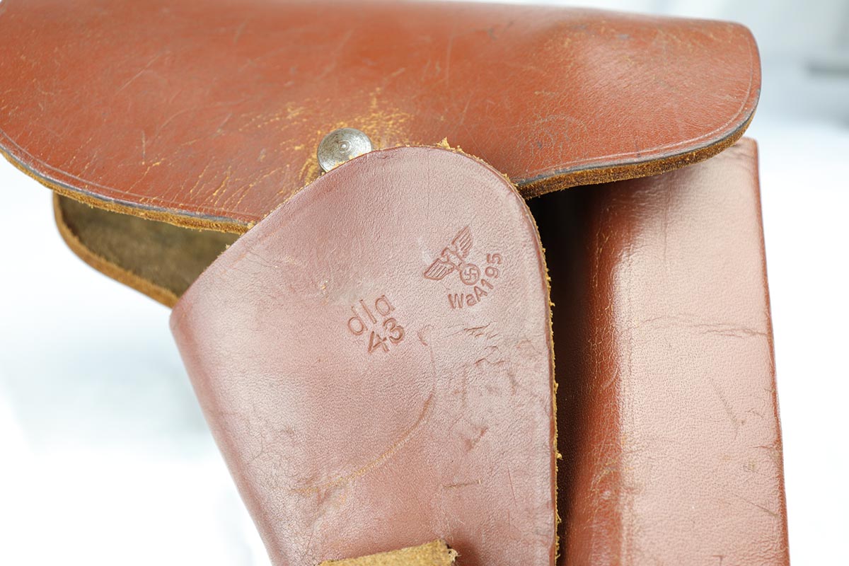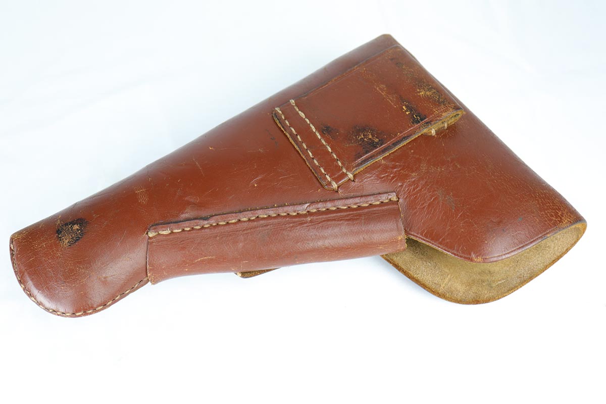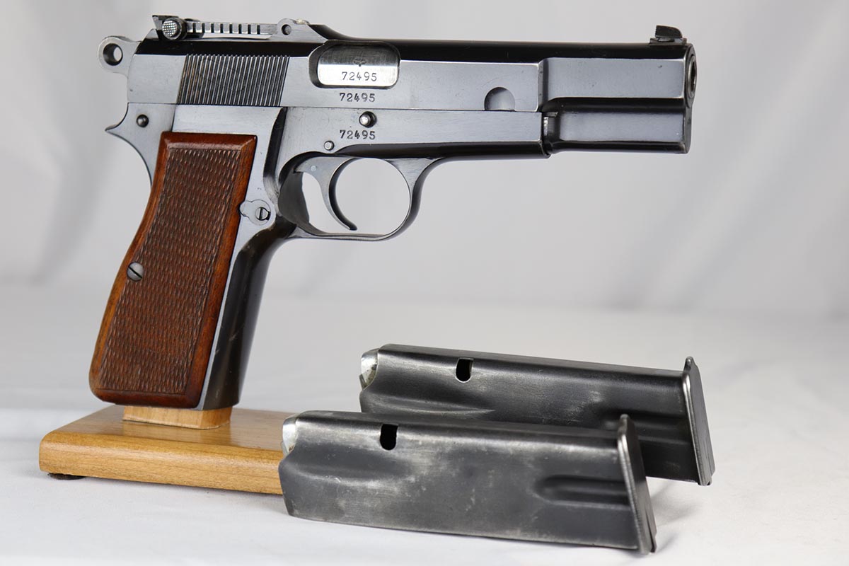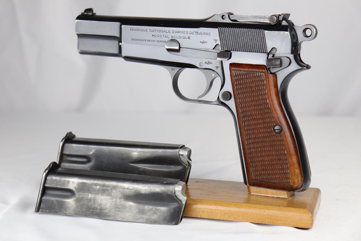 5/9/18 – This is a beautiful Browning High Power rig with tangent sight from the early days of the Nazi occupation in Belgium.  It has an excellent and original high-polish finish, rating at about 96%.  The wear is on the high edges of slide and very bottom of the back strap.  The slide and frame are WaA103 proofed, as are both of the magazines.  The holster is very nice, and dated ’43 with maker mark and waffenamt.  There were only ~30,000 of this variation produced.  Excellent bore and grips.