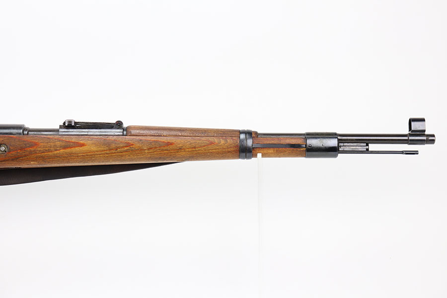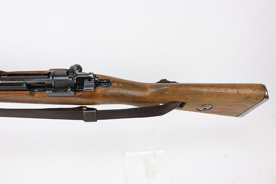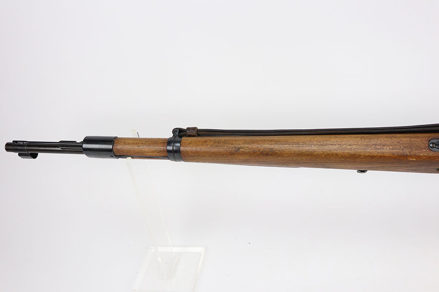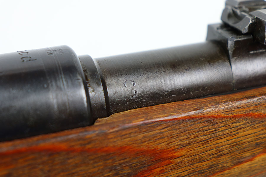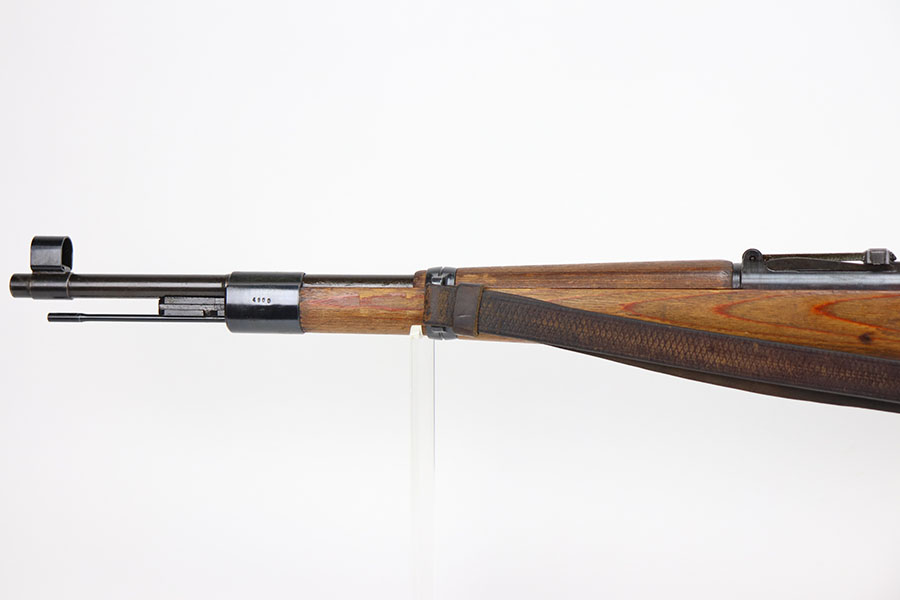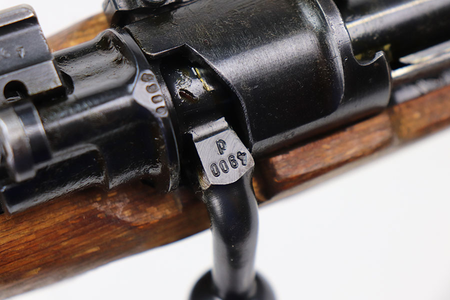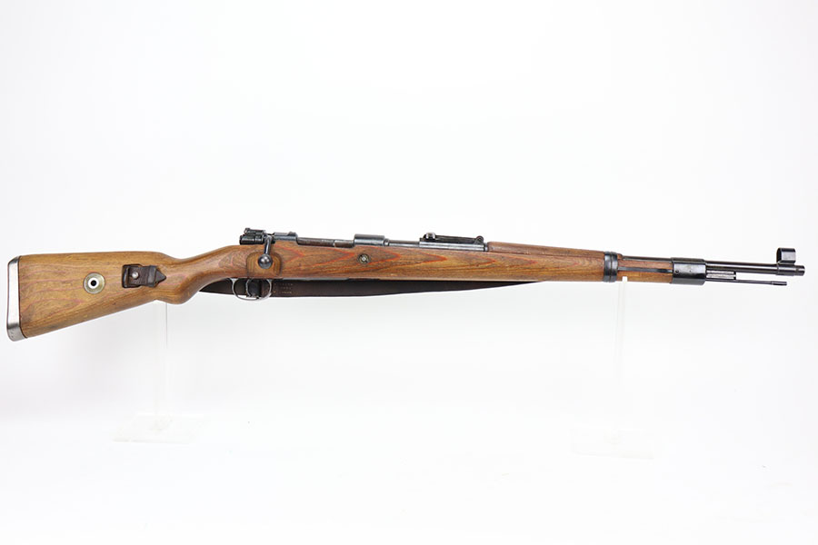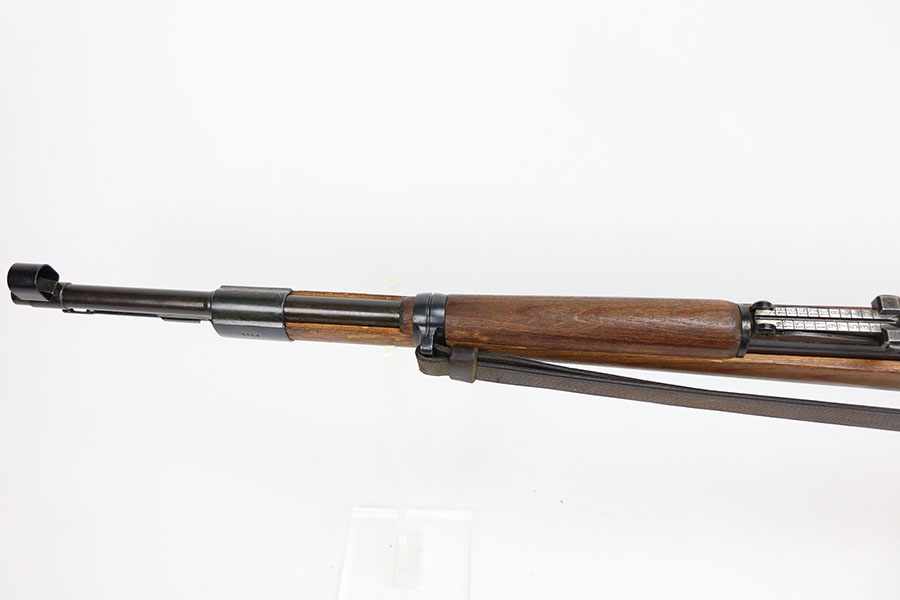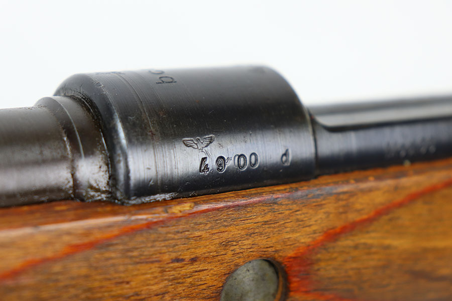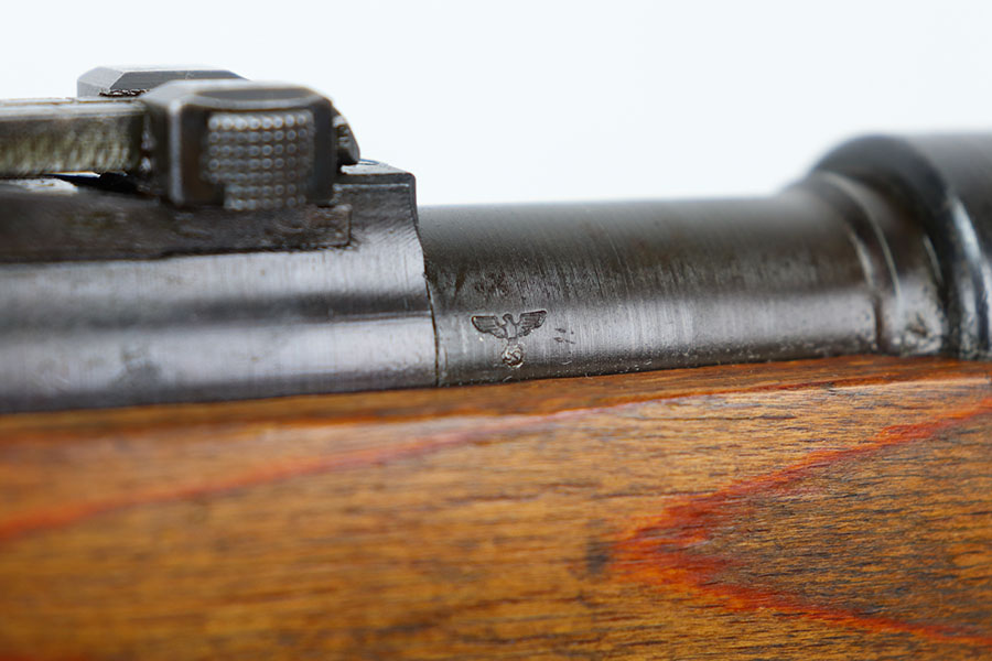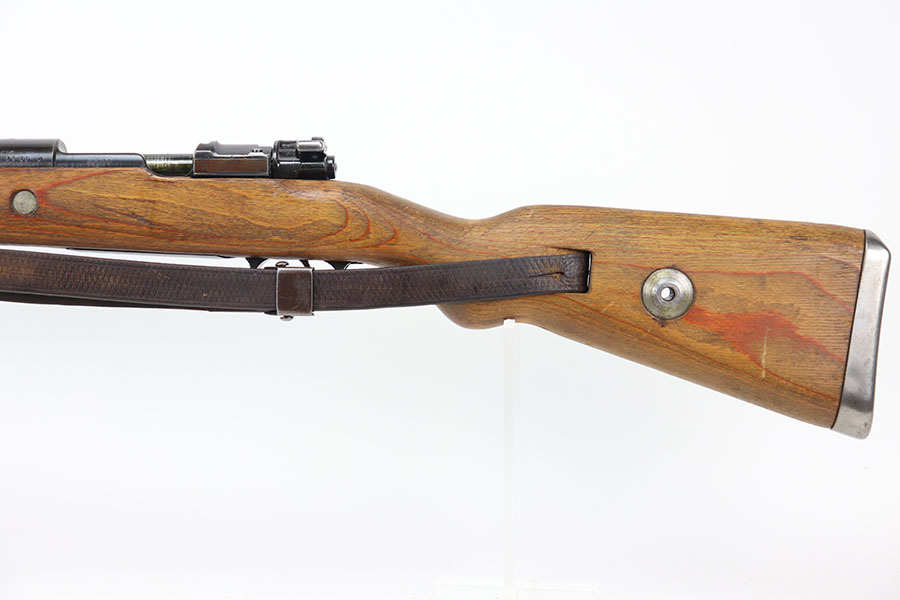 4/26/21 – This is a beautiful Nazi Model 98K rifle that was made in 1943 at the Gustloff Werke factory. All matching numbers with hardly any bluing loss on the metal parts, just a little bit of wear on the trigger group. Matching bands, trigger assembly, receiver, barrel, bolt assembly, rear sight. Includes original sling, sight hood and cleaning rod. Heer Army proof on stock, and ‘c’ on underside. Strong, shiny bore with only minor signs of use.