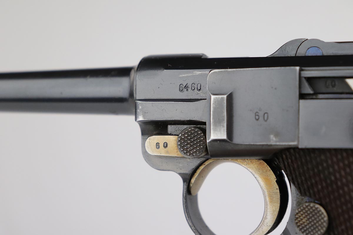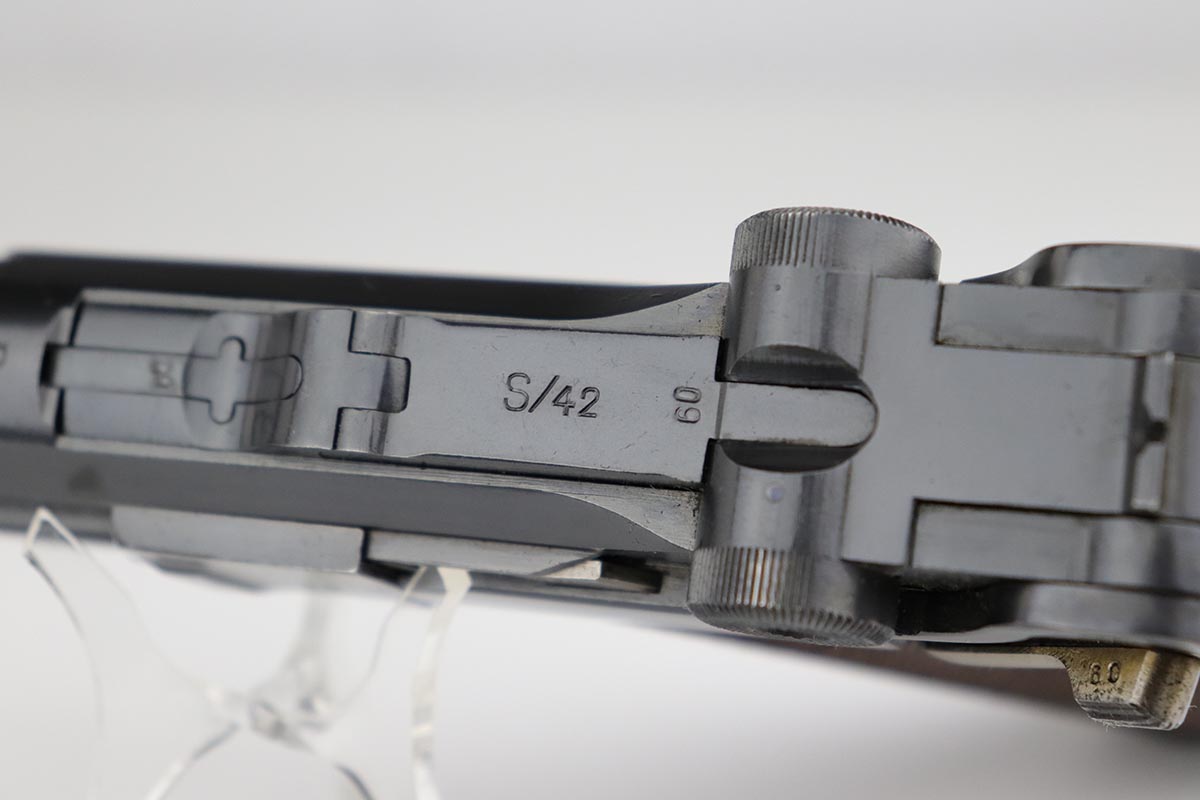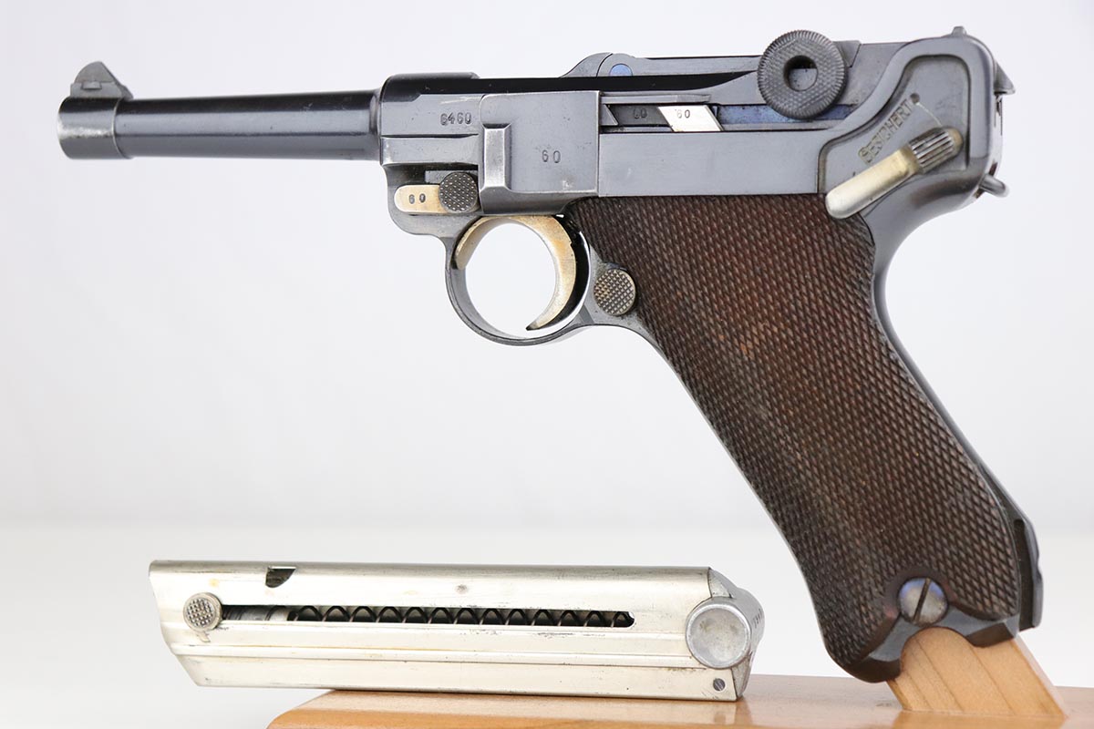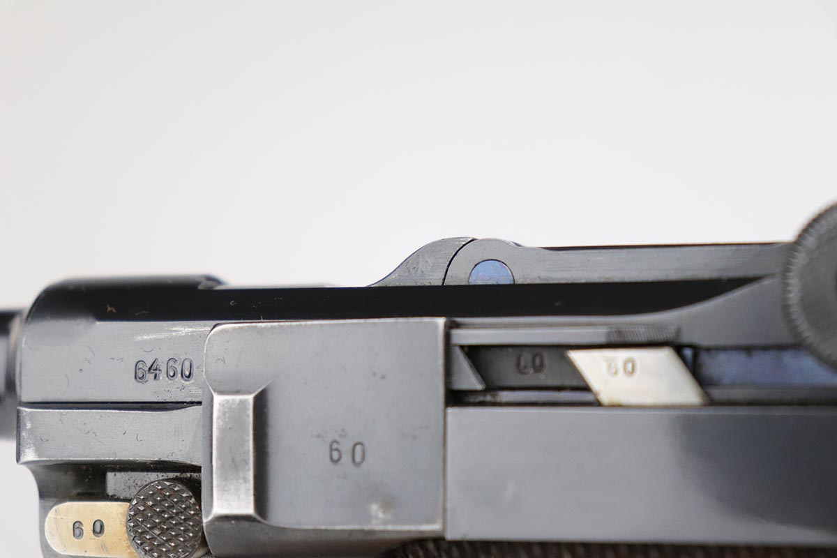 5/2/19 – This is a gorgeous example of a Nazi Mauser Luger from 1935 with ‘G’ date code above the chamber, used to hide the fact the Germans were producing military arms in 1935. The pistol is all matching and original with about 97% original blue, showing only minor high edge wear on the pistol. Beautiful straw remains, rating at 80-90%. The original matching grips are present and in excellent condition. Correct but mismatched magazine. Excellent bore.