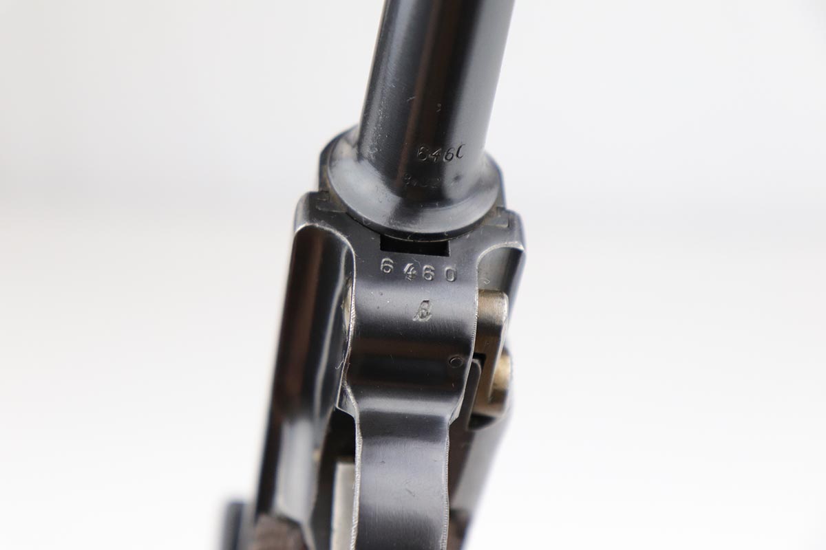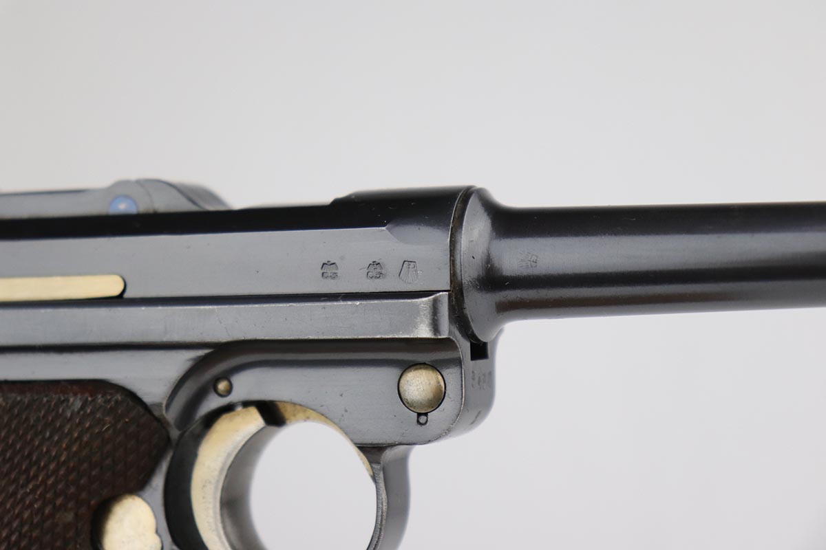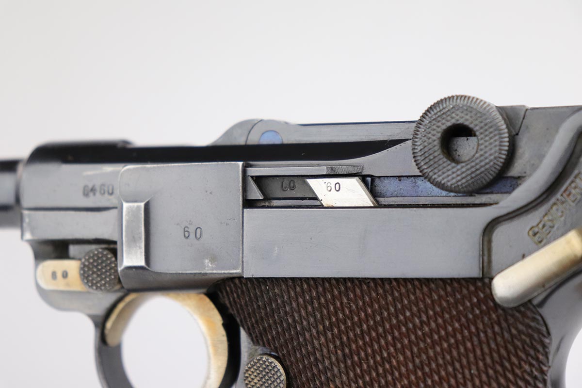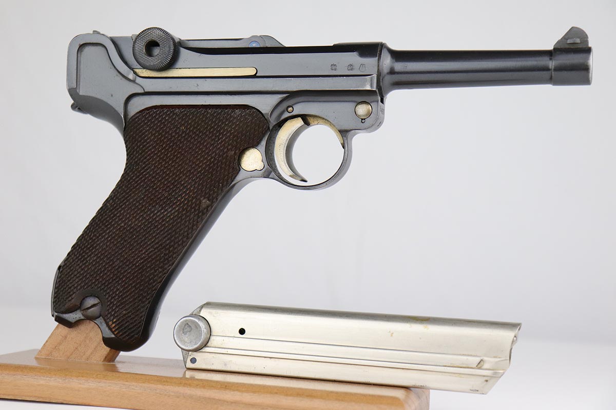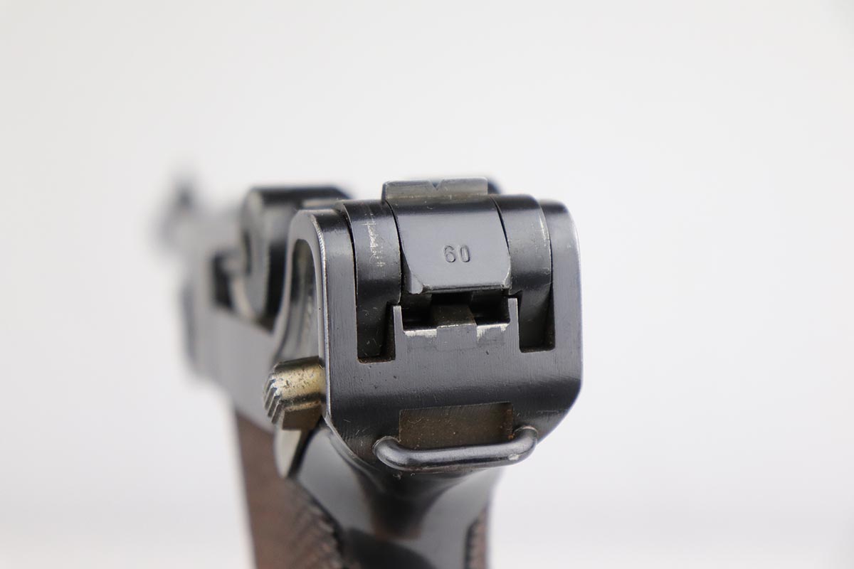 5/2/19 – This is a gorgeous example of a Nazi Mauser Luger from 1935 with ‘G’ date code above the chamber, used to hide the fact the Germans were producing military arms in 1935. The pistol is all matching and original with about 97% original blue, showing only minor high edge wear on the pistol. Beautiful straw remains, rating at 80-90%. The original matching grips are present and in excellent condition. Correct but mismatched magazine. Excellent bore.