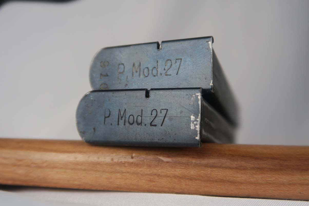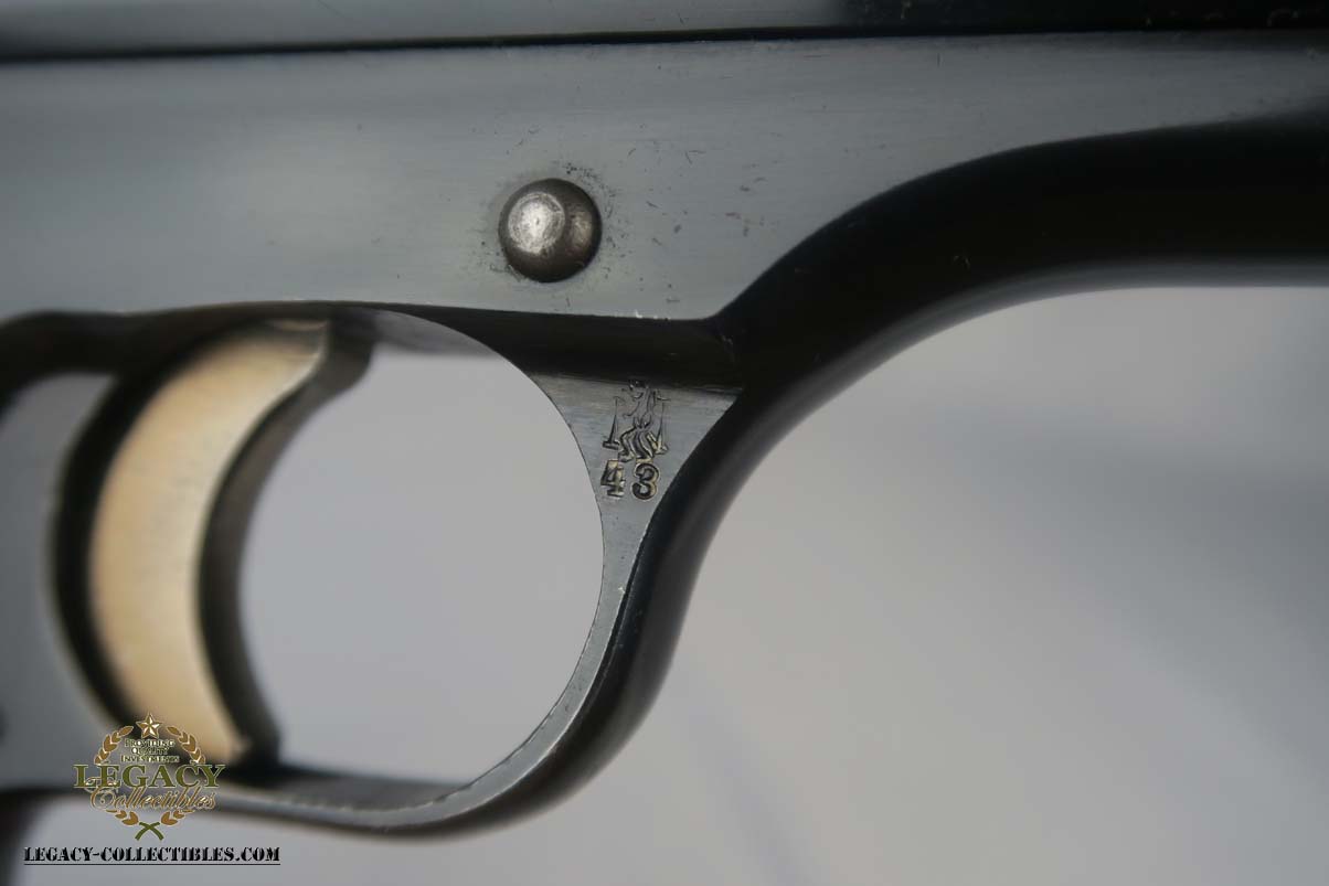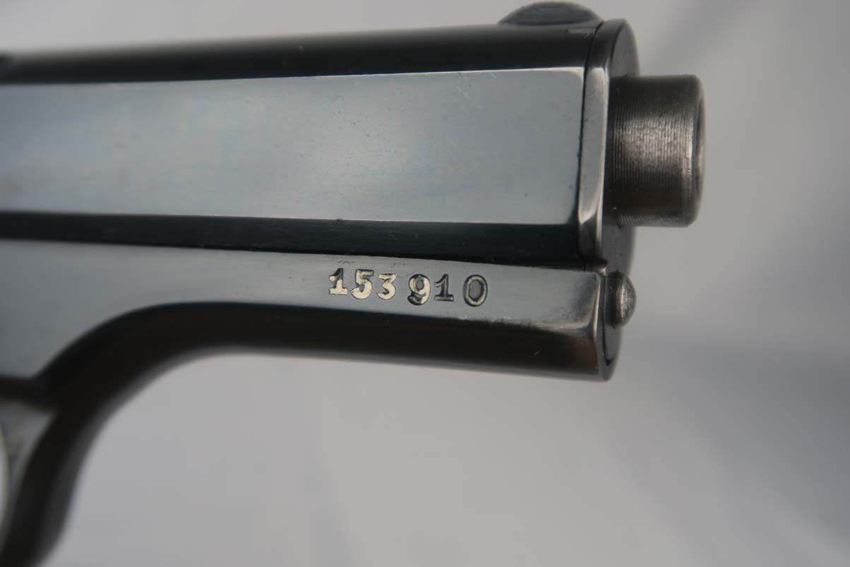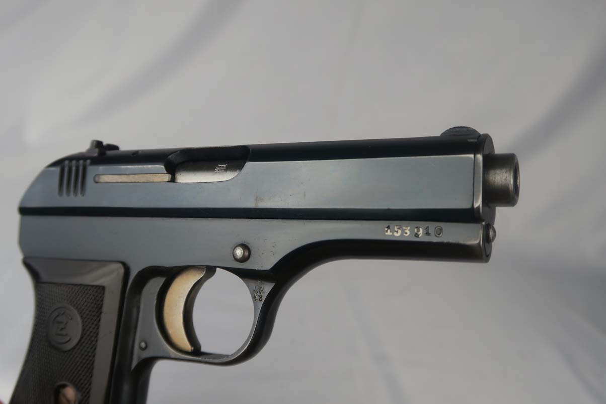 5/9/17 – This is an excellent high-polish finish Police Eagle/K CZ-27 rig with a matching magazine. These Eagle/K CZ-27’s are very rare as only about 5,500 were produced. This is a first variation and is dated 43 with a Czech Lion/N on the trigger guard. The top of the slide is marked “BHMISCHE WAFFENFABRIK A.G. PRAG”. The pistols original finish is about 98%, with a spot of wear on the trigger guard.  The rig includes a period correct spare magazine, and a 1943 dated CZ-27 holster.  Near-mint bore.