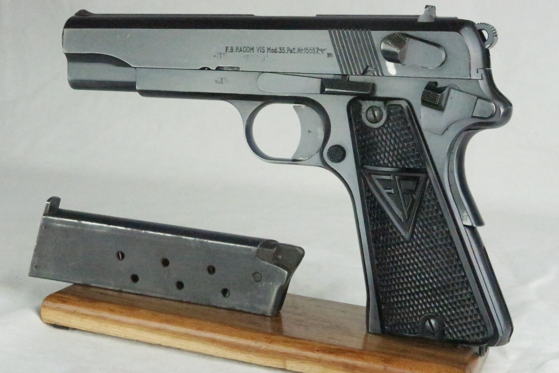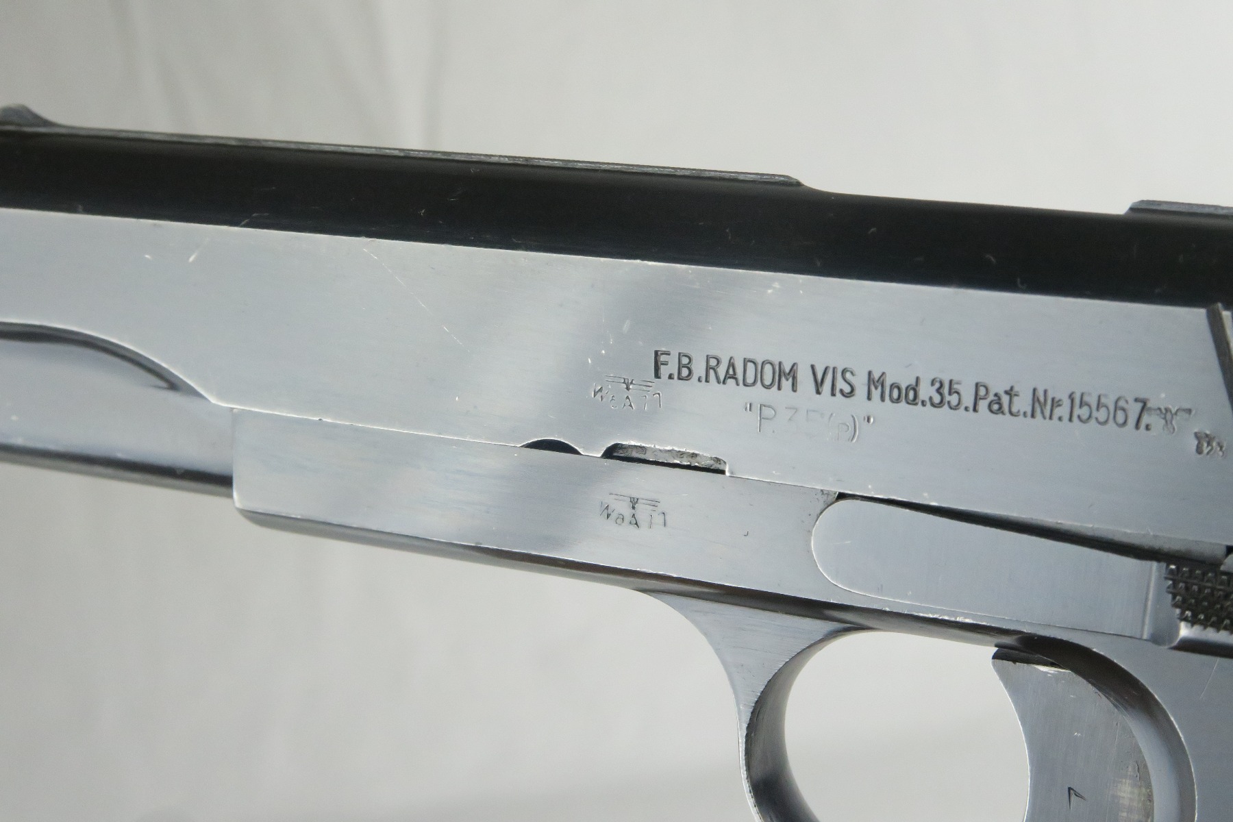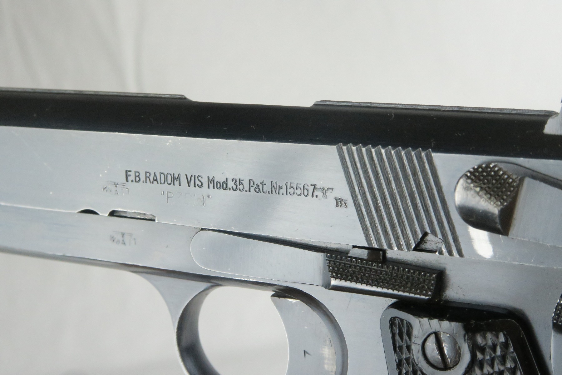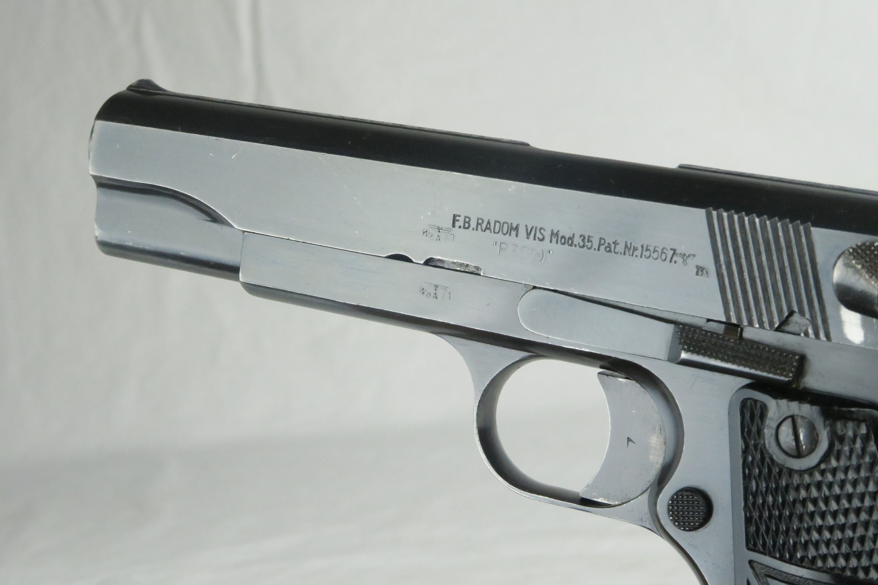 12/20/17 – This is a near-mint Radom vis 35, in all original condition. It is the early slotted variation – a grade I, subvariation 3 pistol, with disassembly lever and stock slot. The serial range for these pistols indicates about 47,000 were produced, and the serial puts this one on the earlier end of that range. The finish is about 98+%, with just very minor muzzle wear and some wear in the stock slot. Excellent waffen marked magazine, and very nice grips that are correct for this variation. Fantastic bore.