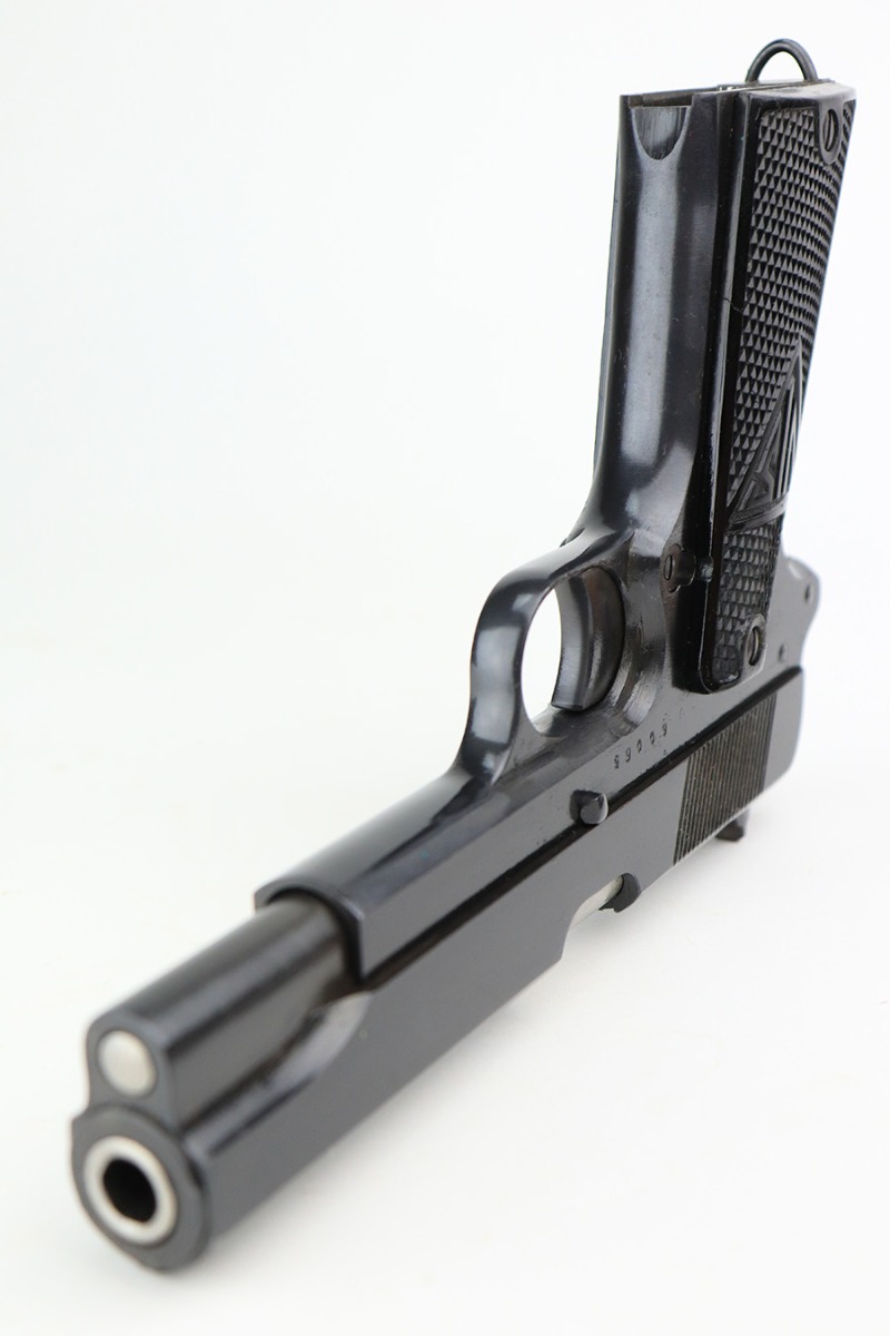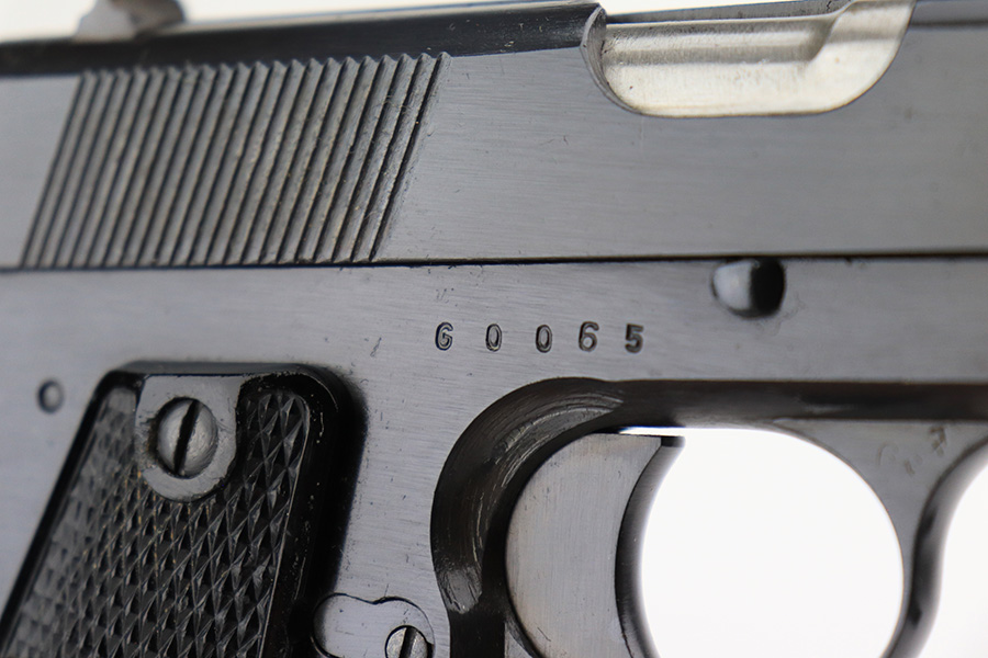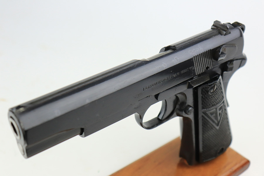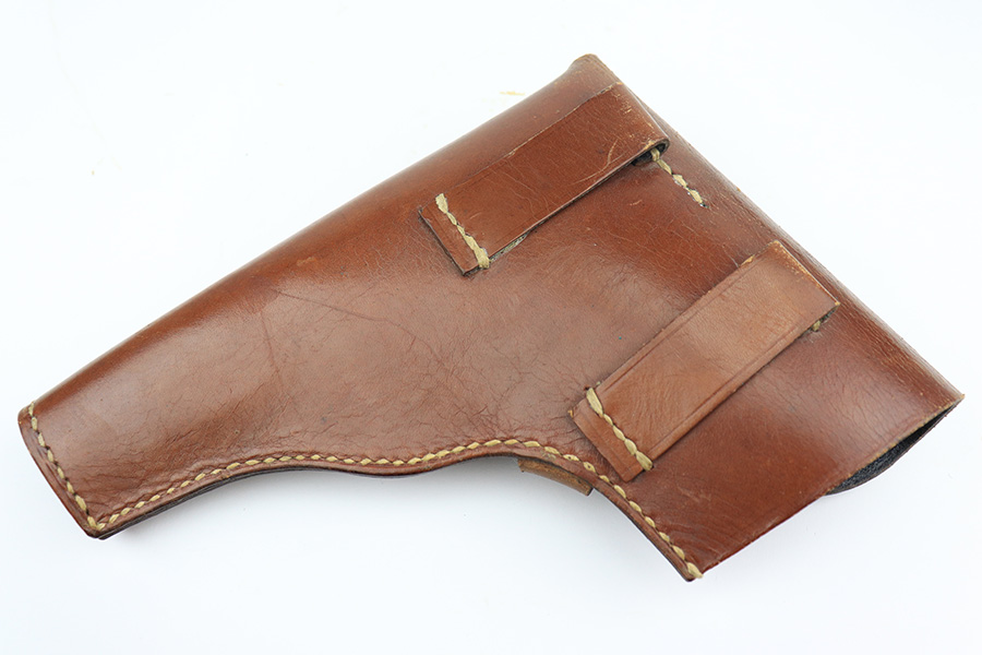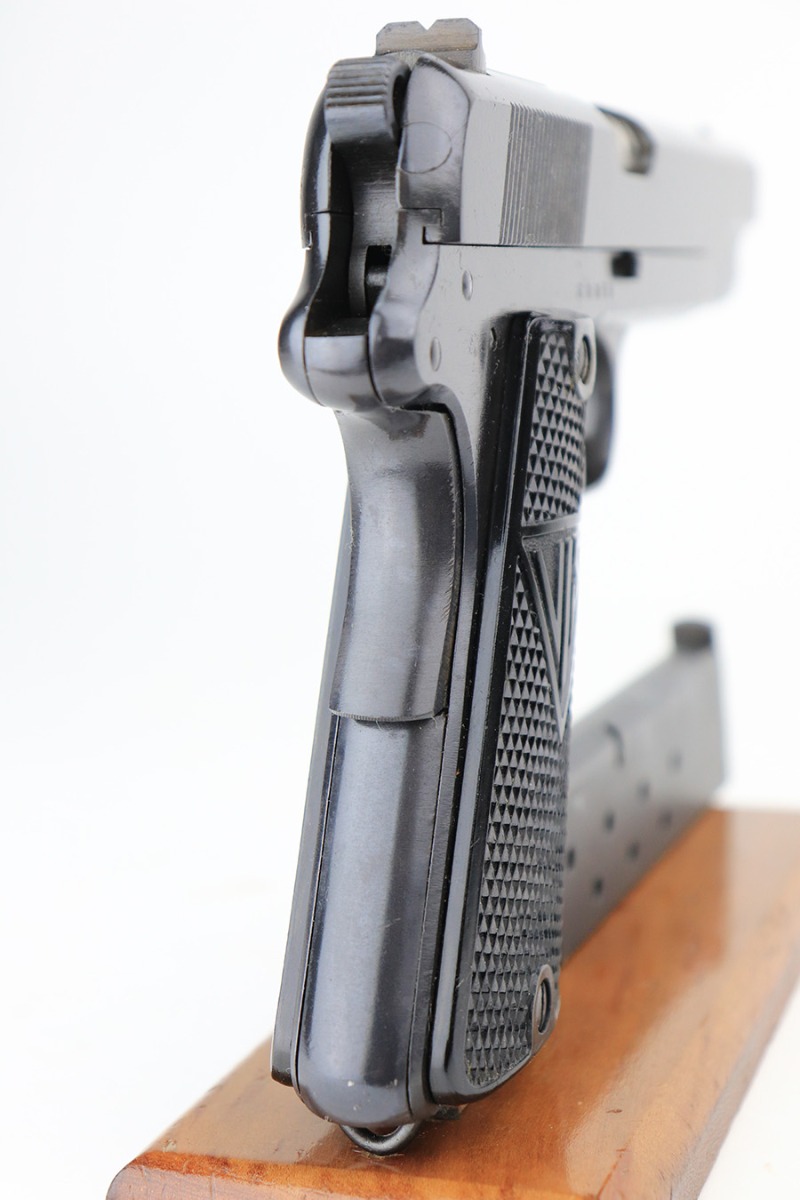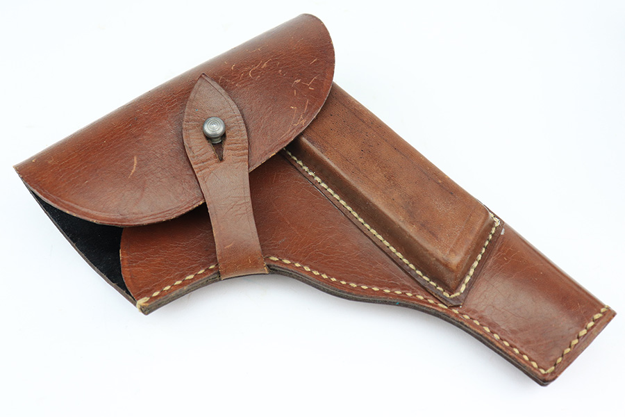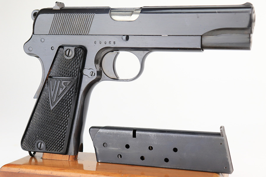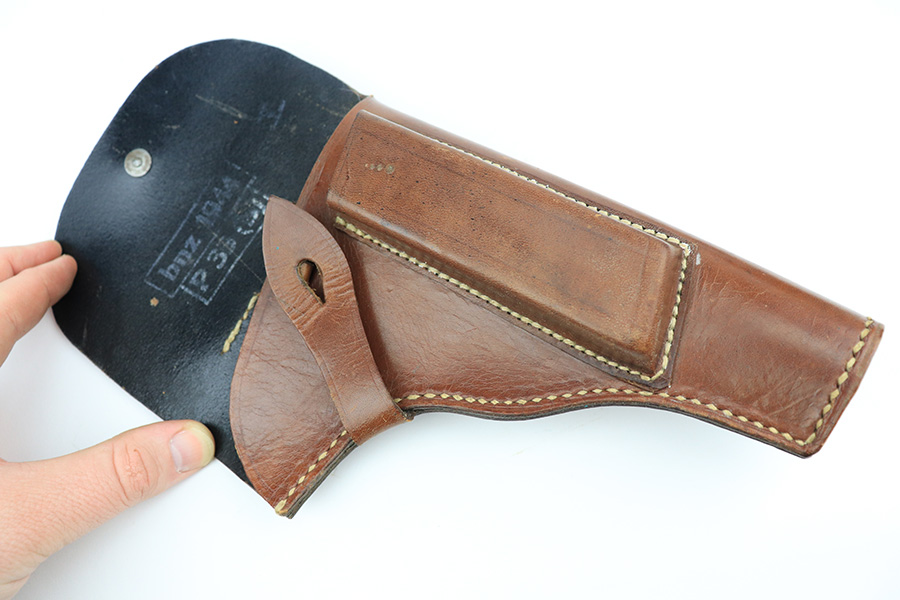 5/19/22 – This is a stunning example of a Radom VIS 35 issued to the Nazi military during WW2. This particular gun is of the earlier 3-lever variation – no slot in the frame. It is all matching and has the proper “Eagle 77” and “Waffen 623” military acceptance proofs. It comes as a rig with two proper magazines and a 1944-dated holster in un-issued condition – visible ink stamp on the inside. The gun itself has retained virtually all of its bluing. There are just a few small dots of discoloration on the left side and top of the slide and and some very minor pin-pricking on the grip straps. Excellent period-correct black bakelite grips. The bore has strong rifling, but there are areas of pin-pricking.