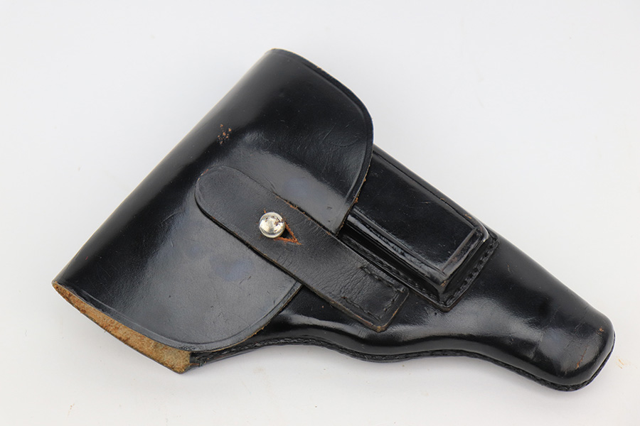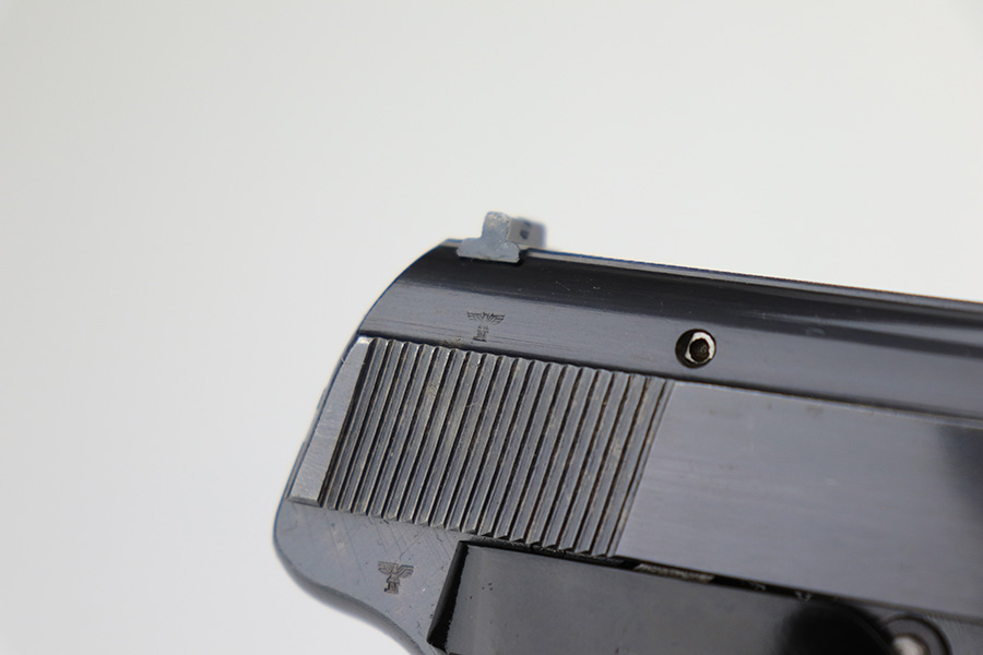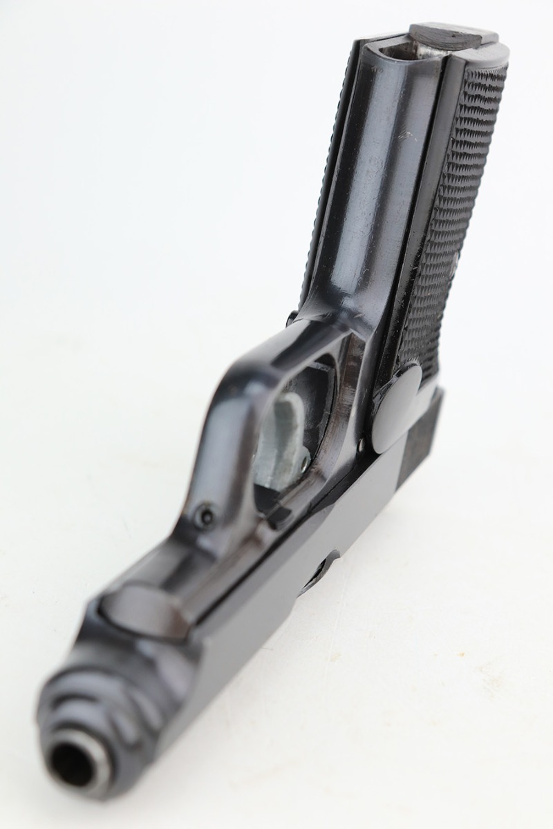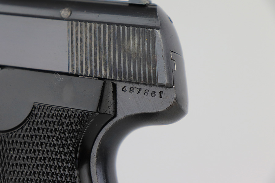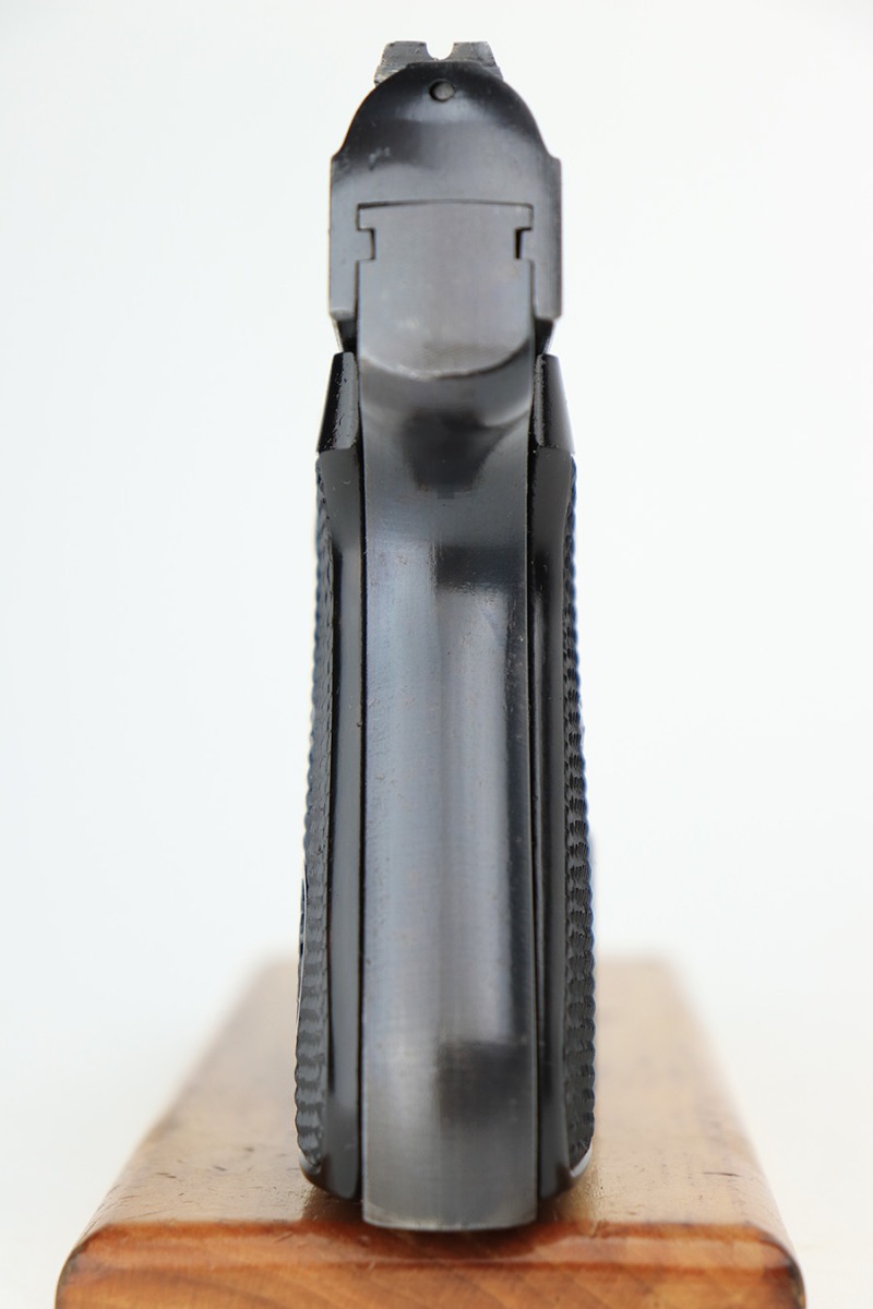 5/8/23 – This is a beautiful example of a Sauer 38h issued to the Nazi military during WW2. It is all matching and has the proper “Eagle 37” military acceptance proof on the trigger guard. It comes as a rig with a minty black leather holster and two proper magazines. The gun itself has retained nearly all of its original finish with just hints of wear on some of the high edges and a hint of freckling on the back strap. Excellent period-correct black bakelite grips – one tiny chip on the top edge of the left panel. Mint bore.