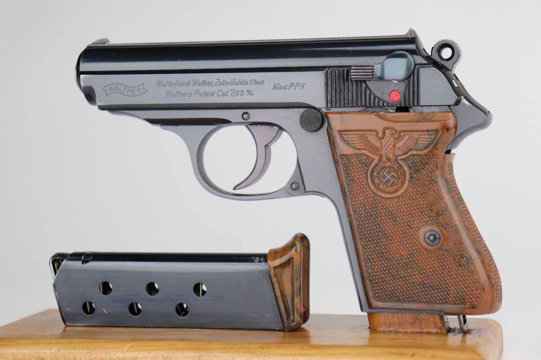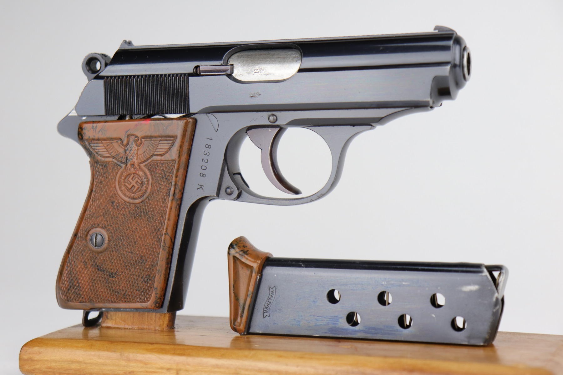 The Walther PPK with Party Leader Grips was the “Honor Weapon of the Political Leaders”. The Hoheitsabzeichen or High Insignia is the Eagle over Swastika found on either side of the grips where the Walther banner is normally located. The person entitled to wear the honor weapons that were awarded them by the Fuhrer were the Political Leaders of the national, regional and district territories, as well as leaders of local and support units. The persons who wore the honor weapon had their authorizations listed in the district personnel offices, and had to have in their possession a weapons permit issued by the police, which was obtained through official channels. These rare pistols were estimated to number around 3,500, and are widely faked, but this one is guaranteed original.