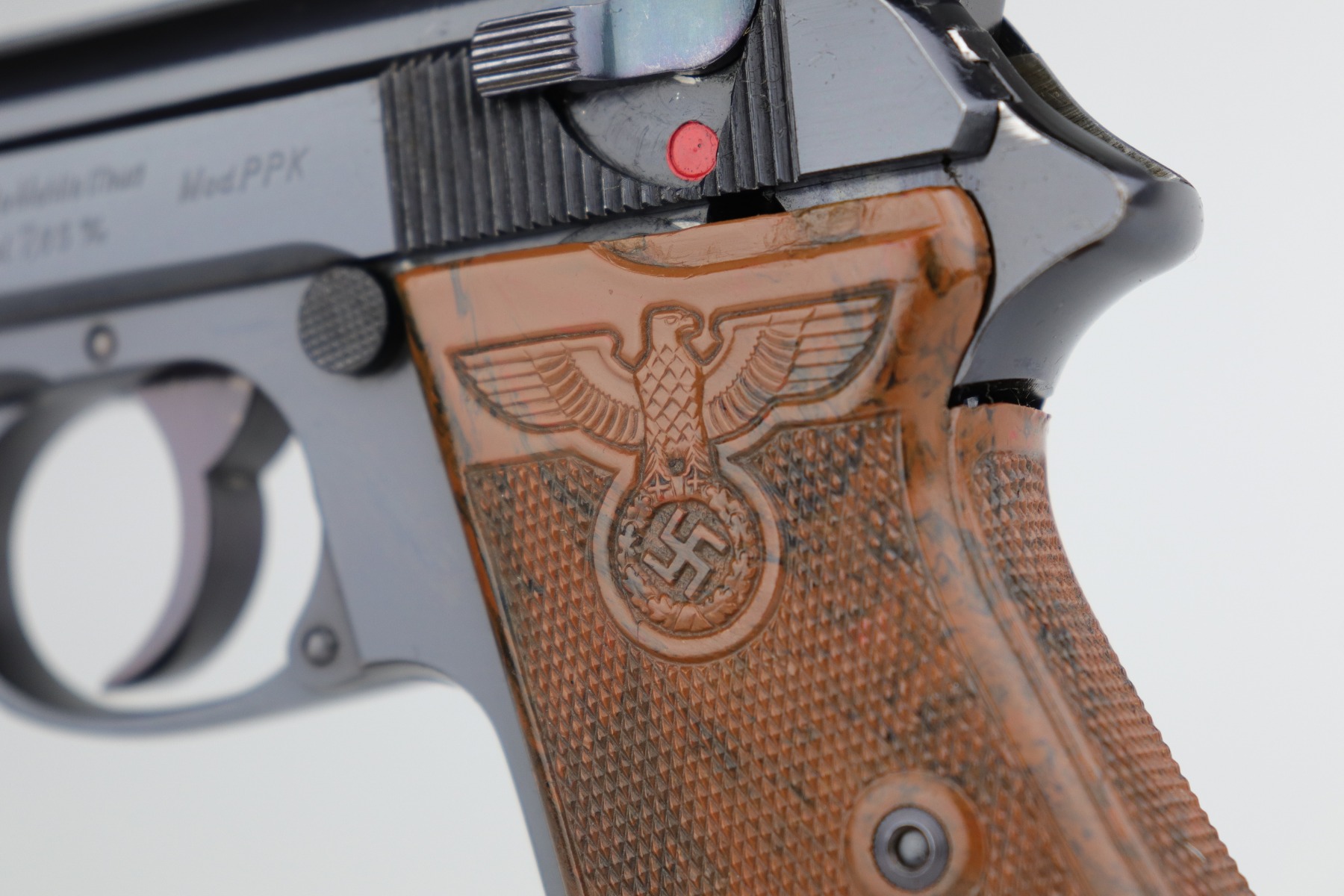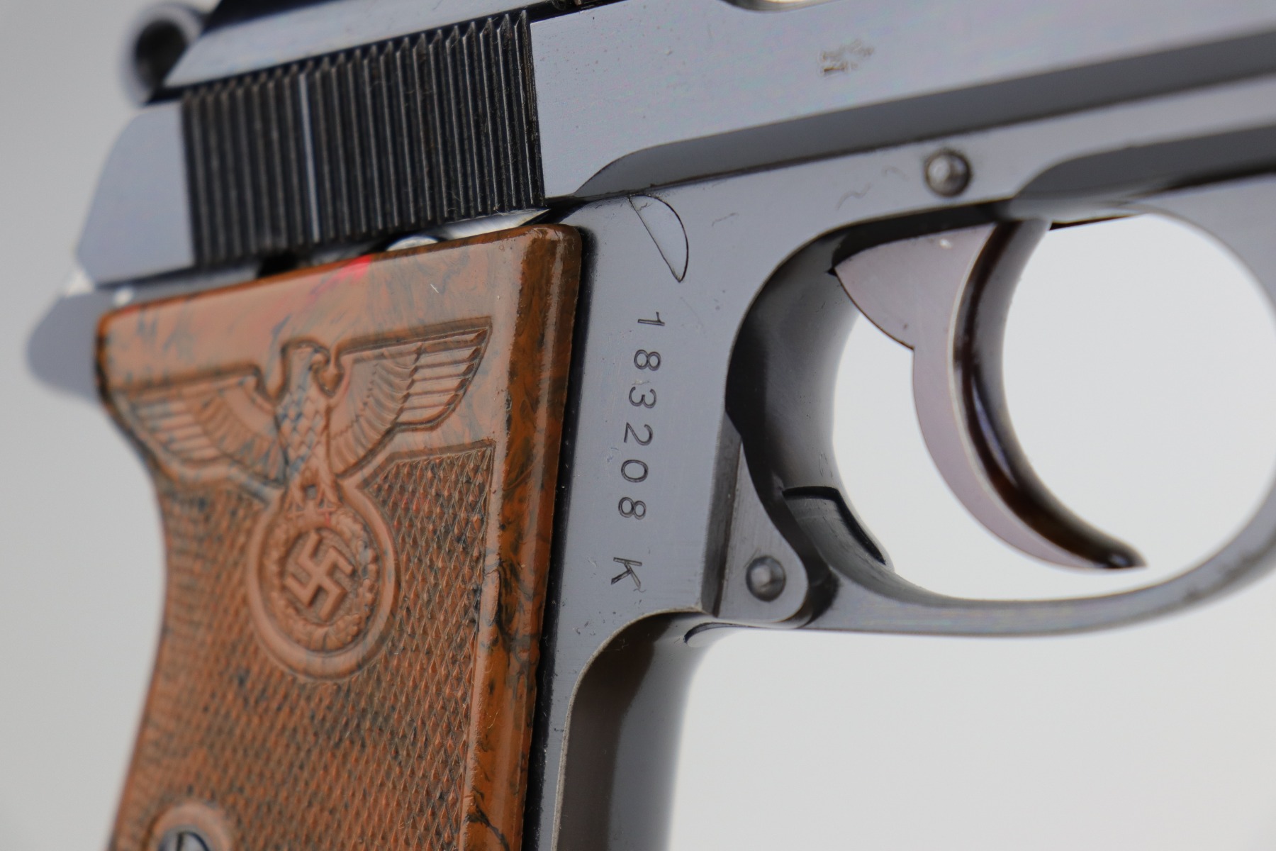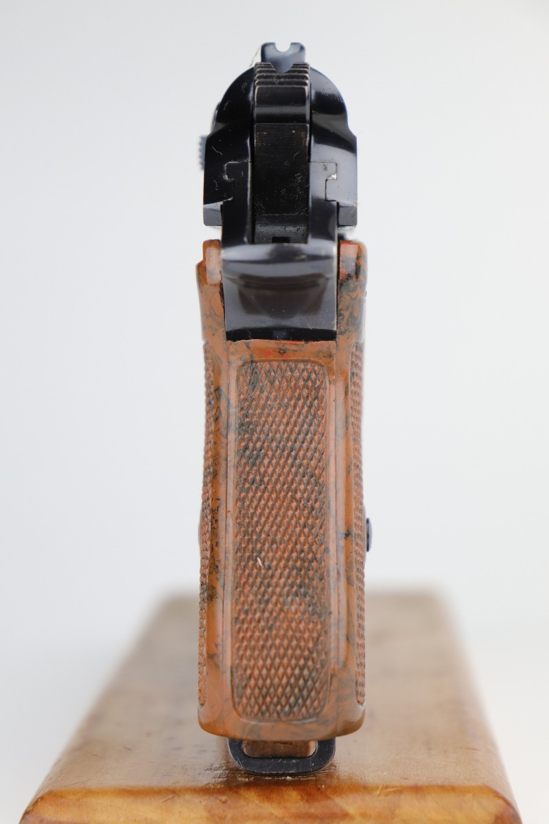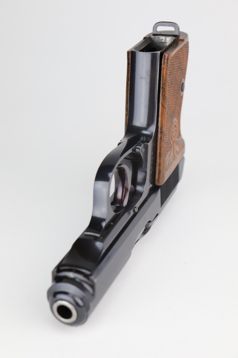 12/14/20 – This is a beautiful and rare Party Leader Walther PPK from the Nazi era. The gun has excellent original finish with just a tiny hint of wear around the muzzle and some of the high edges. There is one small area of tiny pin-pricking on the front strap and very light scratching above the safety lever. The serial dates it to 1939, and is in the correct range for the issuance of the Party Leader “Honor” Grip. The grip is in excellent condition with a gorgeous color swirl. There a few very small scuffs on the left side from the safety lever. Mint bore.