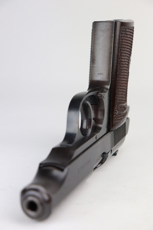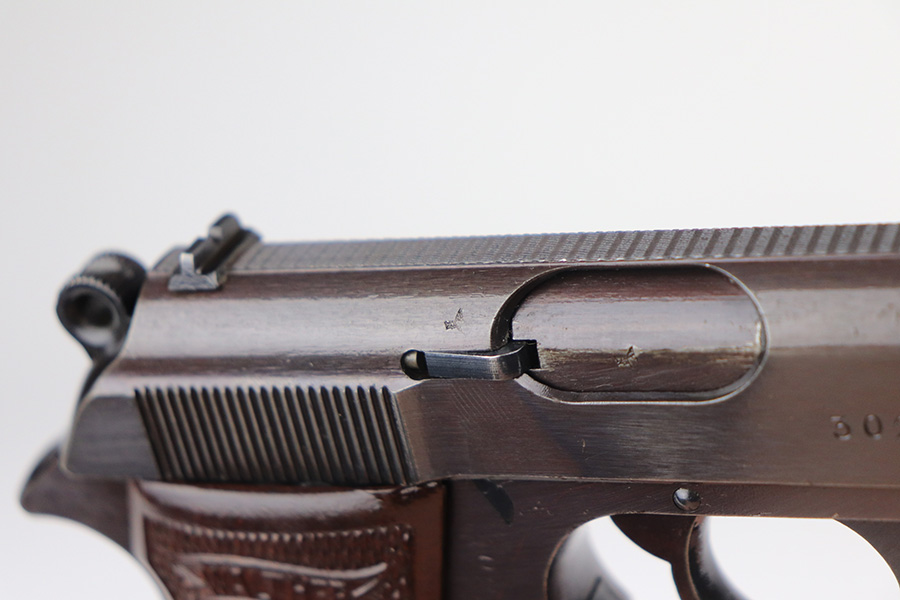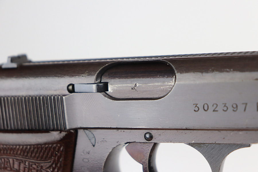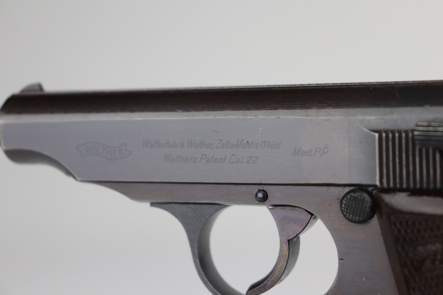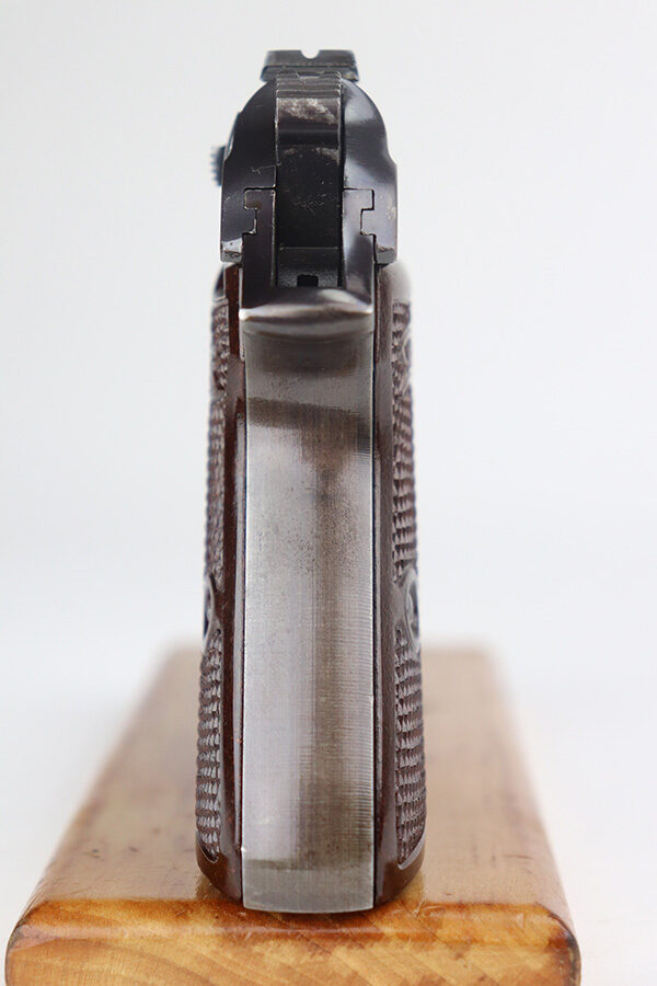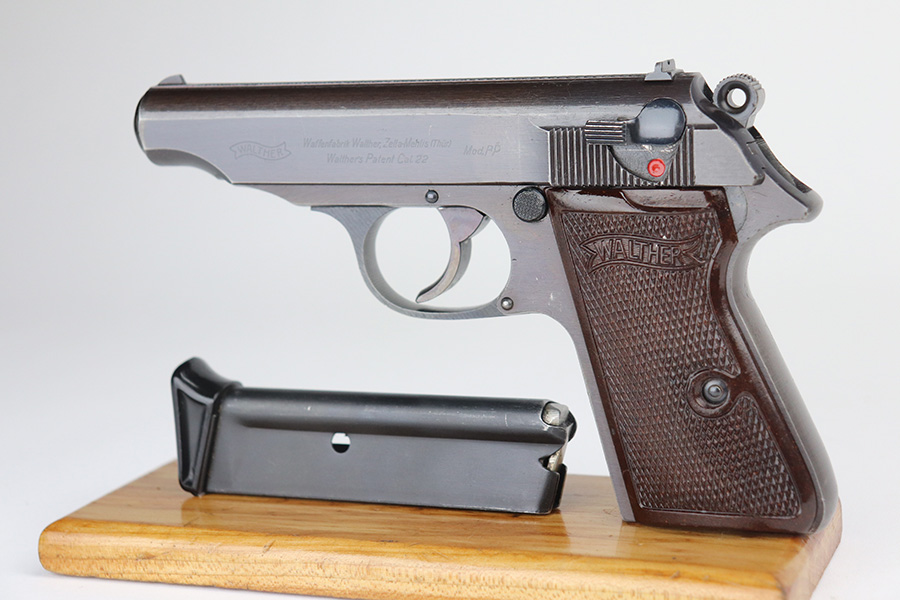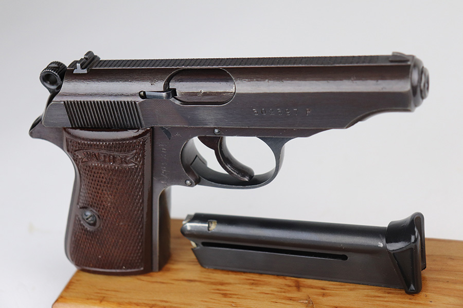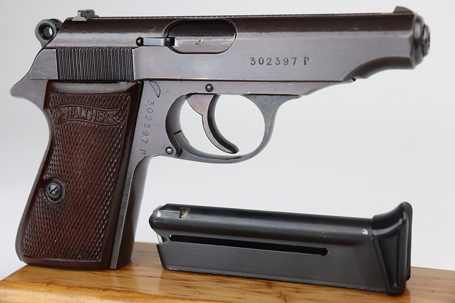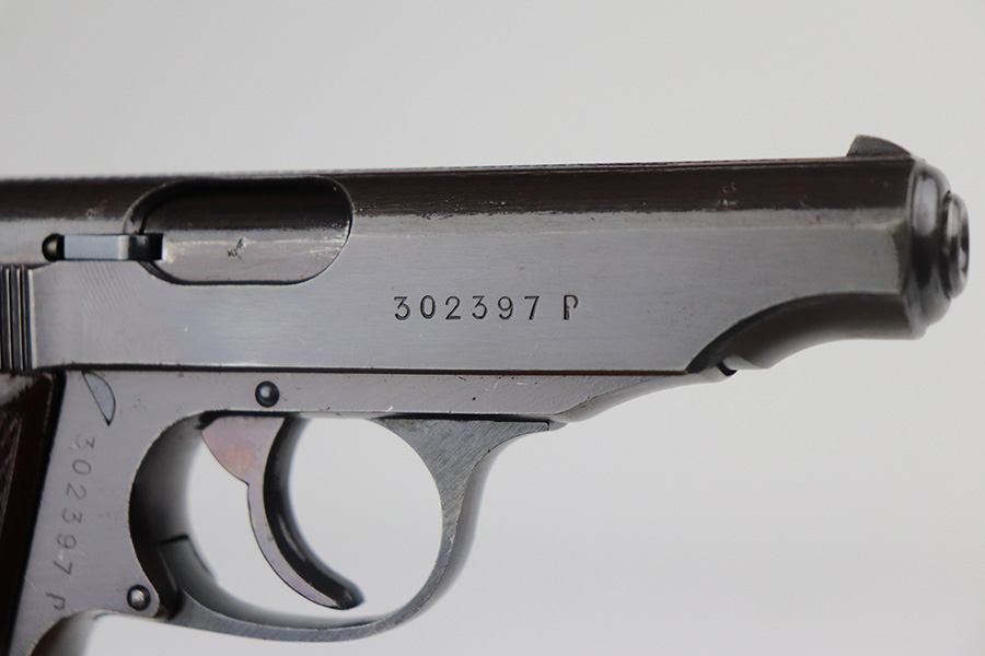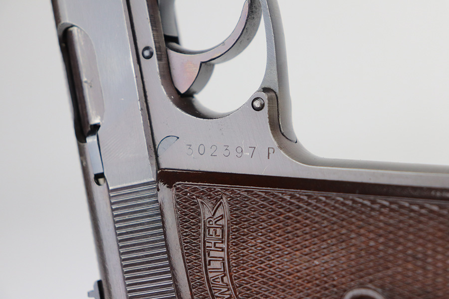6/23/21 – This is an excellent example of a .22 caliber Walther PP sold in the commercial market in 1943. The gun is all matching and has the proper “Eagle N” commercial proofs. This one has a beautiful plumb-colored finish. It is complemented really well with a set of rare red Walther grips. It also comes with a period-correct black finger extension .22 caliber magazine. It has retained about 96-97% of its finish with very minor thinning and patina on the straps and hints of wear on the high edges and around the muzzle. A few very minor scratches here and there. Mint bore.