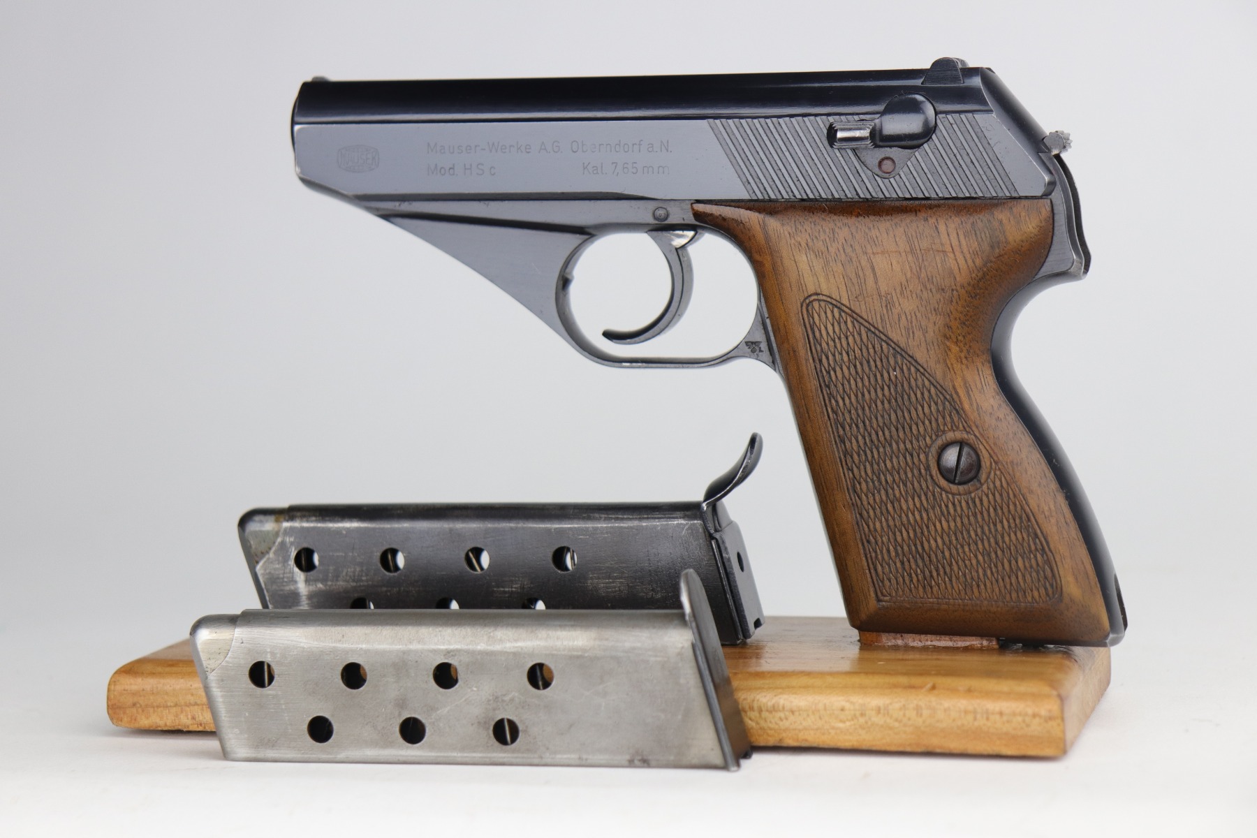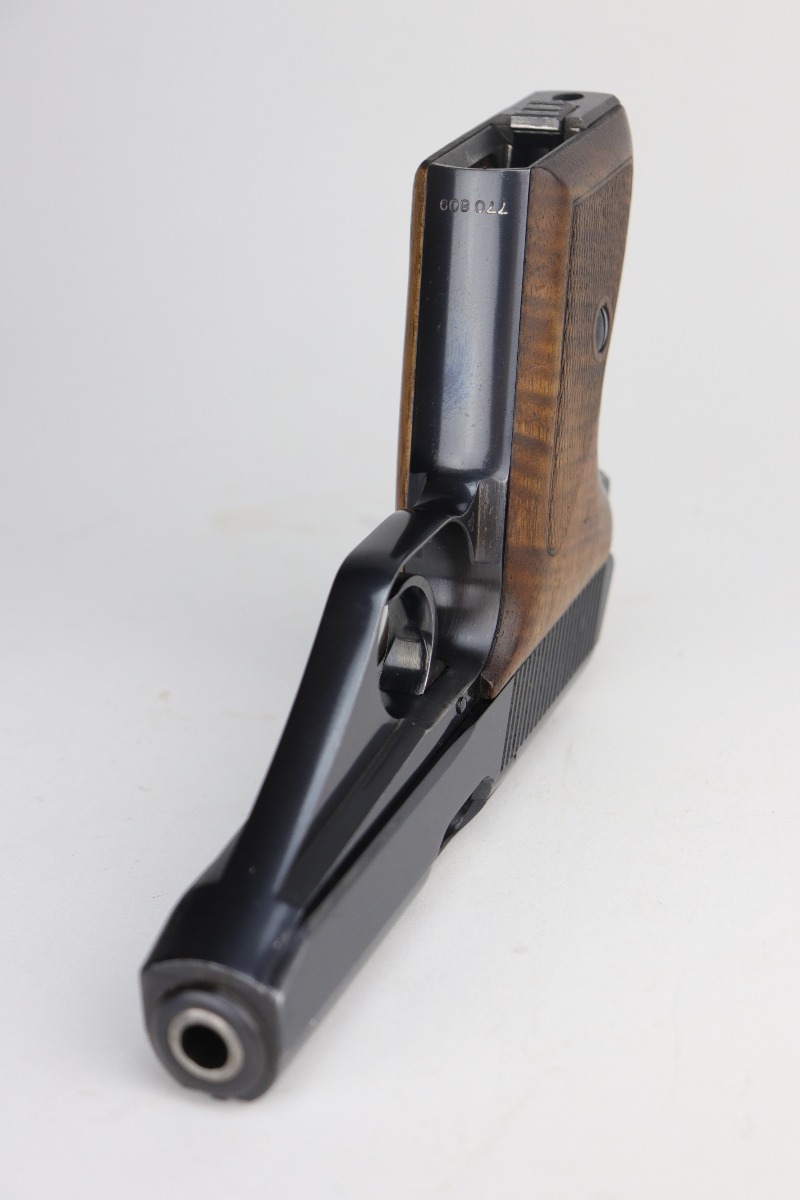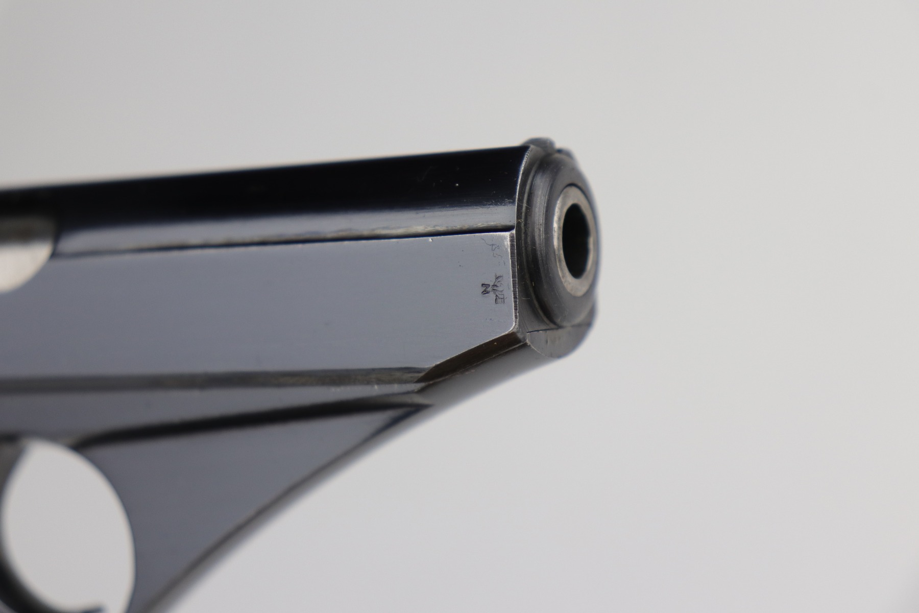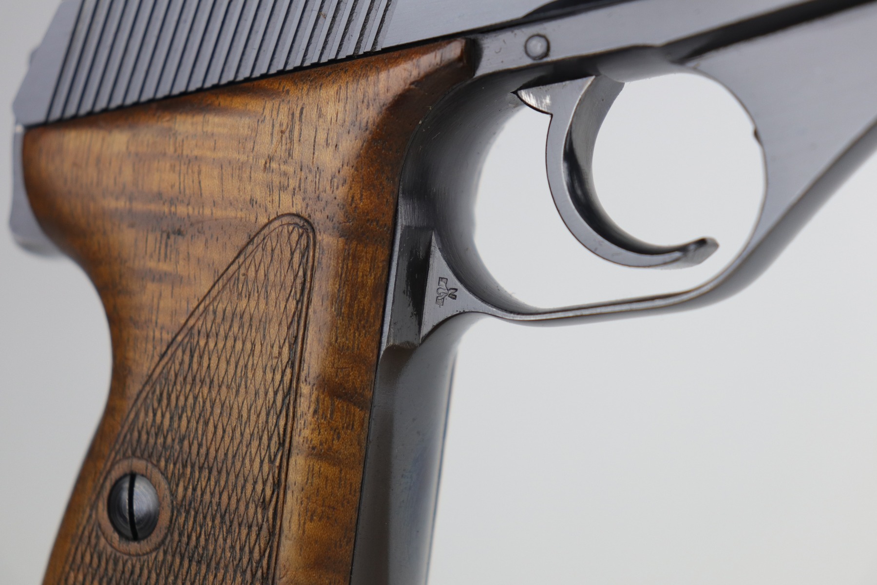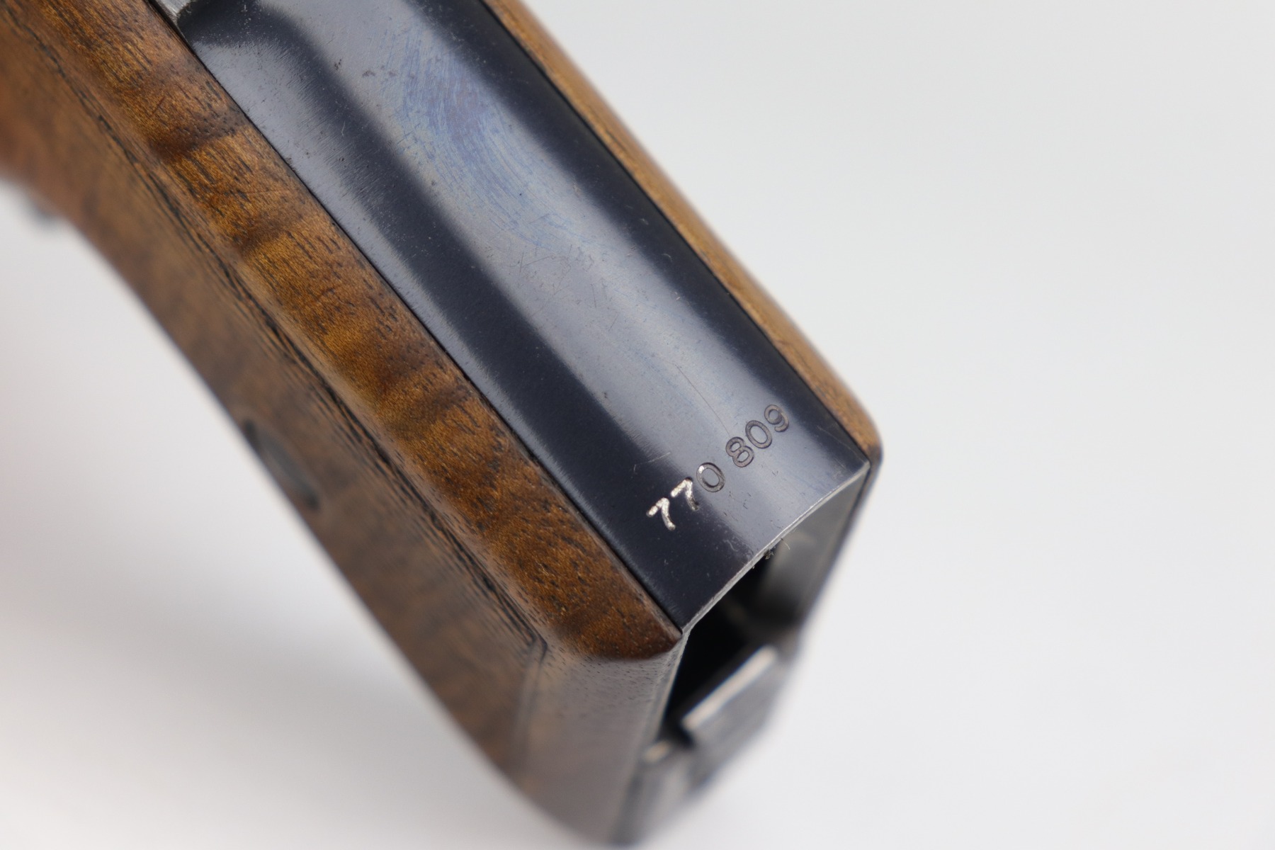 9/4/20 – This is a beautiful example of a Mauser HSC rig issued to the Nazi Police force in 1942. The rig comes with an original waffenamt holster and two magazines. The gun has the proper “Eagle N” proofs and has an “Eagle L” police proof on the trigger guard. Overall, the gun is in minty condition, retaining a little over 98% of its original finish. The only sign of use is very minor muzzle wear and minor high edge wear on the tang and very bottom of the back strap. There are really small handling marks here and there on the straps as well. Excellent bore – shiny with strong rifling. Minty, period-correct grips. The holster is in very nice condition except for a few handling marks and light cracking in the leather here and there. It is maker-marked, dated 1941, waffenamt, and has a Mauser ink stamp on the inside. The rig also comes with two magazines. One is completely correct. The other has a period-correct tube and a post-war finger extension.