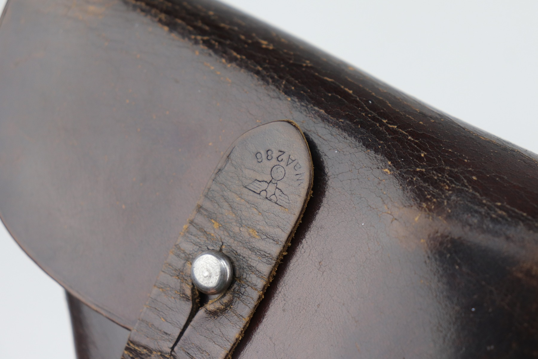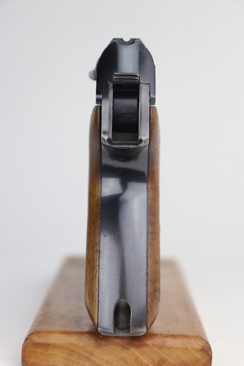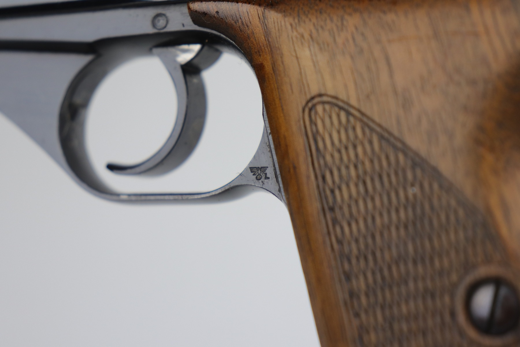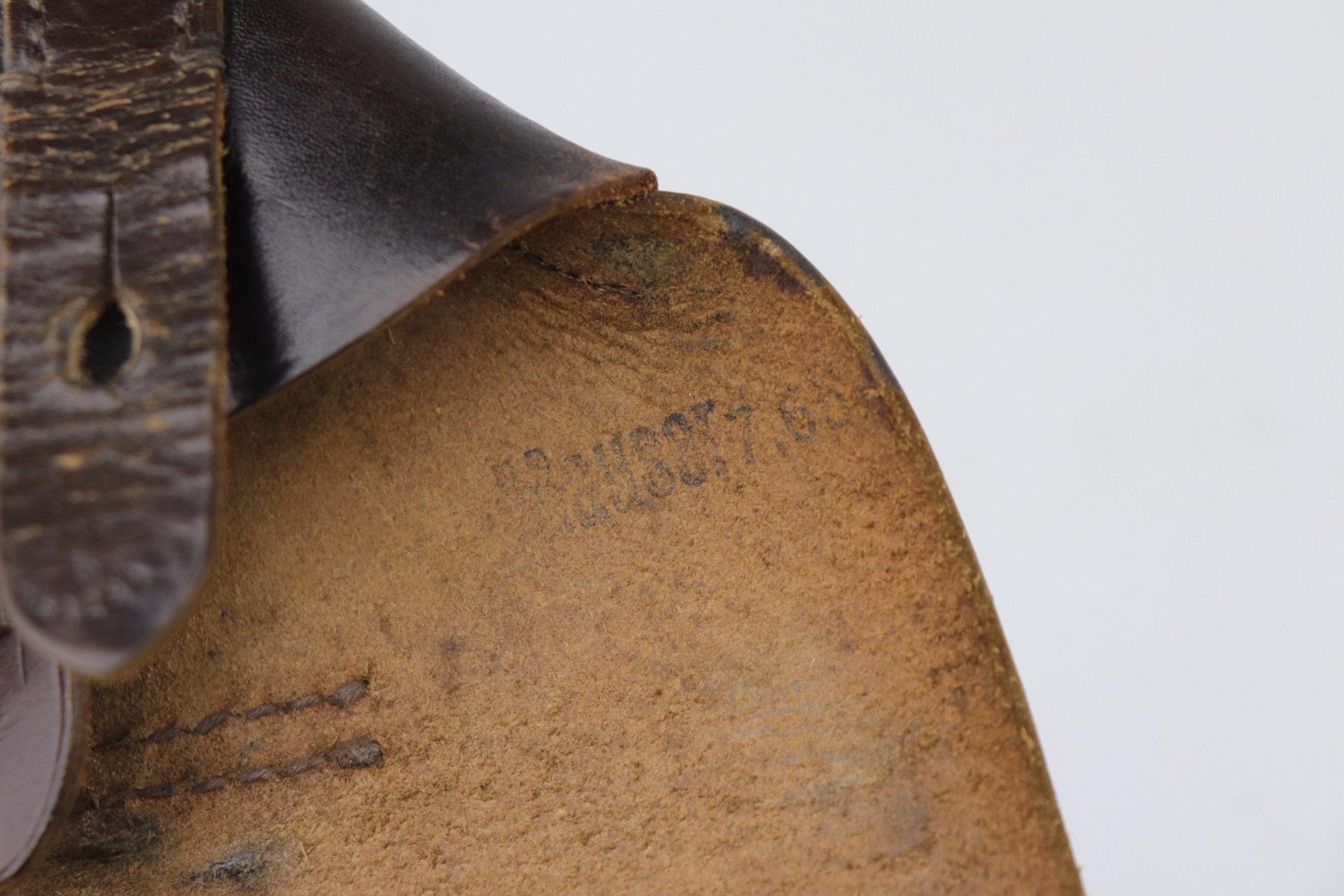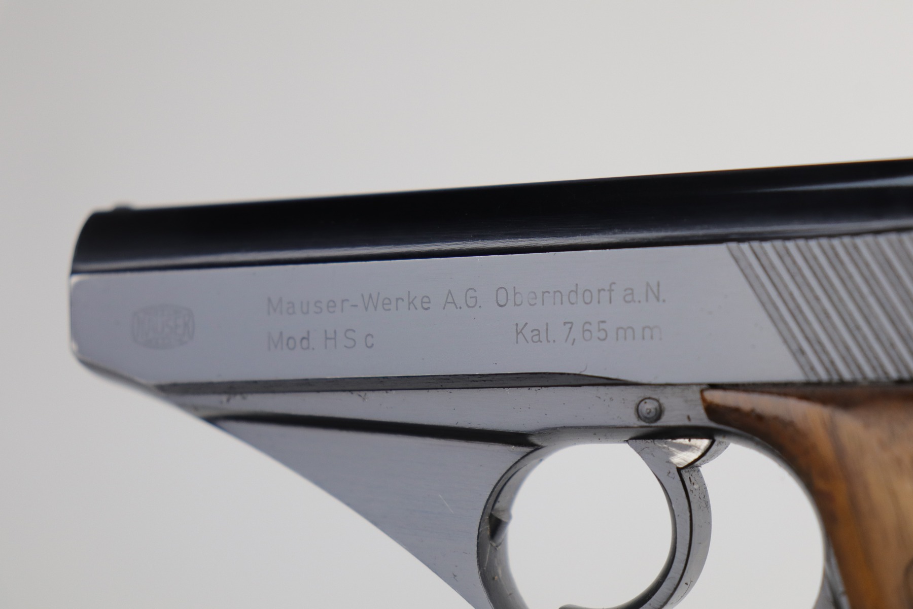 9/4/20 – This is a beautiful example of a Mauser HSC rig issued to the Nazi Police force in 1942. The rig comes with an original waffenamt holster and two magazines. The gun has the proper “Eagle N” proofs and has an “Eagle L” police proof on the trigger guard. Overall, the gun is in minty condition, retaining a little over 98% of its original finish. The only sign of use is very minor muzzle wear and minor high edge wear on the tang and very bottom of the back strap. There are really small handling marks here and there on the straps as well. Excellent bore – shiny with strong rifling. Minty, period-correct grips. The holster is in very nice condition except for a few handling marks and light cracking in the leather here and there. It is maker-marked, dated 1941, waffenamt, and has a Mauser ink stamp on the inside. The rig also comes with two magazines. One is completely correct. The other has a period-correct tube and a post-war finger extension.