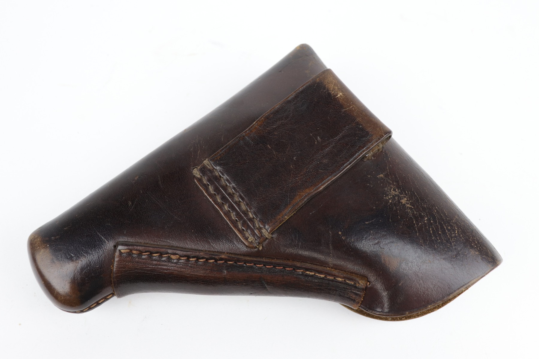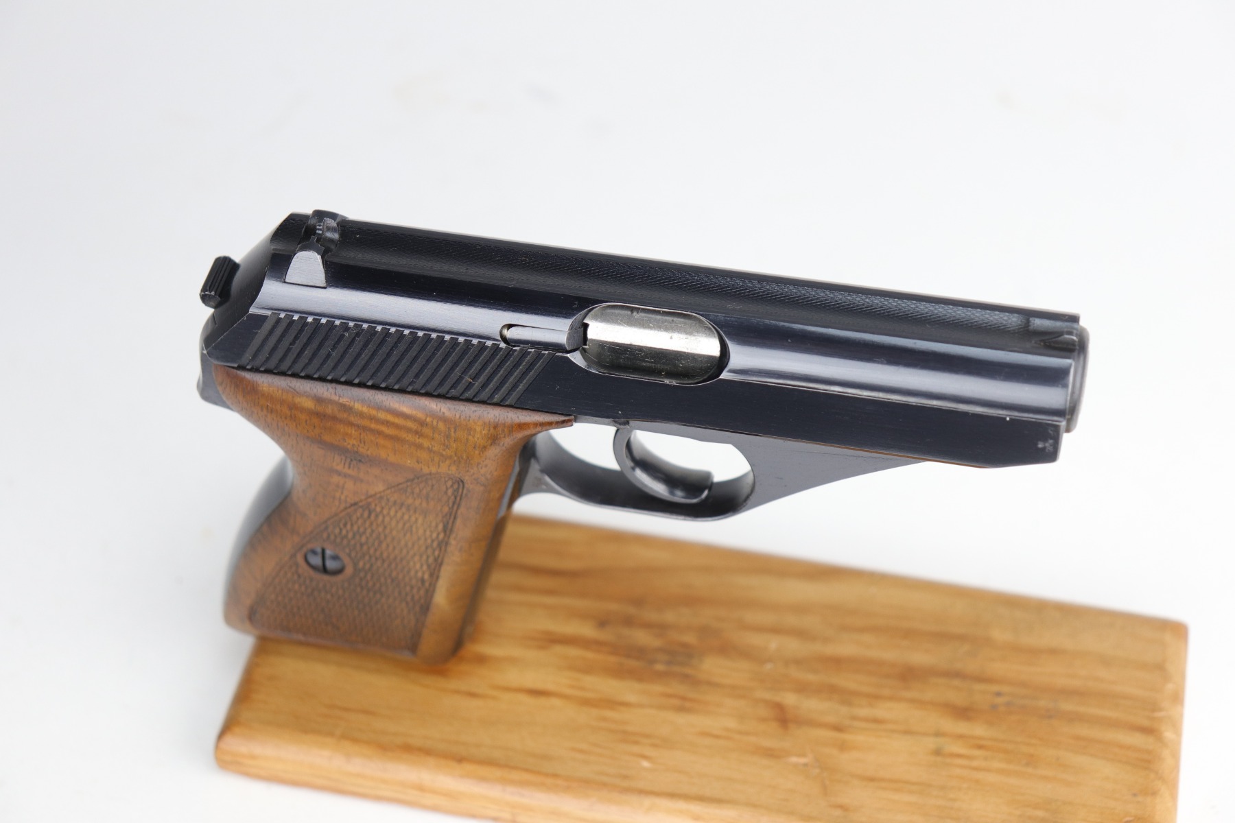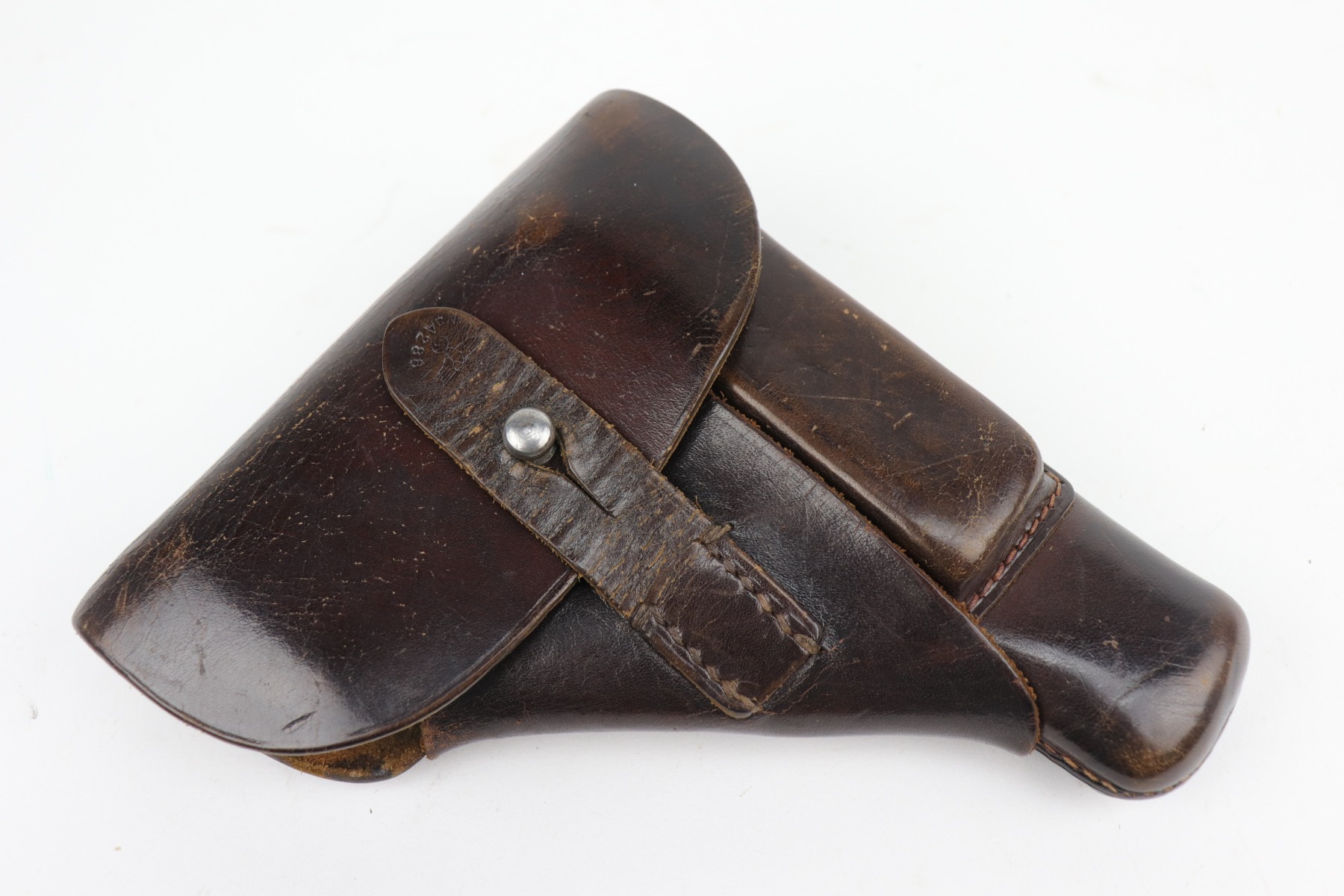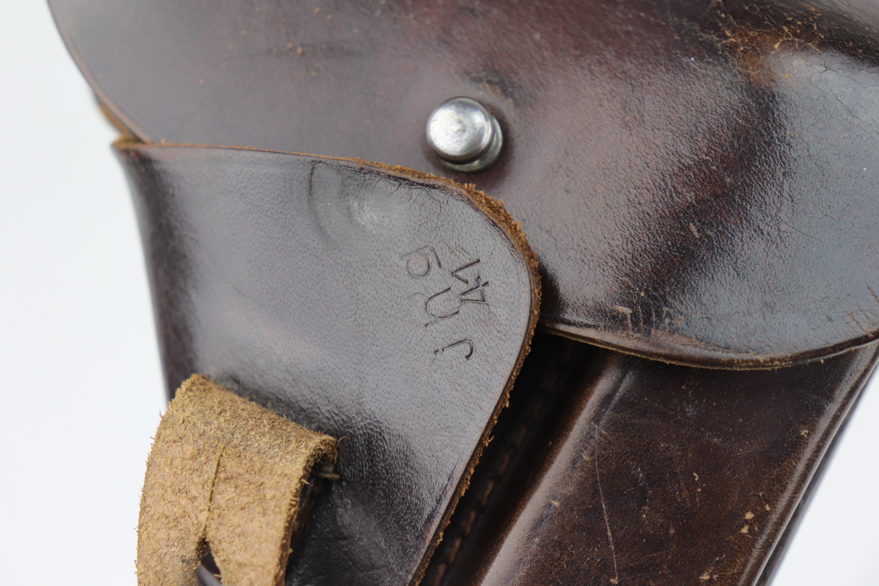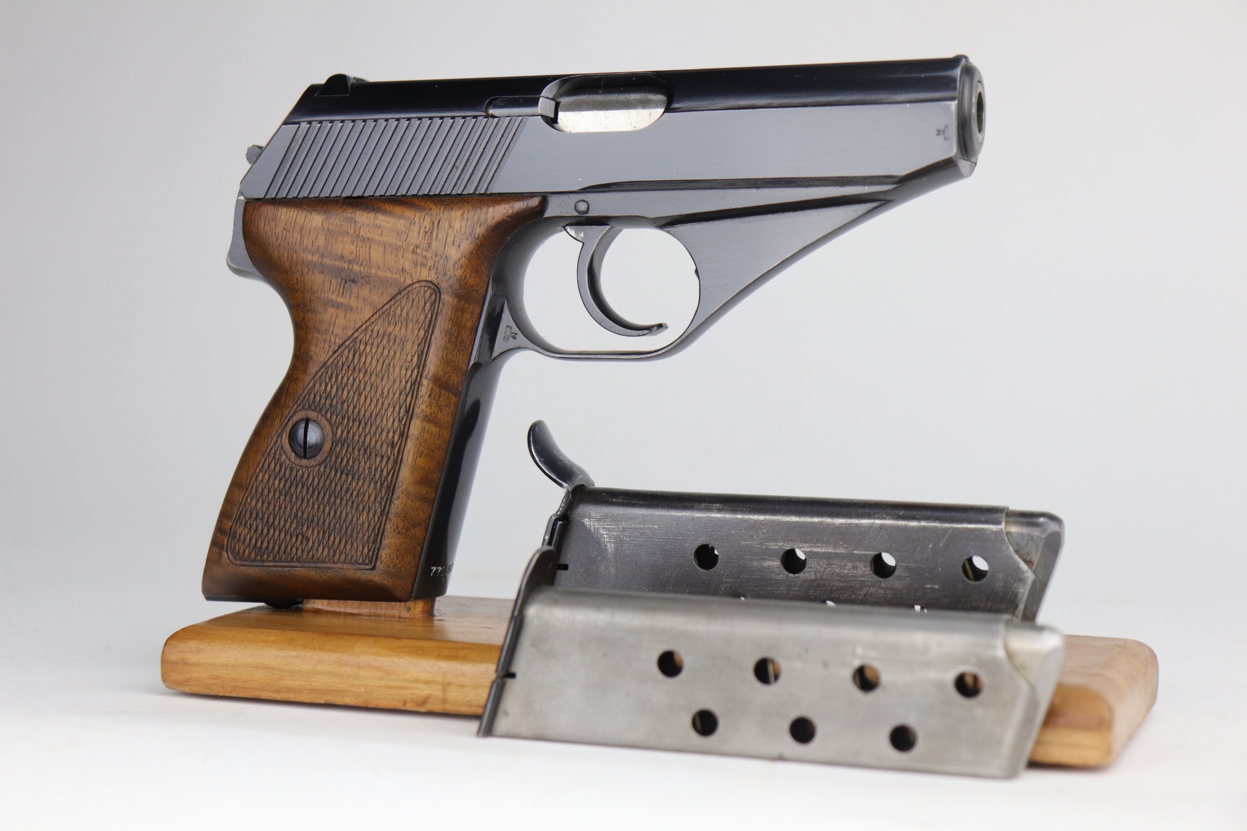 9/4/20 – This is a beautiful example of a Mauser HSC rig issued to the Nazi Police force in 1942. The rig comes with an original waffenamt holster and two magazines. The gun has the proper “Eagle N” proofs and has an “Eagle L” police proof on the trigger guard. Overall, the gun is in minty condition, retaining a little over 98% of its original finish. The only sign of use is very minor muzzle wear and minor high edge wear on the tang and very bottom of the back strap. There are really small handling marks here and there on the straps as well. Excellent bore – shiny with strong rifling. Minty, period-correct grips. The holster is in very nice condition except for a few handling marks and light cracking in the leather here and there. It is maker-marked, dated 1941, waffenamt, and has a Mauser ink stamp on the inside. The rig also comes with two magazines. One is completely correct. The other has a period-correct tube and a post-war finger extension.