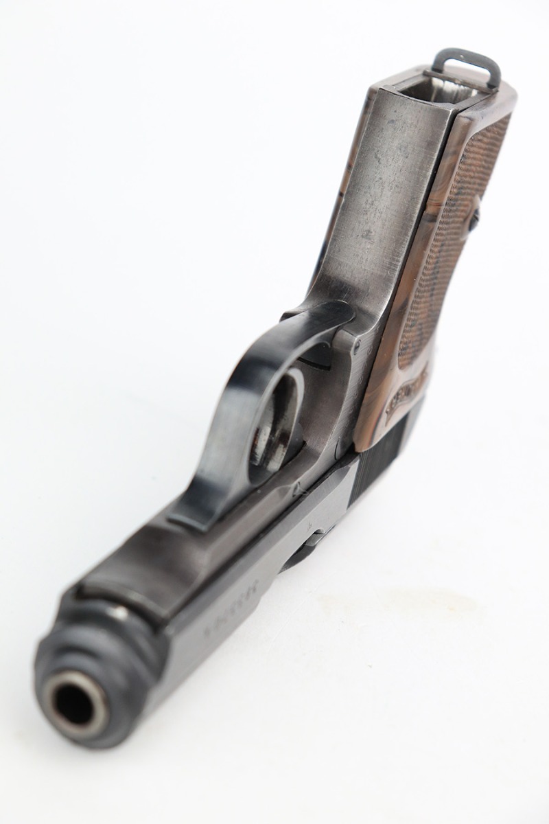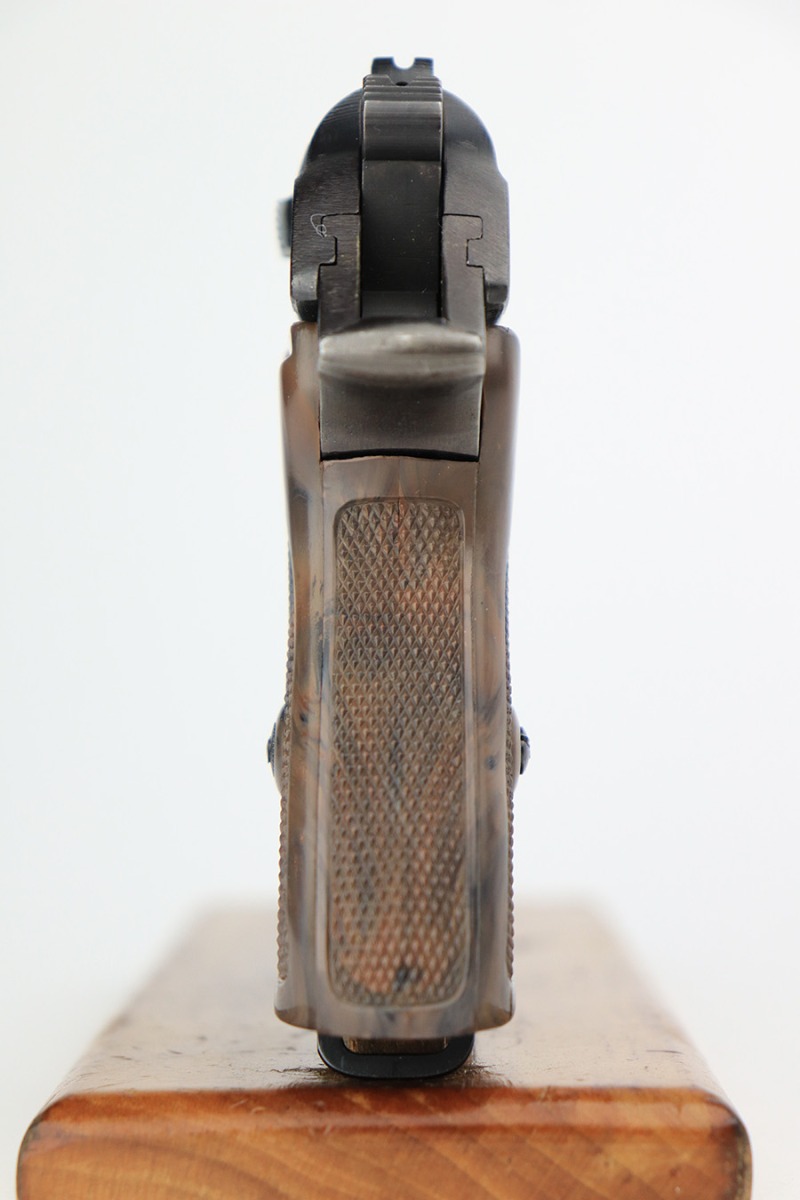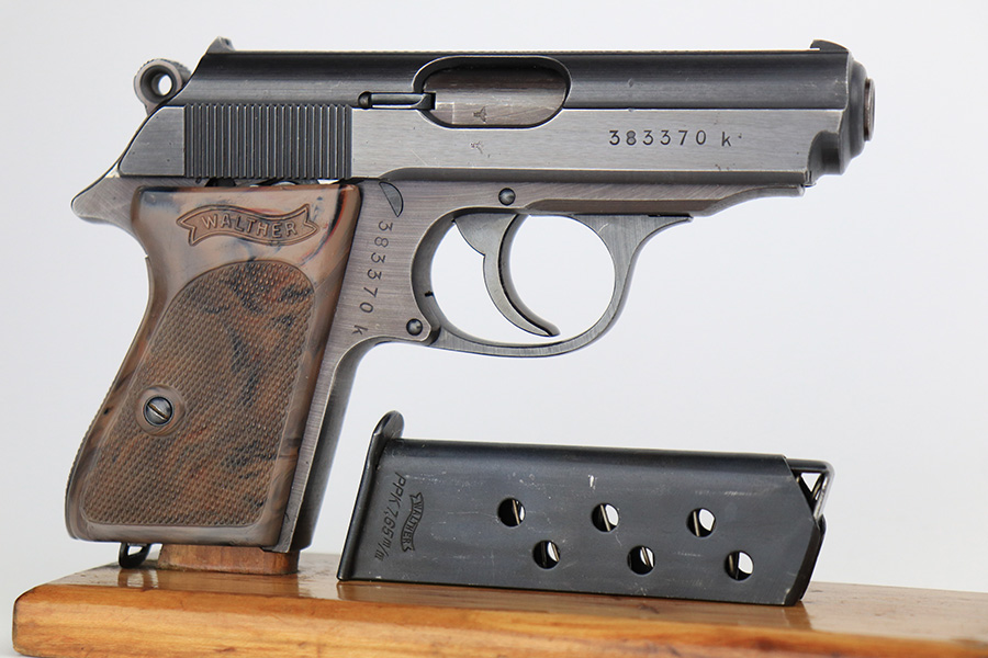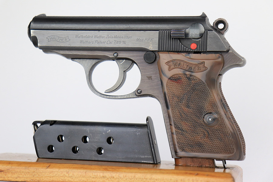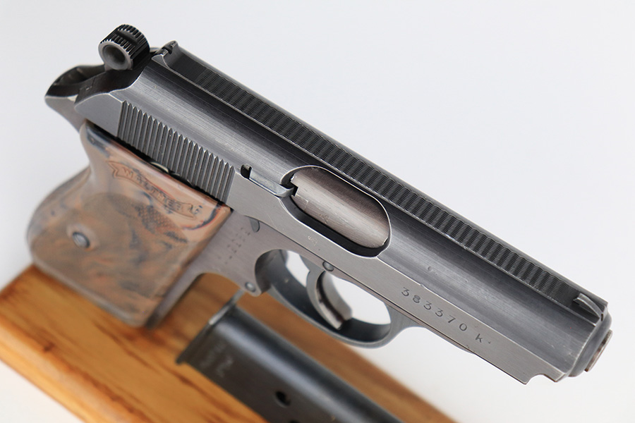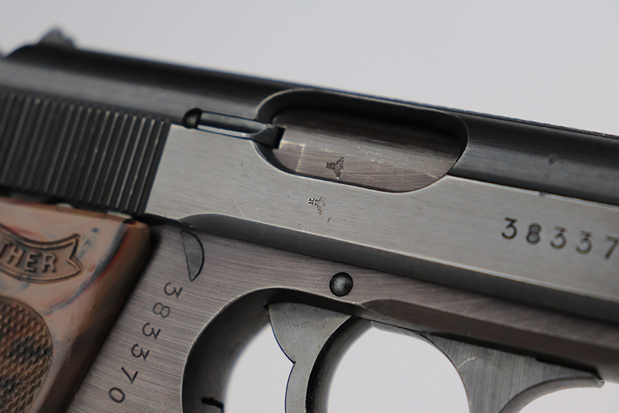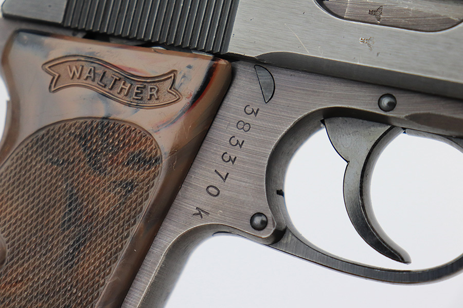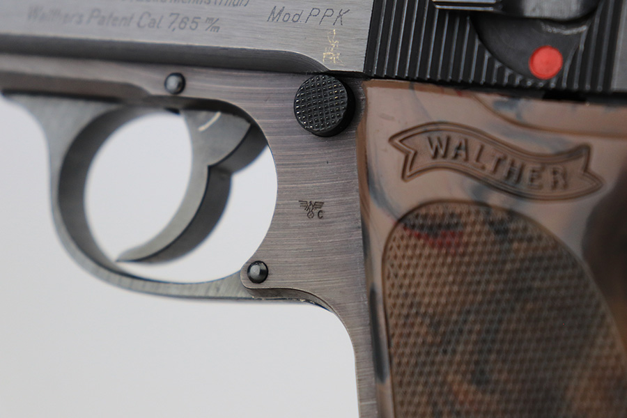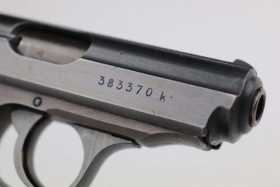 5/19/23 – This is a beautiful Walther PPK issued to the Nazi police force in 1943. It is all matching with the proper police “Eagle/C” marking on the left side of the trigger guard. The wartime finish on this gun has a really nice subtle plum tint to it and looks fantastic paired with its rosey-grey colored grip – excellent splashes of black and red marbling. Also comes with a minty period-correct wartime magazine. The gun itself has retained virtually all of its original finish with just the slightest hint of muzzle wear and a tiny scuff on the left side of the slide. The bore is factory-new.