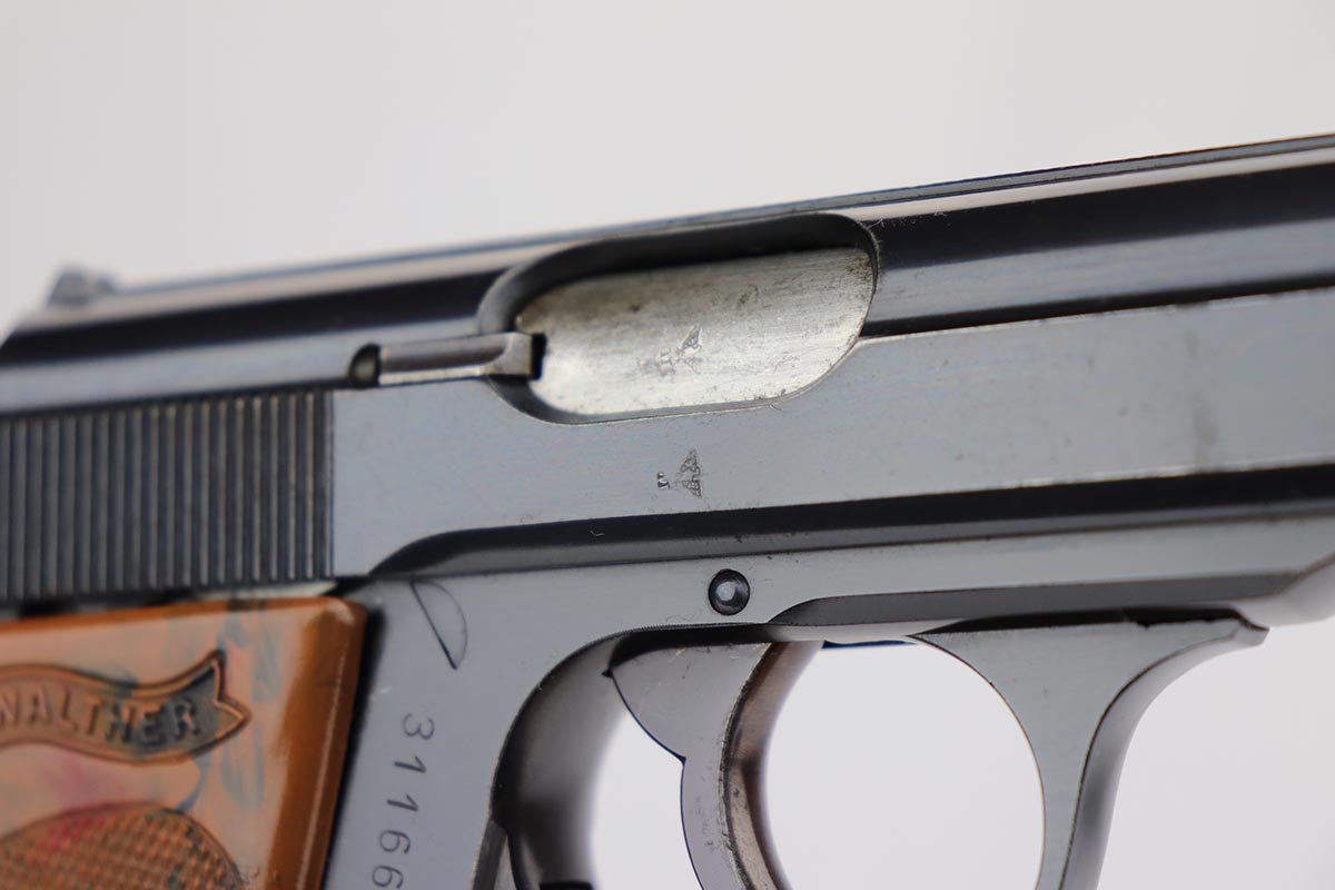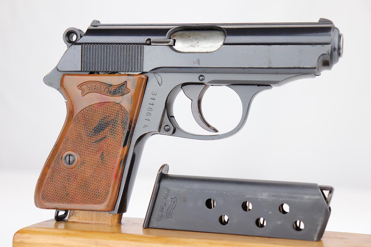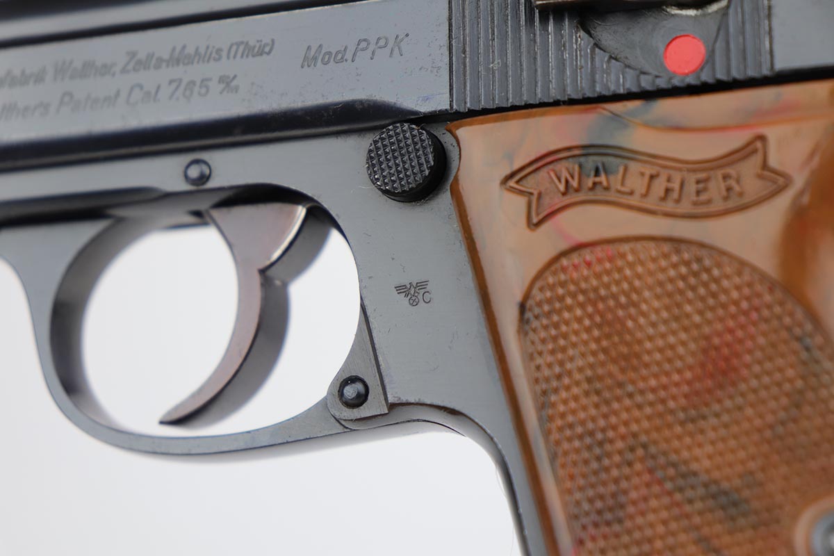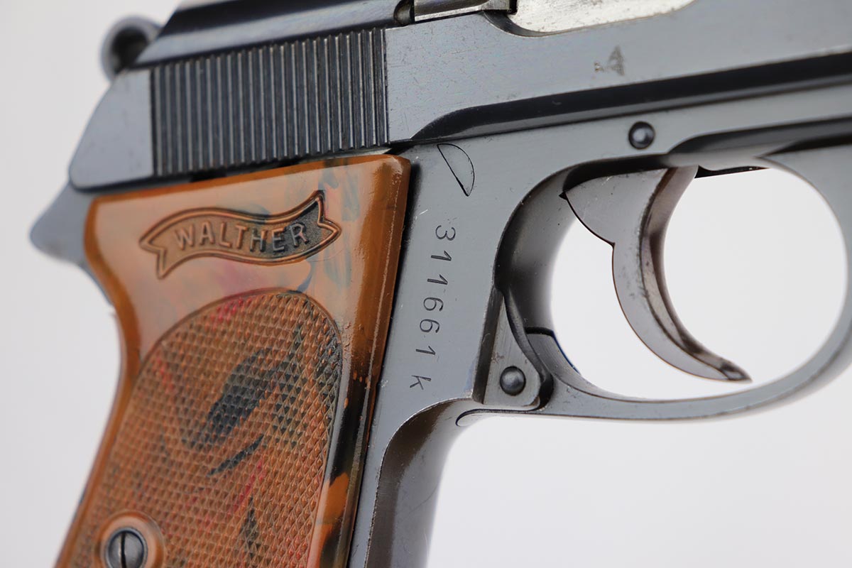 11/1/19 – This is an excellent Walther PPK that was manufactured in 1941 and issued to the German Police. The high-polish blue rates at 97-98% with minor muzzle and high edge wear but little bluing loss overall. There is some oxidation on the front strap and right side of the slide, and some pinpricking on the rear portion of the right side of the frame. Somewhat scarce example as it has Eagle/N proofs but high-polish bluing. Excellent grip with no cracks but a couple minor scratches on the left side. Minty bore. Wartime magazine.