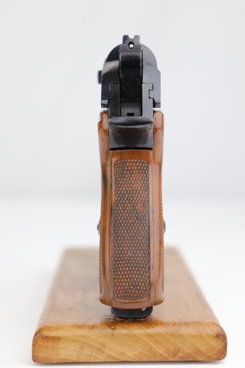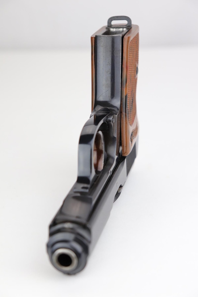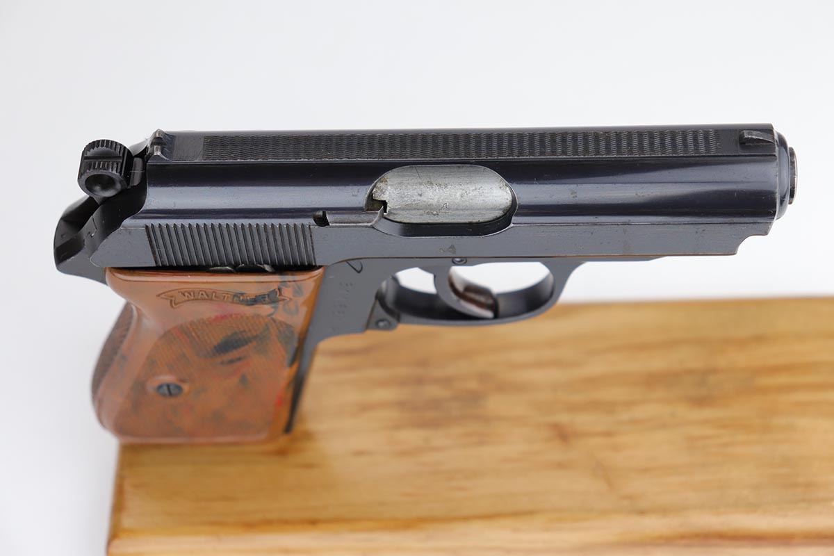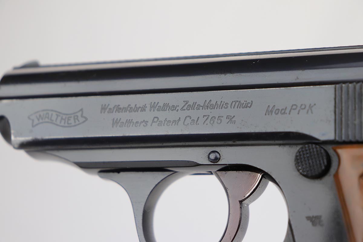 11/1/19 – This is an excellent Walther PPK that was manufactured in 1941 and issued to the German Police. The high-polish blue rates at 97-98% with minor muzzle and high edge wear but little bluing loss overall. There is some oxidation on the front strap and right side of the slide, and some pinpricking on the rear portion of the right side of the frame. Somewhat scarce example as it has Eagle/N proofs but high-polish bluing. Excellent grip with no cracks but a couple minor scratches on the left side. Minty bore. Wartime magazine.