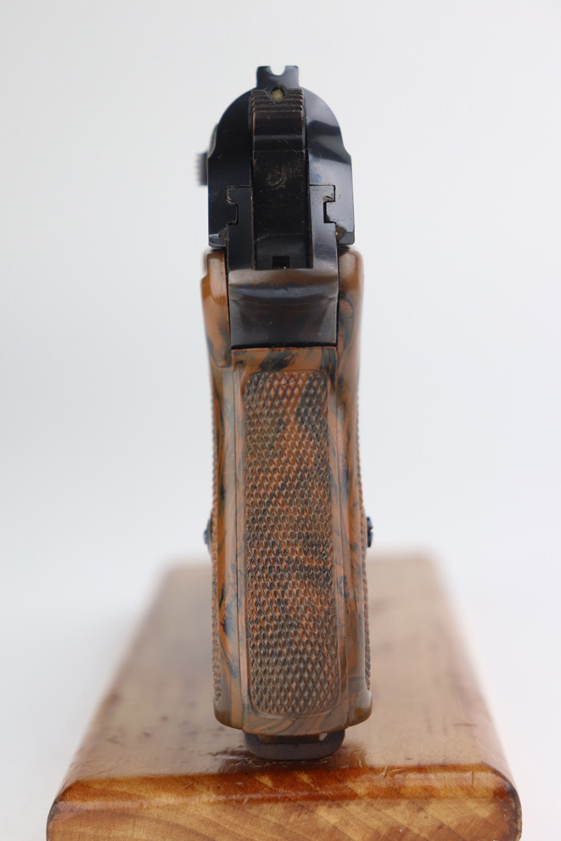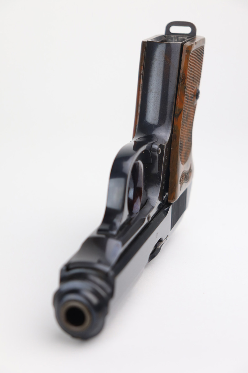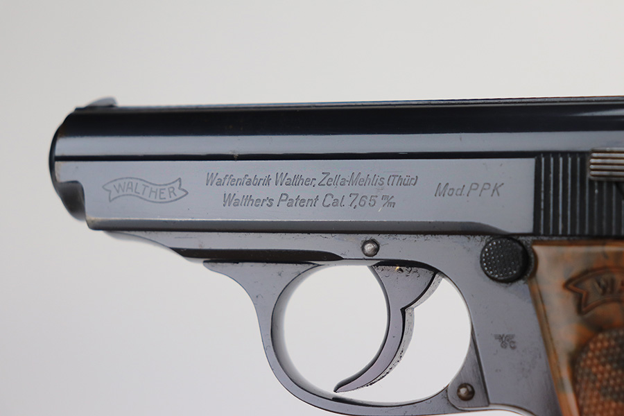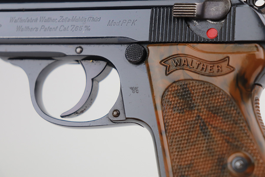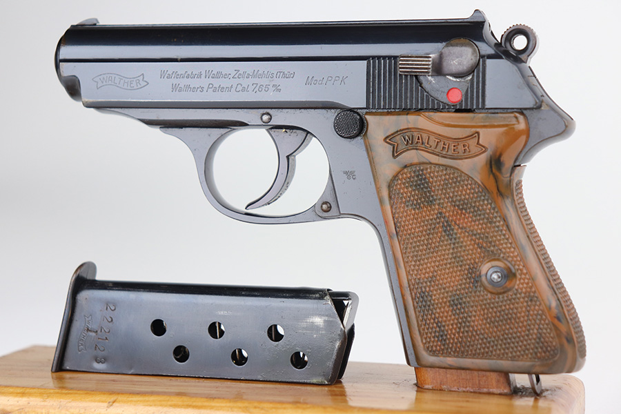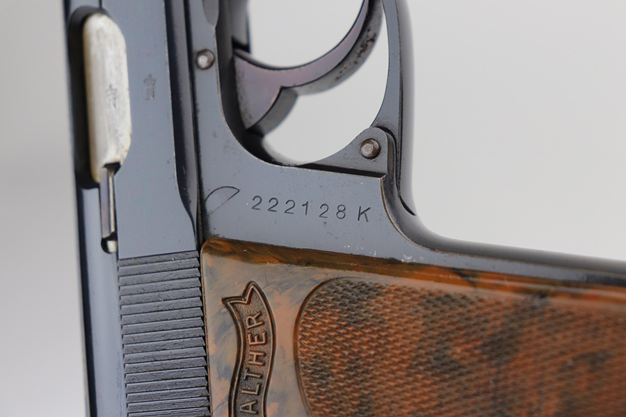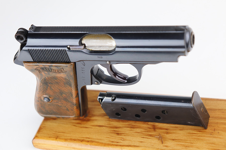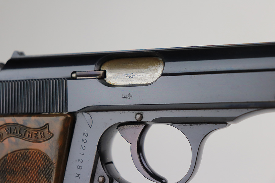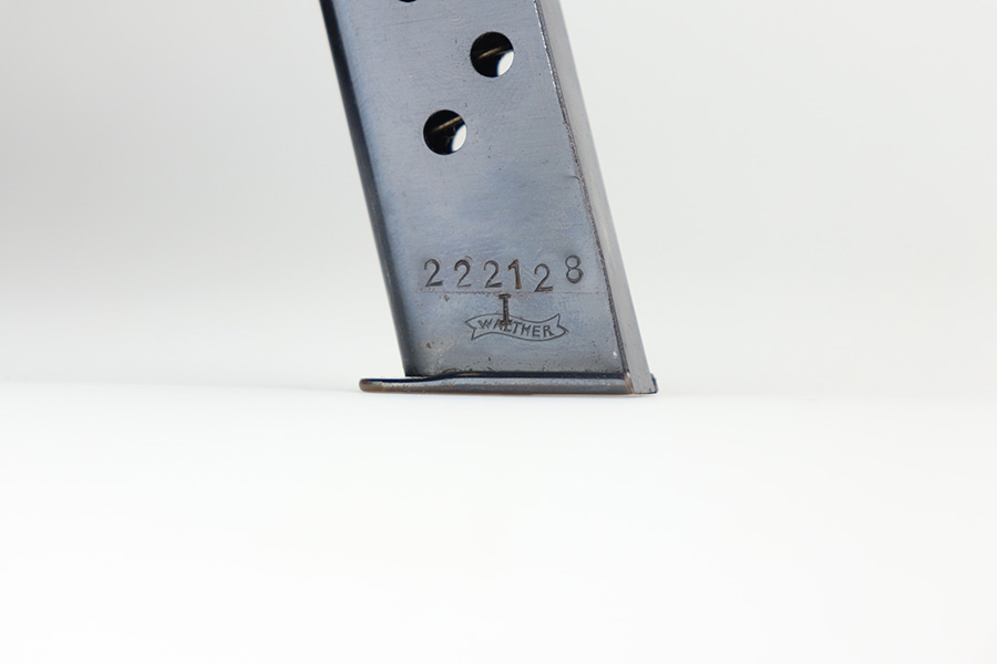 8/11/21 – This is a terrific Police Walther PPK from 1939 with matching numbered magazine. Eagle/C proof on frame, and magazine numbered at the police arsenal. About 97-98% of the original, high-polish blue remains. A hint of muzzle wear and a spot of finsh loss on the front strap, also some patina in those areas. Minty bore. Very nice grip with no cracks.
