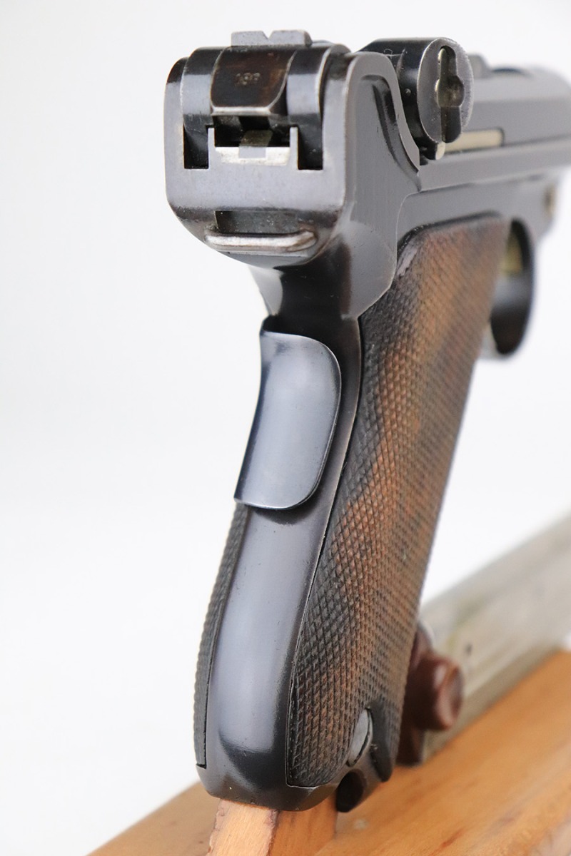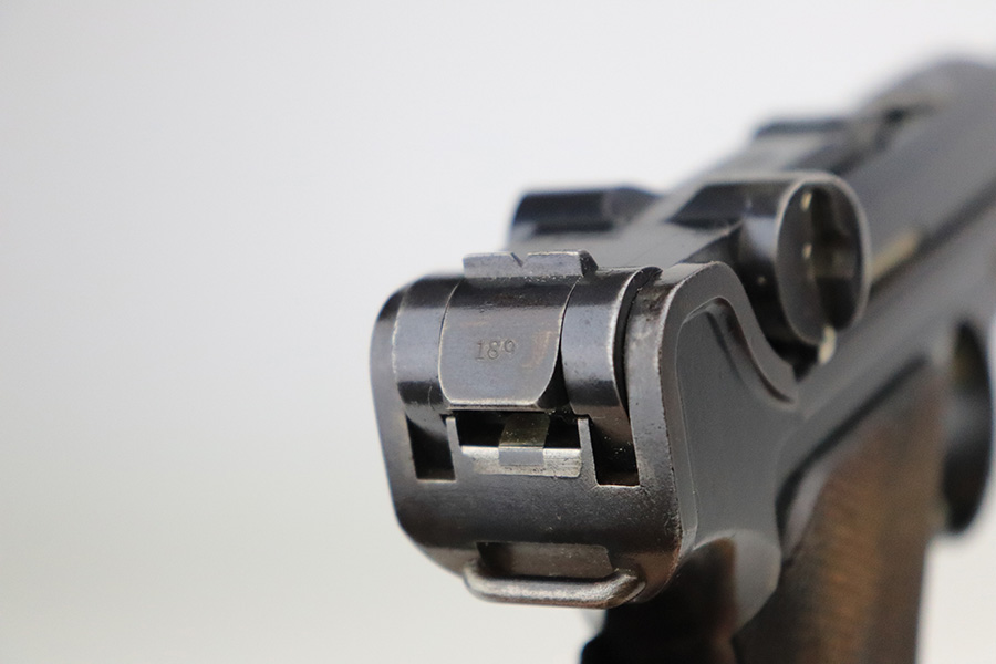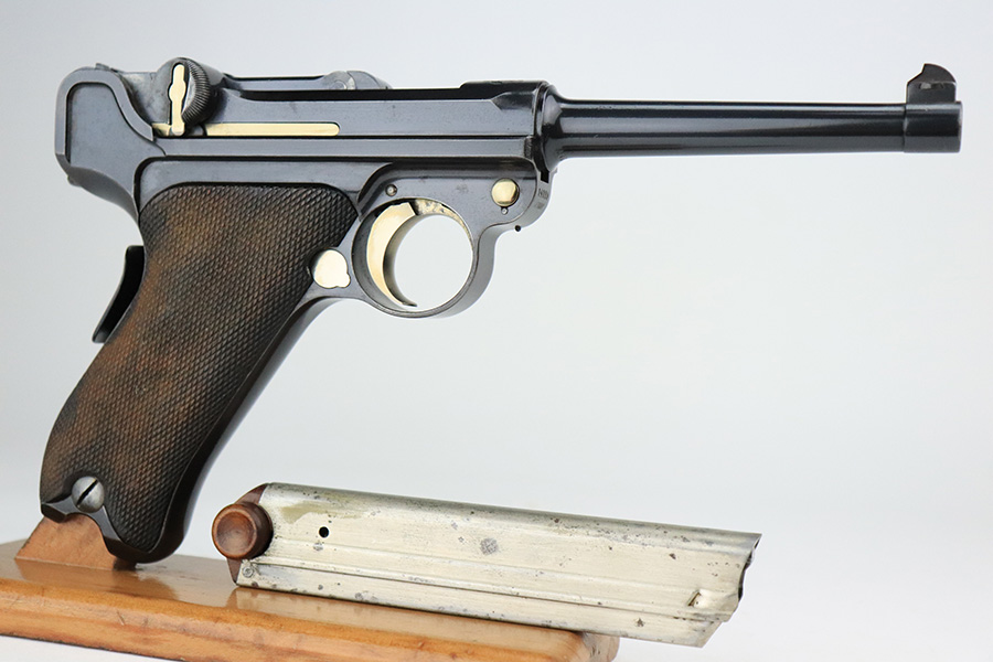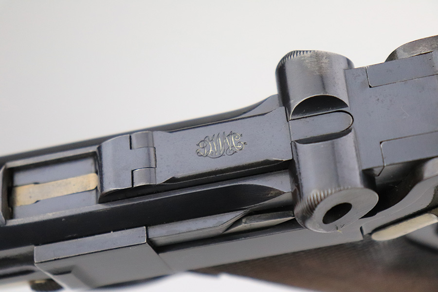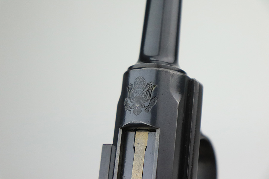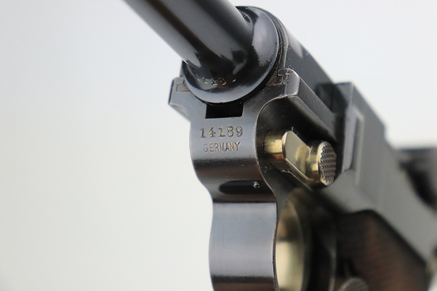 6/8/22 – This is a rare DWM model 1900 luger with American Eagle crest on the chamber. This is the first production model of this variation, made in or around 1900 with early dish toggle. These pistols went to the US retail market and the manufacturers at DWM realized that nation-based crests increased sales of these lugers, so that is why you find the American Eagle over the chamber. This is also why you see GERMANY marked on the frame, denoting these were exported for commercial sale. This one is all matching and has retained nearly all of its finish. There is just one light scratch on the front strap. Excellent straw finish on the small parts. Comes with very nice matching numbered grips and a blank bottom commercial magazine. Tiny repaired chip in the top corner of the left panel and a repaired hairline crack in the magazine bottom. The bore has good rifling, but there is minor pin-pricking throughout.
