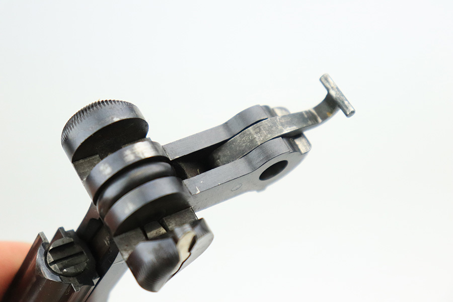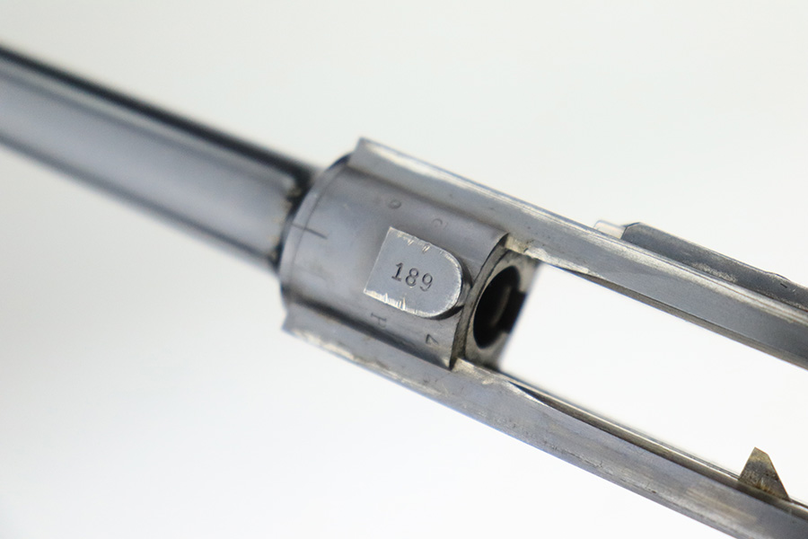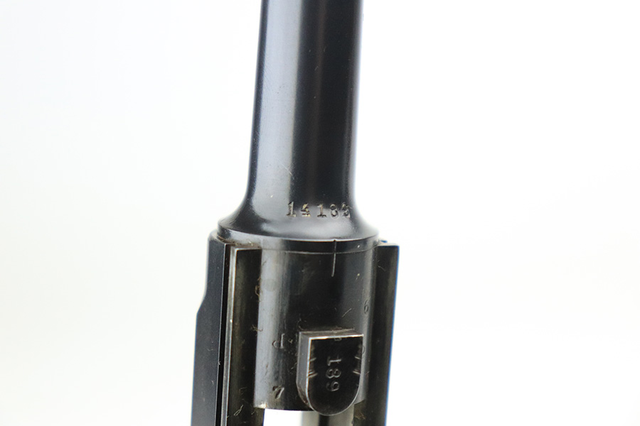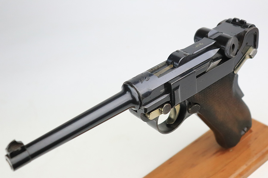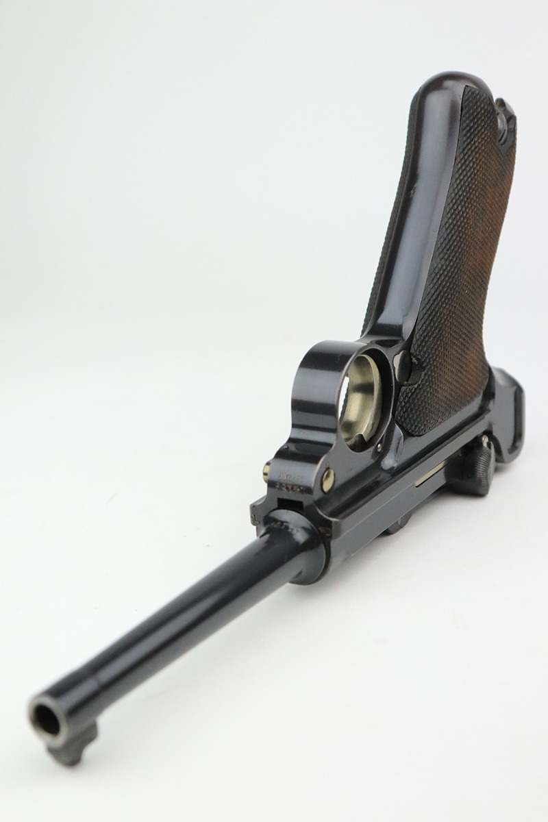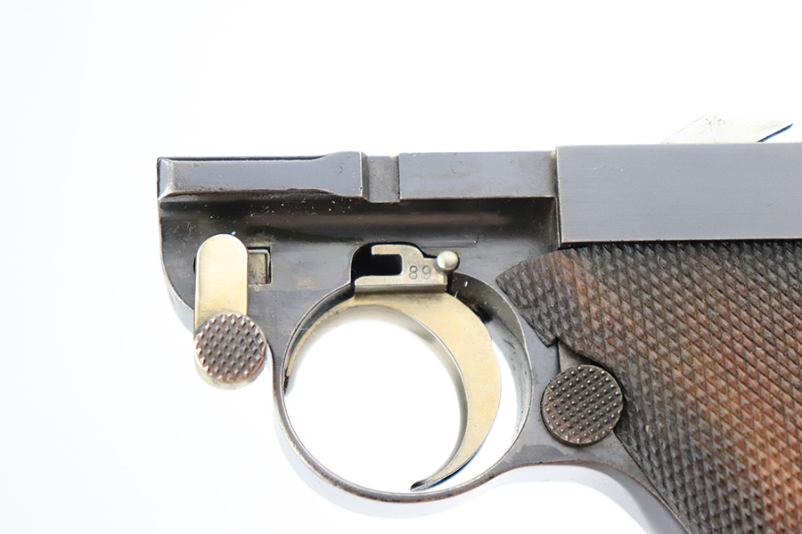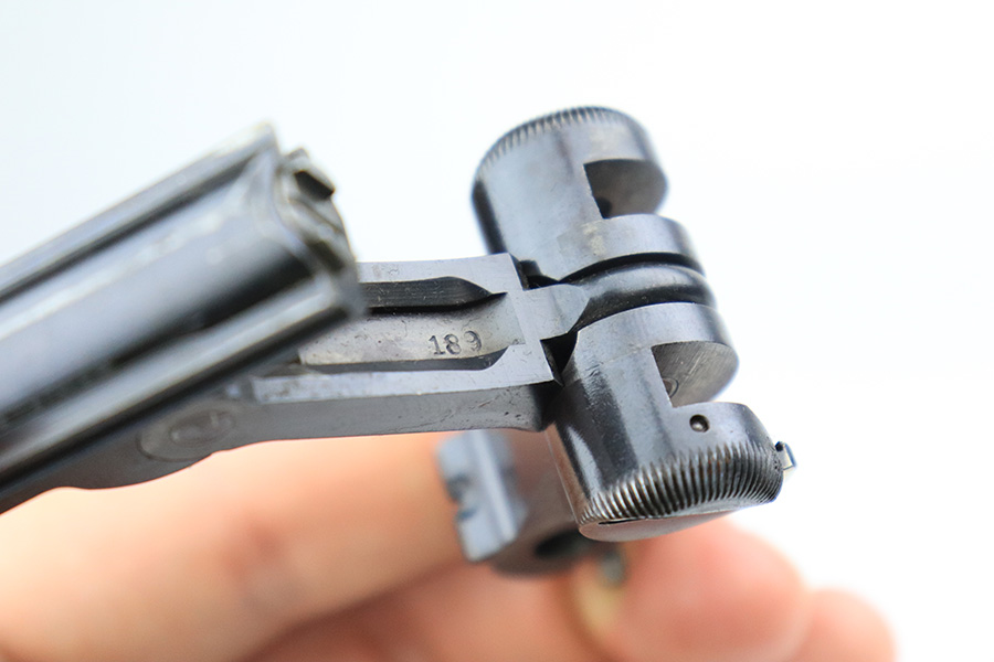 6/8/22 – This is a rare DWM model 1900 luger with American Eagle crest on the chamber. This is the first production model of this variation, made in or around 1900 with early dish toggle. These pistols went to the US retail market and the manufacturers at DWM realized that nation-based crests increased sales of these lugers, so that is why you find the American Eagle over the chamber. This is also why you see GERMANY marked on the frame, denoting these were exported for commercial sale. This one is all matching and has retained nearly all of its finish. There is just one light scratch on the front strap. Excellent straw finish on the small parts. Comes with very nice matching numbered grips and a blank bottom commercial magazine. Tiny repaired chip in the top corner of the left panel and a repaired hairline crack in the magazine bottom. The bore has good rifling, but there is minor pin-pricking throughout.