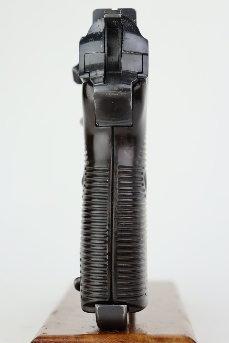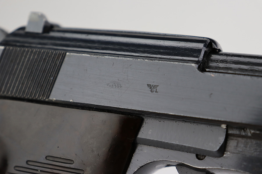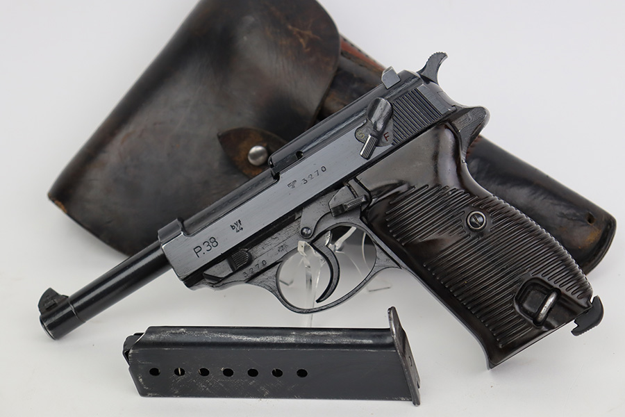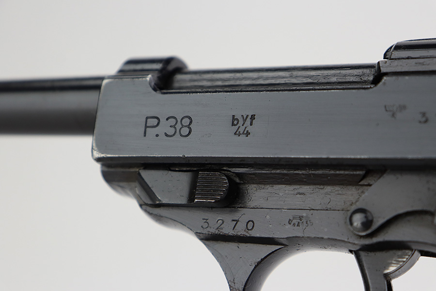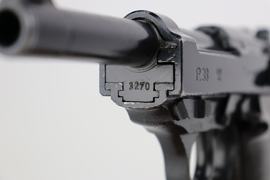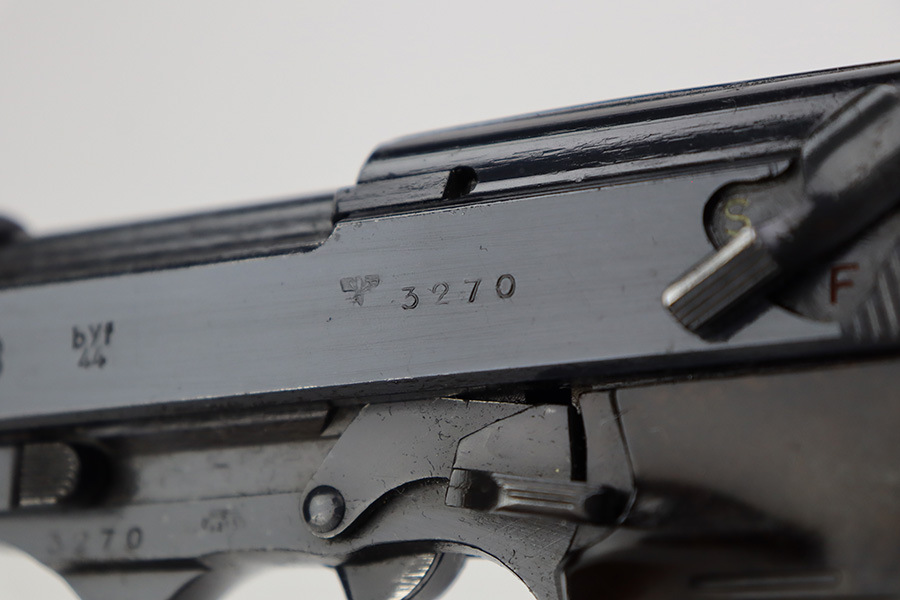 6/22/23 – This is a beautiful example of a rare Police “Eagle L” marked BYF 44 Mauser P.38 that was issued to the German Police in 1944. There were only 4,600 of this variation produced, and 3,200 of that in 1944. All matching. Comes as a rig with a 1943-dated waffen-proofed holster (modified mag pouch) and a numbered, force-matched magazine. The gun itself has retained nearly all of its finish with just hints of wear around the muzzle and on the front edges of the slide. Fitted with excellent blackish-brown bakelite grips. Minty bore. De-cocker is functional.