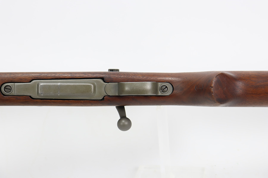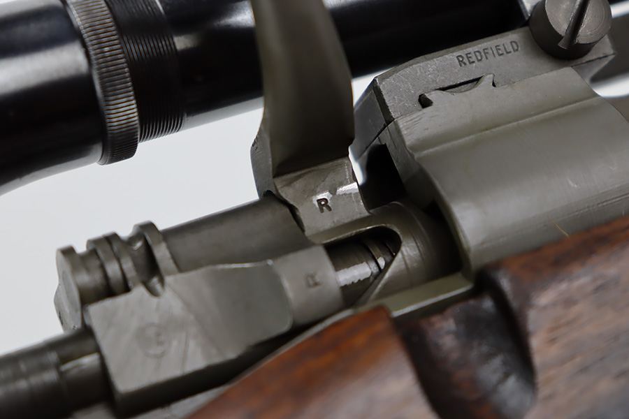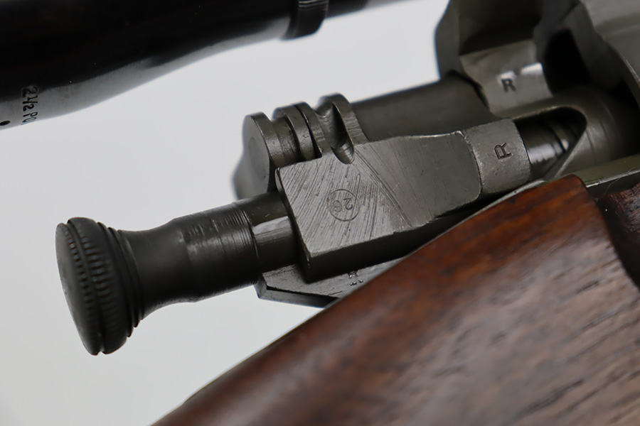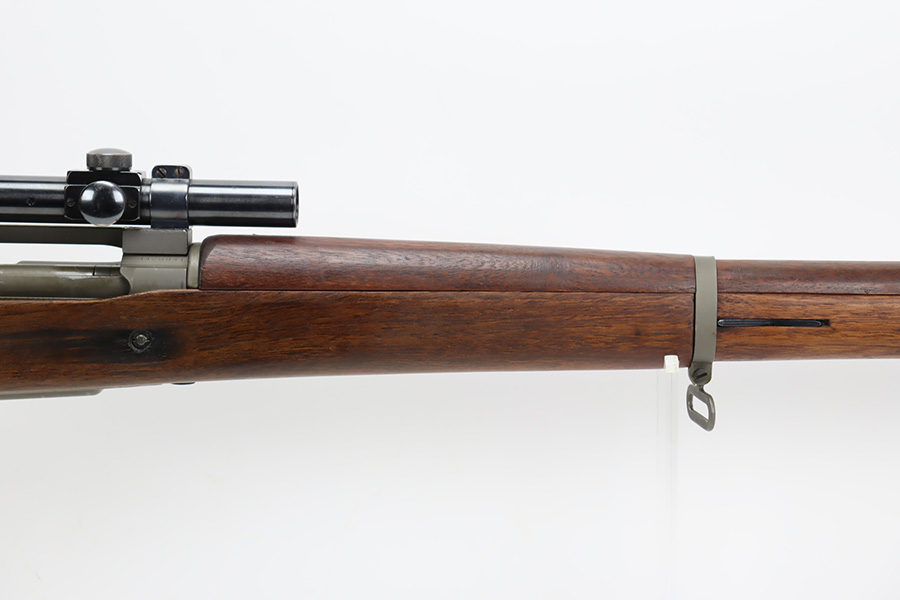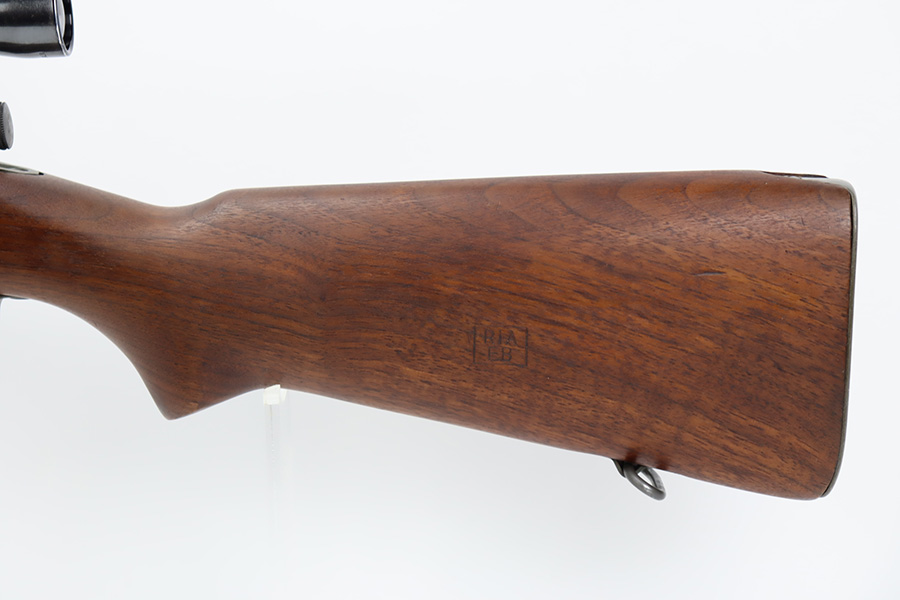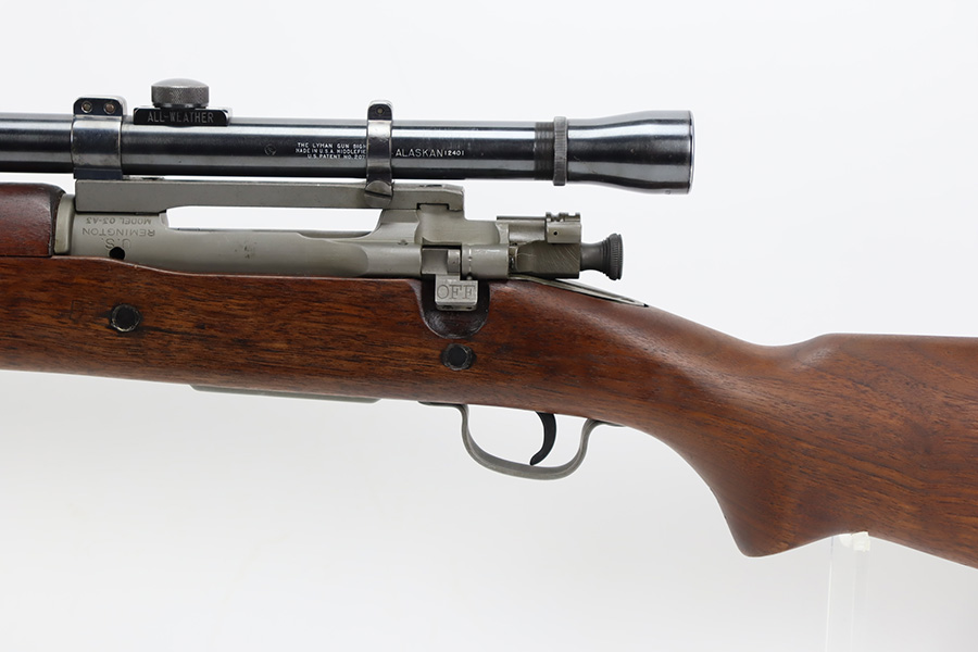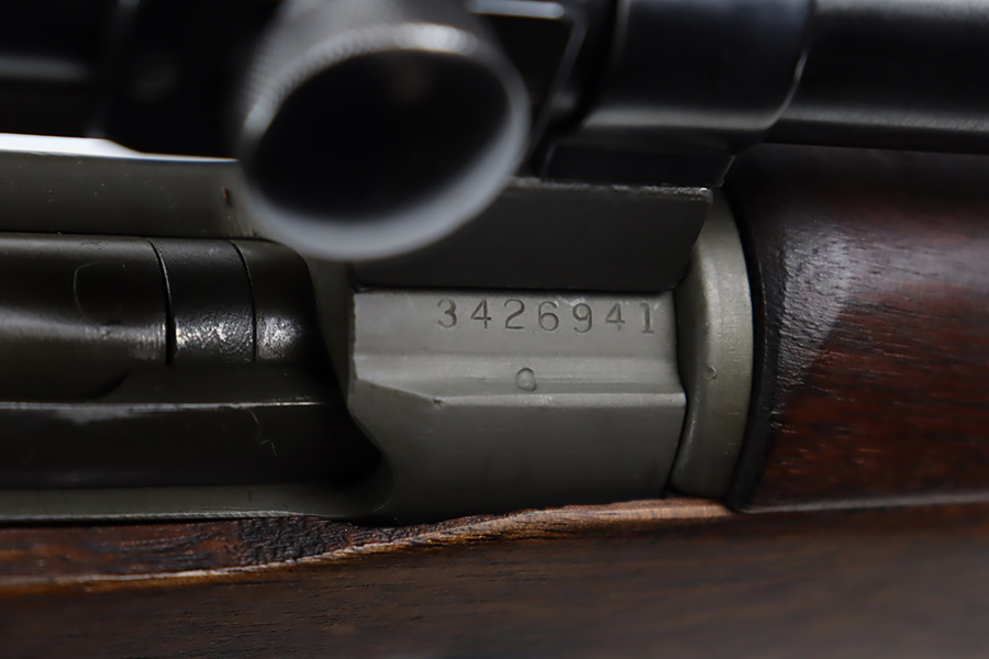 9/12/23 – This is a beautiful Remington 03-A4 sniper rifle from 1943. It has the original/proper receiver with offset Remington 03-A3 marking to avoid being covered by the scope mounts, and proper barrel as the front sights were never added to original 03-A4 snipers. This one has an excellent commercial Lyman Alaskan scope, which was used at the end of WW2 and into Korea. Scope is in excellent condition with clear optics/reticle. This example has a WW2 replacement stock with an RIA/EB marking on the left face. The buttstock plate is replacement as well. The bolt assembly, trigger guard, receiver, and barrel bands have all been arsenal parkerized. The stock is in great shape with no notable defects.