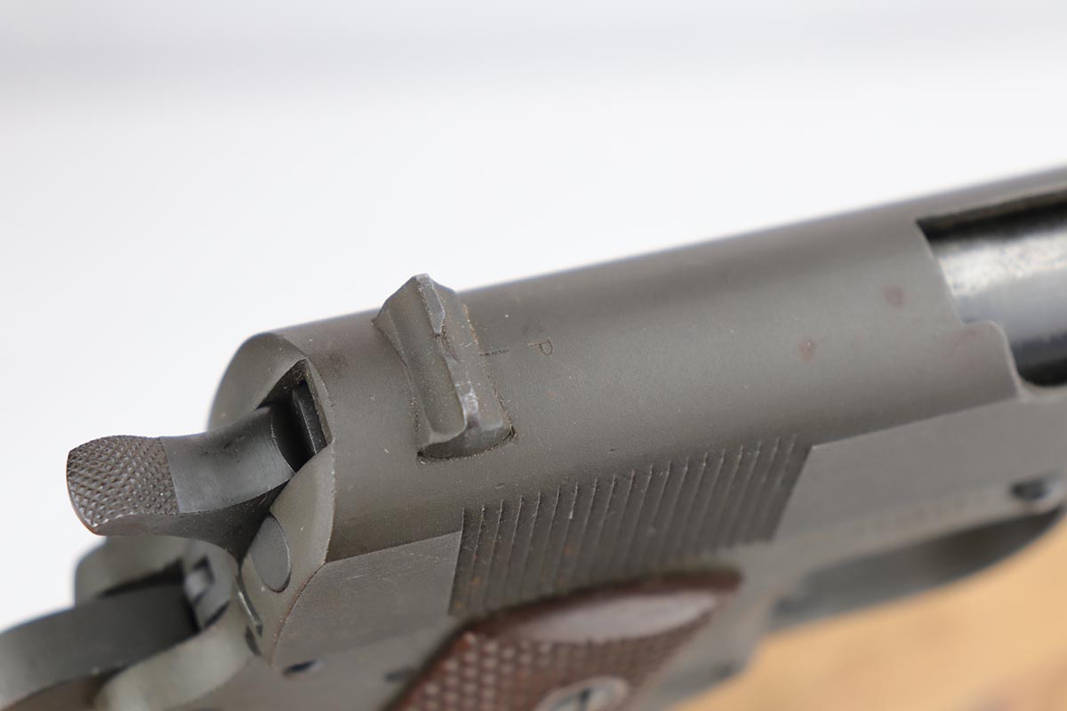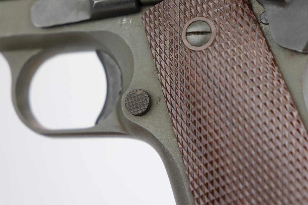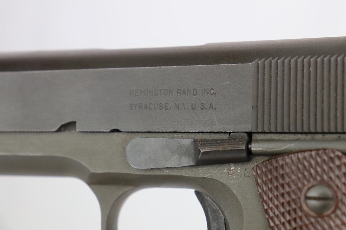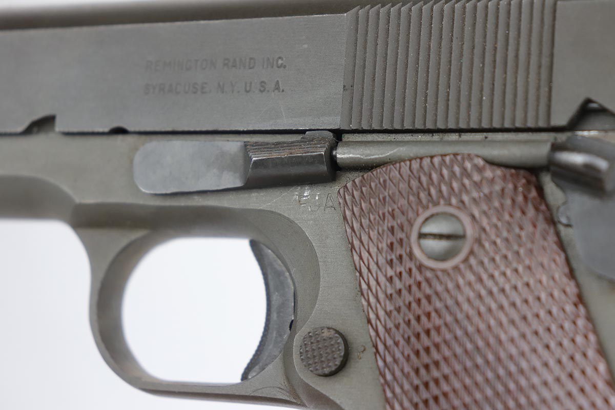 10/18/19 – This is a near-mint Remington 1911A1 from late in 1943. Proper FJA inspector mark on frame, and P proofs on frame and slide. Finish rates at 98-99% with minor wear on the underside of the slide, but is minty otherwise. Excellent grips. ‘S’ marked magazine. Correct HS barrel. Terrific bore.