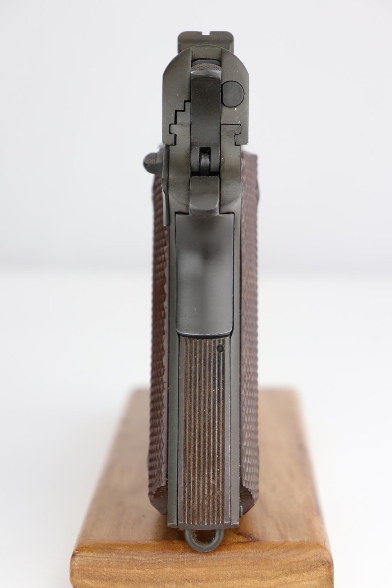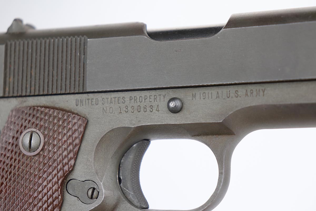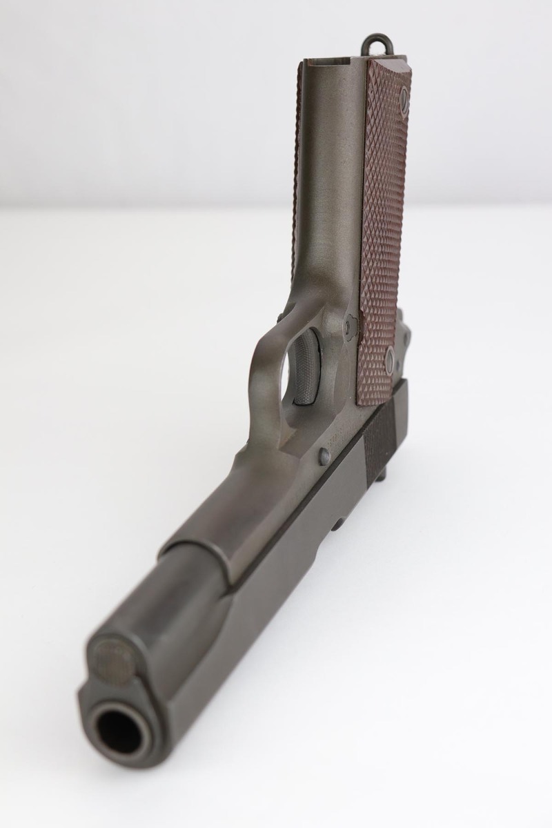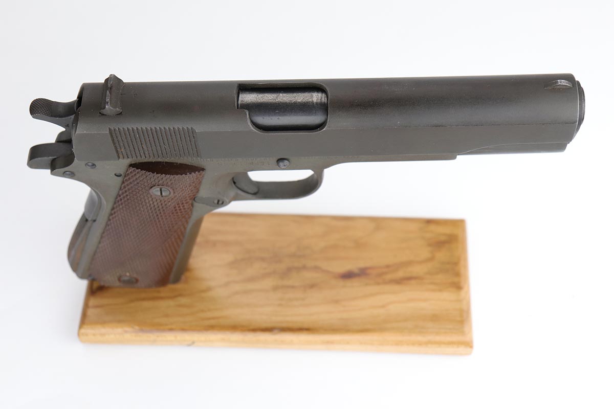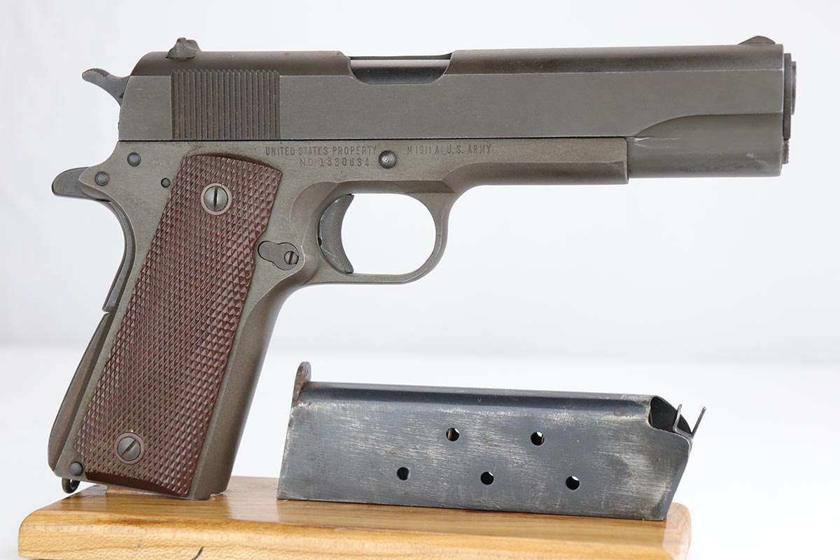 10/18/19 – This is a near-mint Remington 1911A1 from late in 1943. Proper FJA inspector mark on frame, and P proofs on frame and slide. Finish rates at 98-99% with minor wear on the underside of the slide, but is minty otherwise. Excellent grips. ‘S’ marked magazine. Correct HS barrel. Terrific bore.