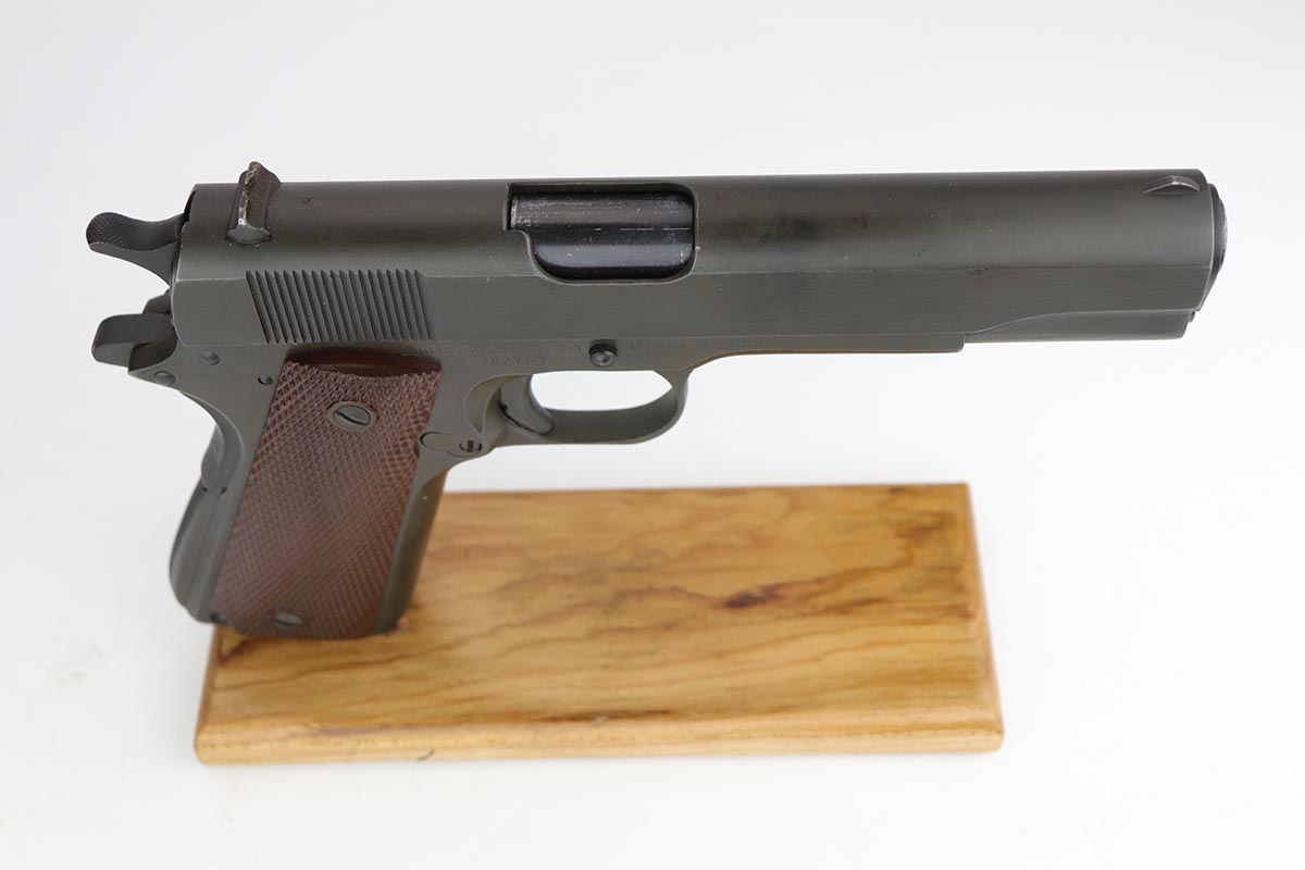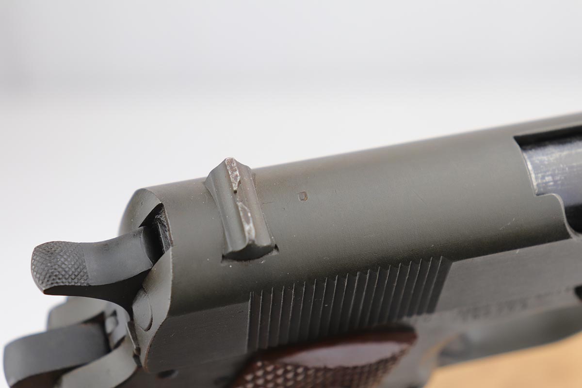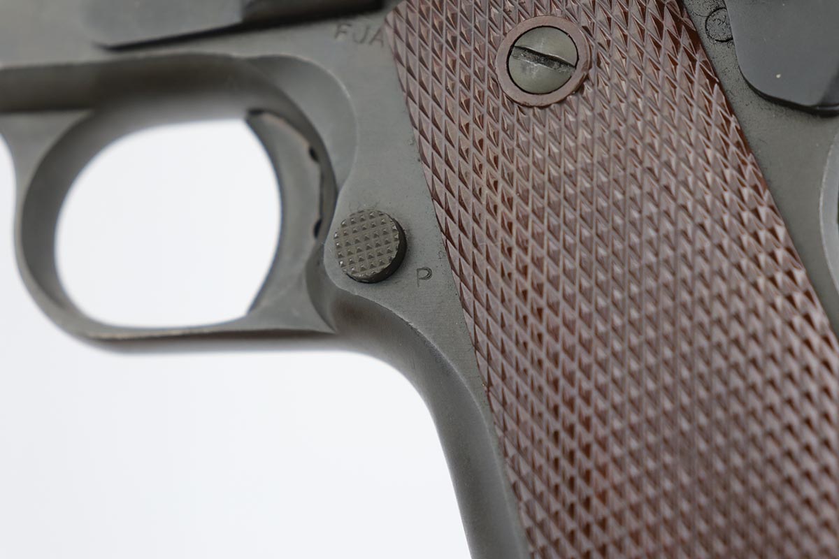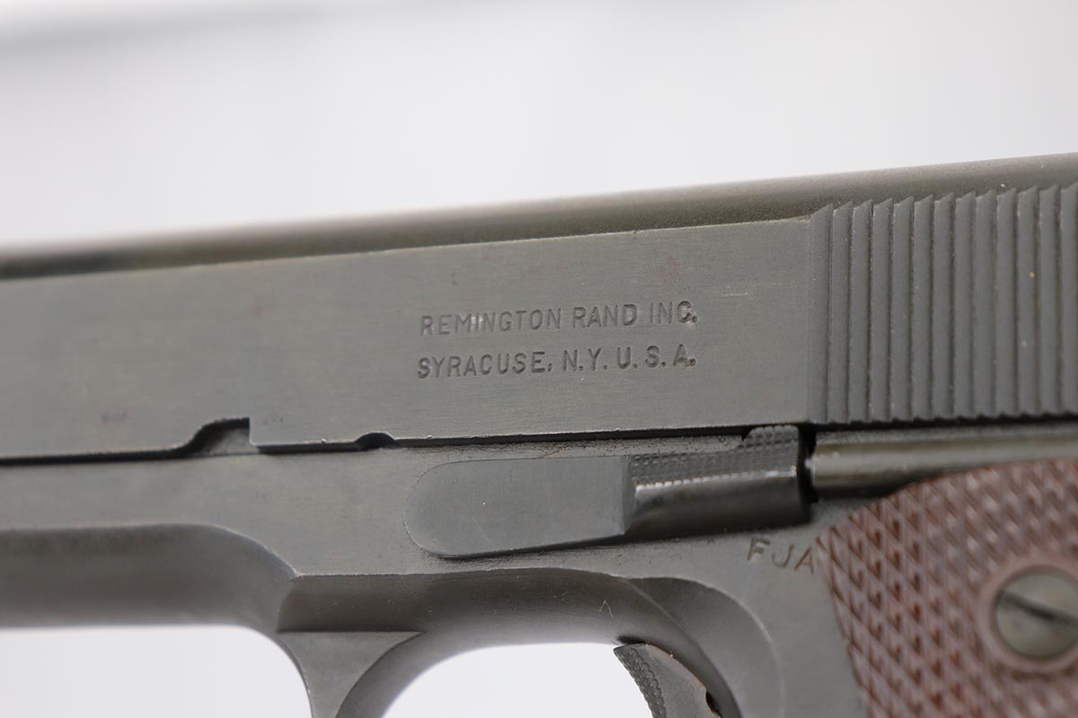 9/19/19 – This is a near-mint Remington Rand M1911A1 from 1943. The original finish rates at 99+% with barely any hint of edge wear, but there are a couple areas of minor pinpricking on either side of the slide. Fantastic grips and bore. ‘HS’ barrel. Unmarked postwar magazine.