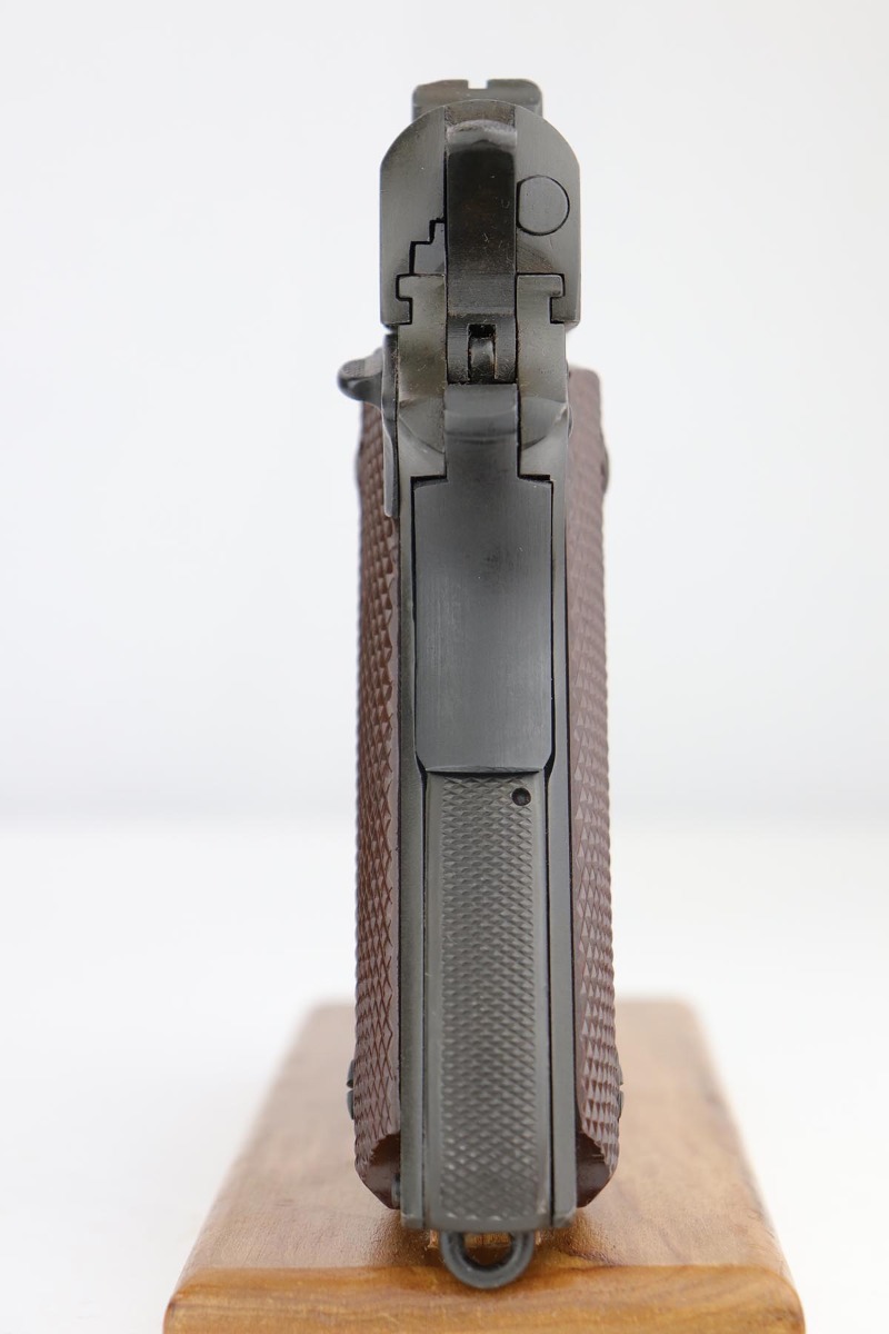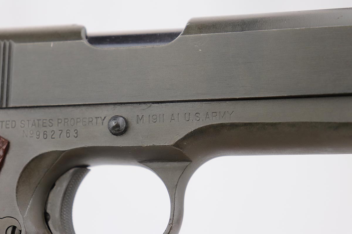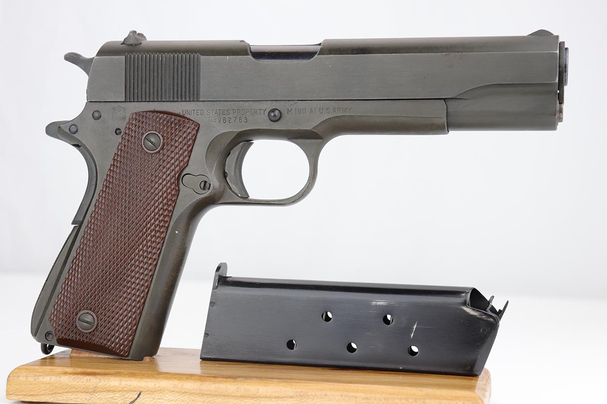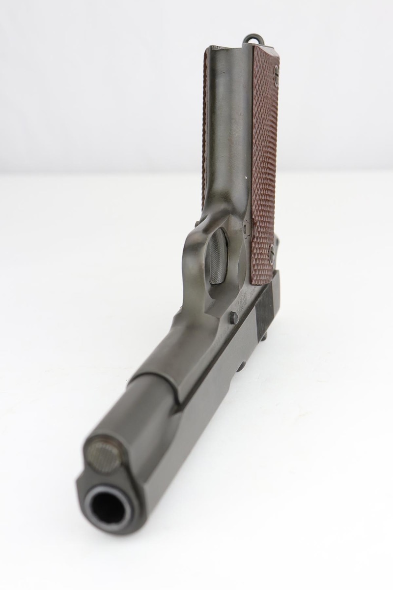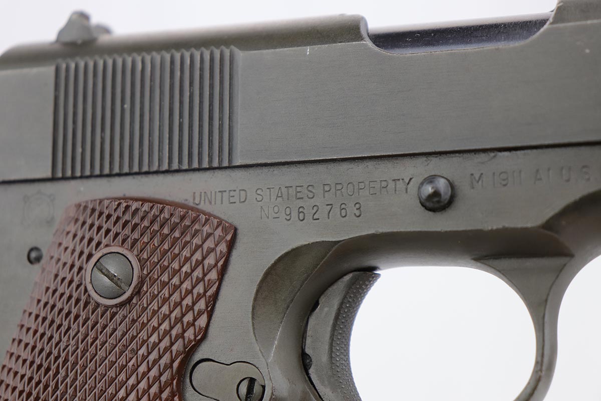 9/19/19 – This is a near-mint Remington Rand M1911A1 from 1943. The original finish rates at 99+% with barely any hint of edge wear, but there are a couple areas of minor pinpricking on either side of the slide. Fantastic grips and bore. ‘HS’ barrel. Unmarked postwar magazine.