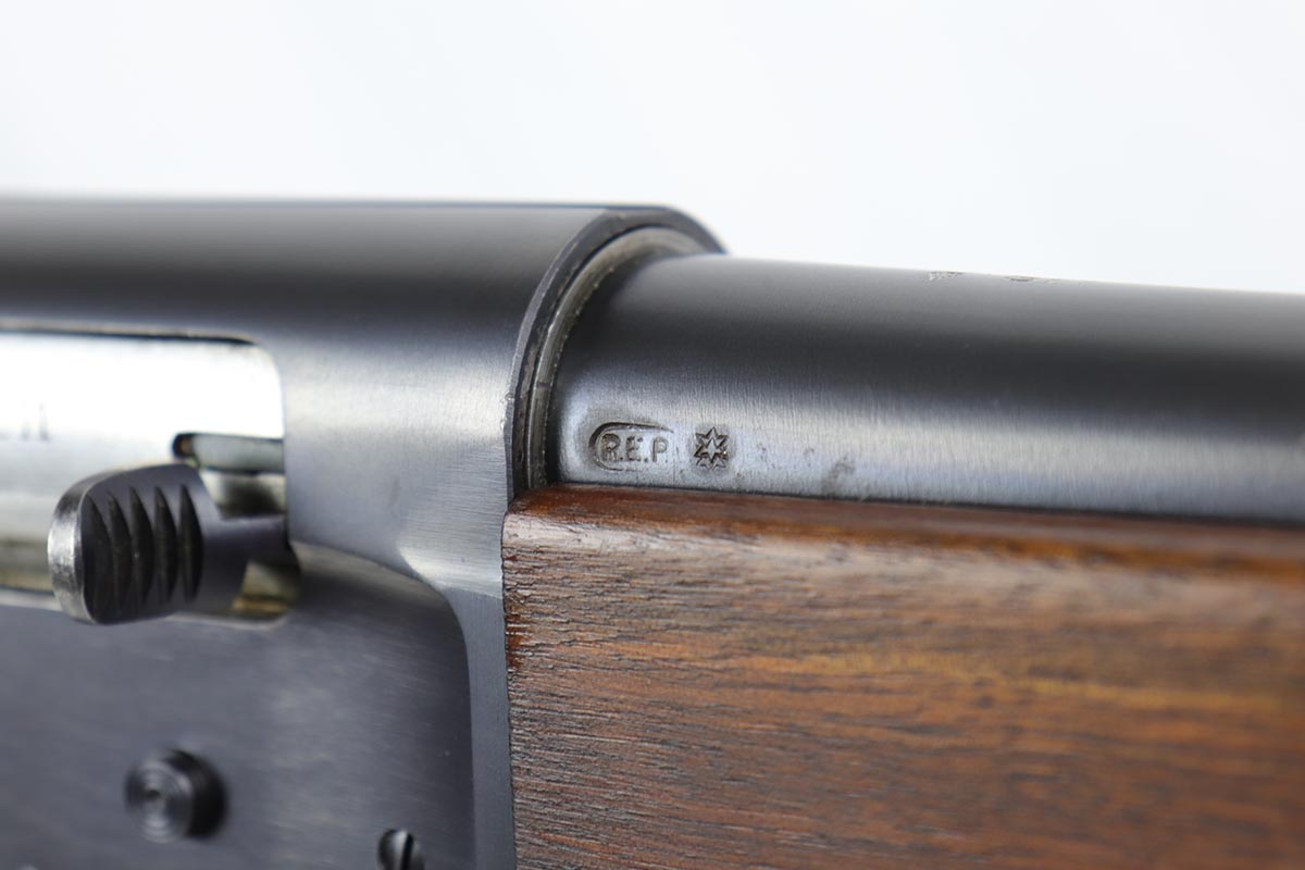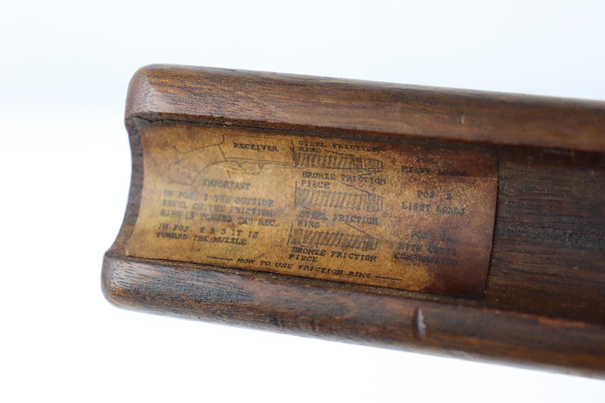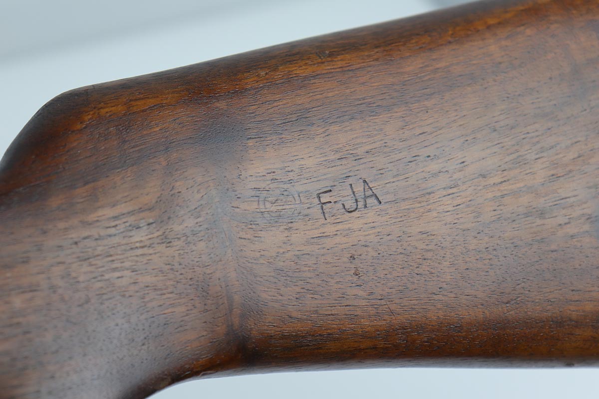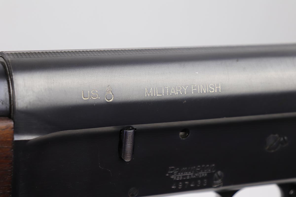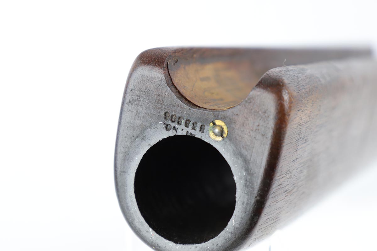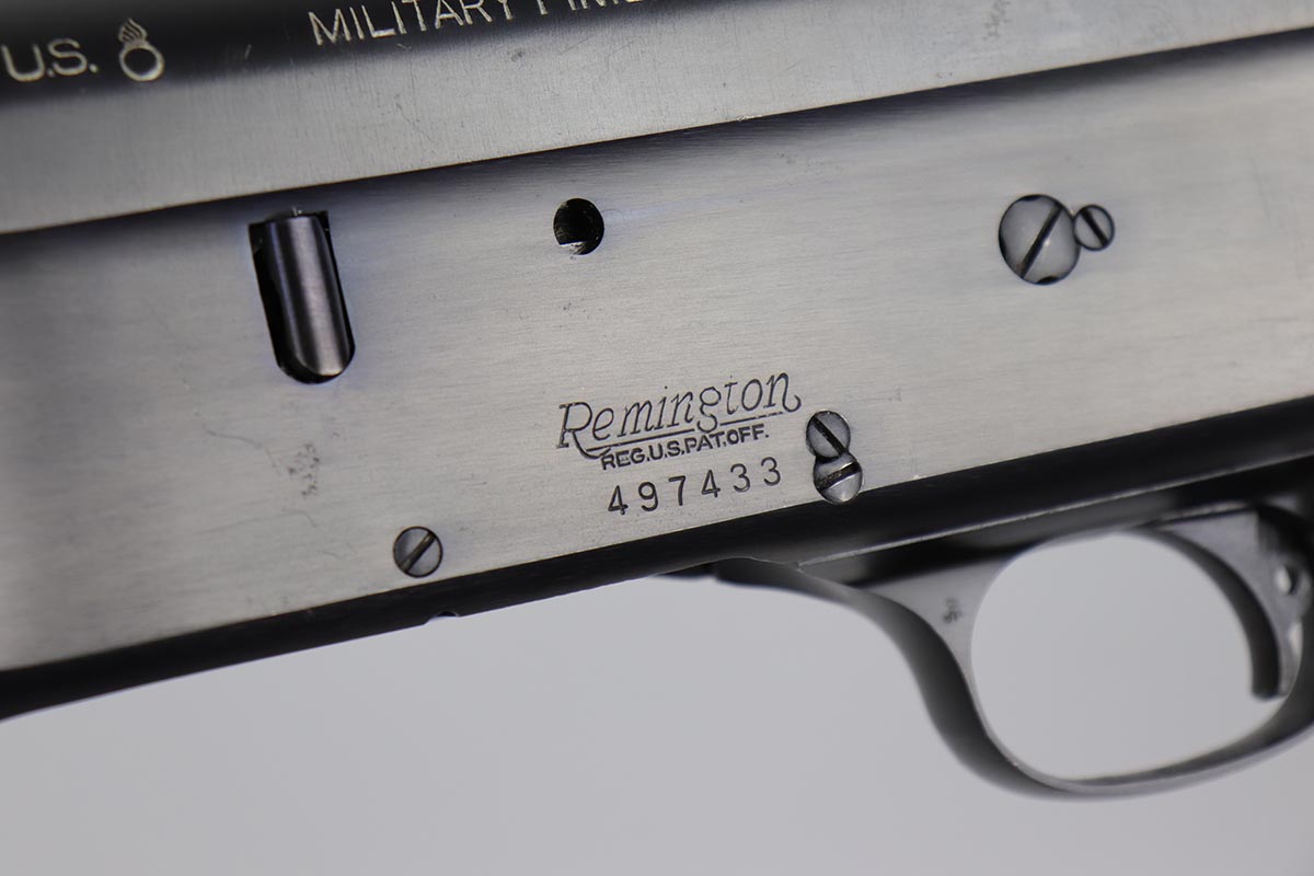 5/21/19 – This is a fantastic example of a desirable Remington Model 11 riot shotgun that was manufactured and issued for use by the U.S. Army. All correct and original, this shotgun retains 97-98% military blue with only minor edge wear and a couple of small scratches on receiver and barrel. Barrel is marked ‘CYL’ and ‘R.E.P.’ in oval, and the ‘MM’ marking is a date code for 1943. Barrel and receiver feature sharp U.S. and flaming bomb markings, and stock shows sharp crossed cannon cartouche with FJA inspection proof. Excellent stock with only one or two minor scratches. Terrific bore. Matching numbered barrel and receiver.