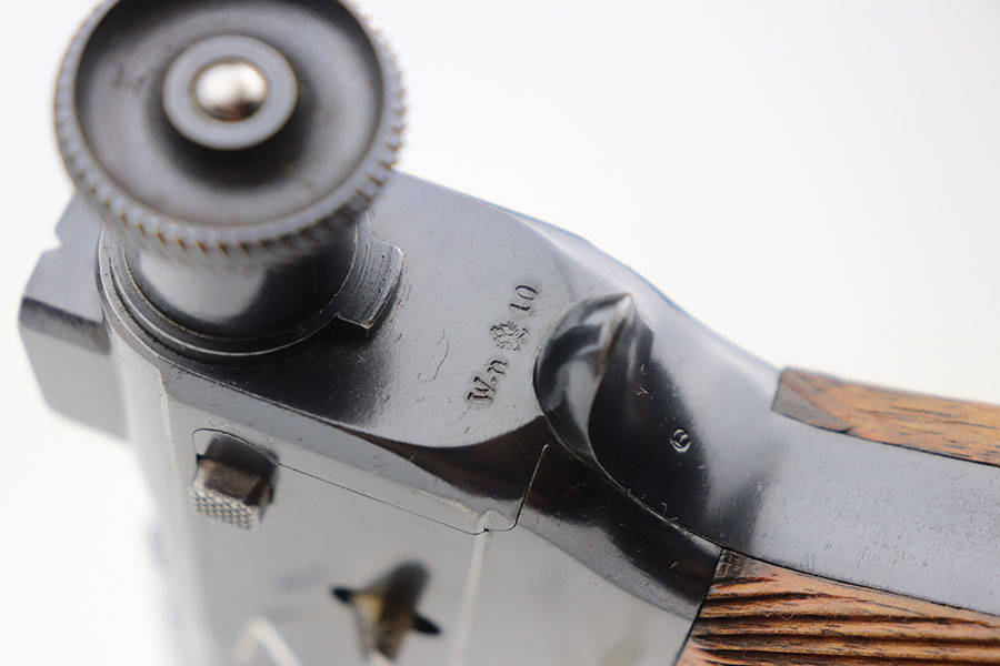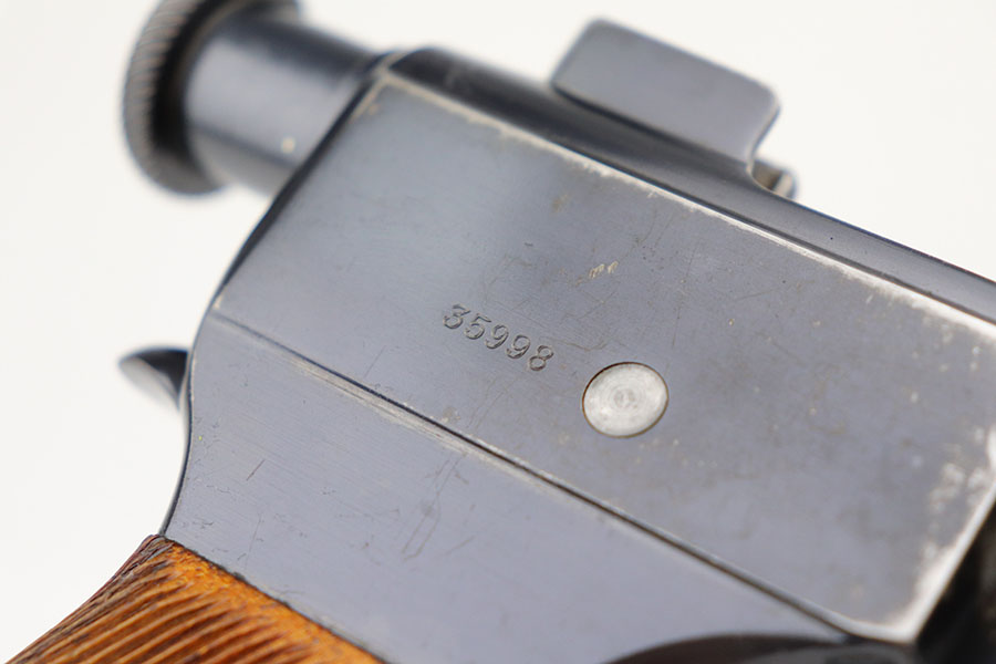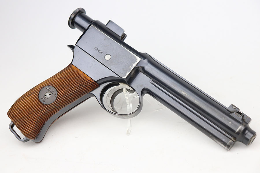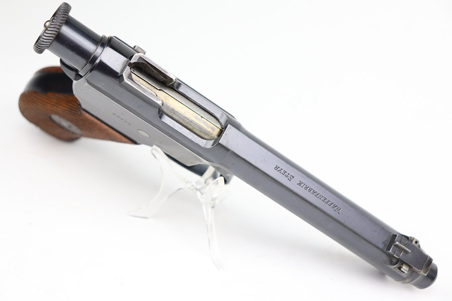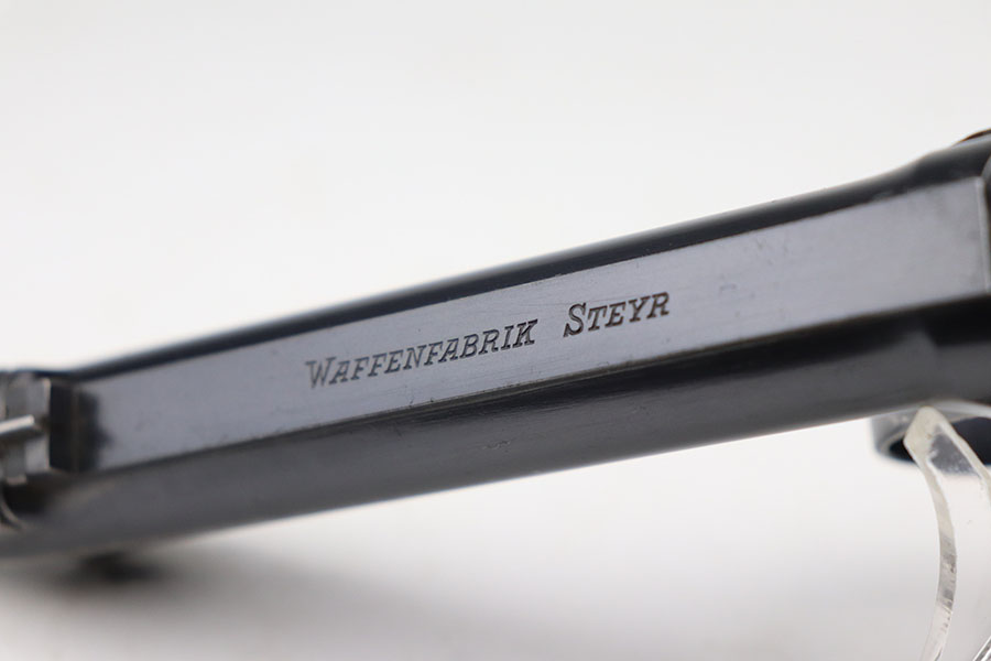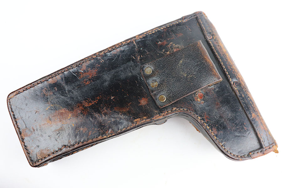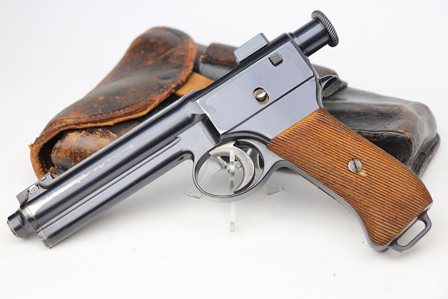 2/5/21 – This is an excellent example of the desirable Roth-Steyr Model 1907 with period holster and clip. This piece was made in 1910, and was the 41st handgun issued to the 26th Landwehr Regiment of the Imperial Austro-Hungarian army, as indicated by the grip medallion. The Imperial-Royal Landwehr, also called the Austrian Landwehr, was the territorial army of the Cisleithanian or Austrian half of the Austro-Hungarian Empire from 1869 to 1918. It has about 92-94% of the original blue, with high edge wear from the holster on both sides, and some wear on the trigger guard. The holster is original but fairly worn, especially on the top flap. It has a faint internal inkstamp but no visible markings. Excellent bore and grips. Note: The consignor has original Roth 8mm ammo that can be purchased in addition to this listing.