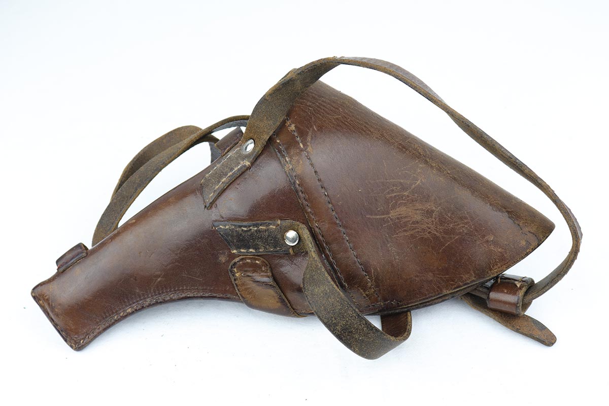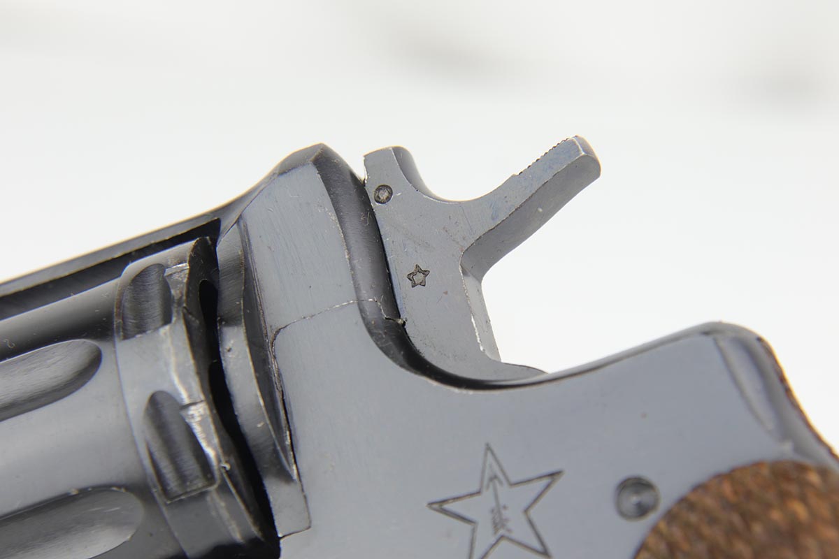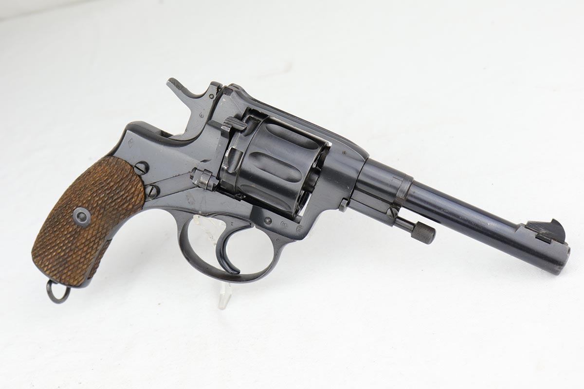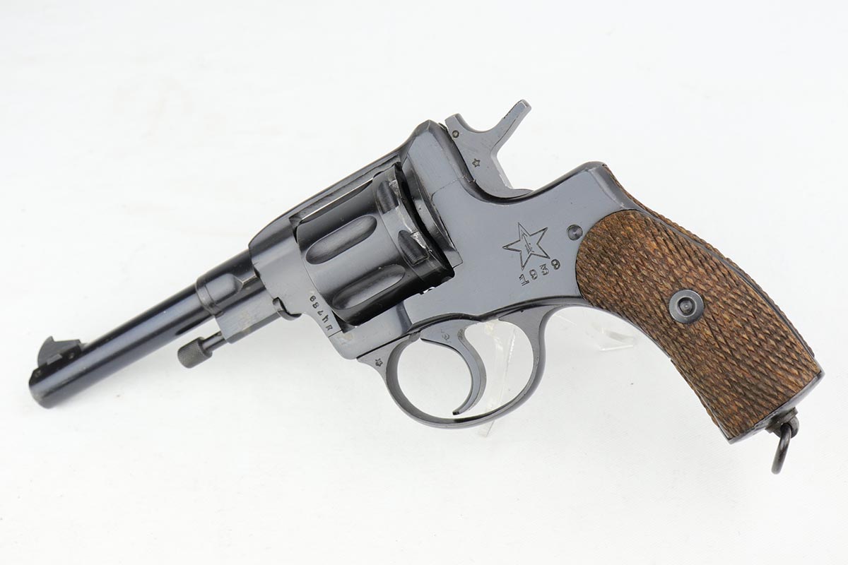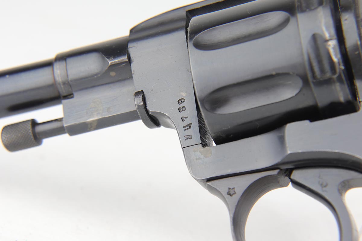 2/5/20 – This is an absolutely gorgeous, all original Russian pre-war Nagant revolver, that retains nearly all of its beautiful original blue with just a few tiny spots of discoloration here and there and a few freckles on the right side of the frame right above the trigger. There is very light muzzle and cylinder wear, as well. All matching, Tula made gun, it is profusely marked with five pointed star throughout, with sharp inspector marks as well. Excellent bore and grips. It comes with superb leather holster with a scarce long shoulder strap configuration that is maker marked inside the flap. Also, comes with an original lanyard cord. Judging by the condition, it was most likely captured either by Finns during the Winter War or by the Germans in the opening days of operation Barbarosa, and finally made it into the hands of the returning American GI.