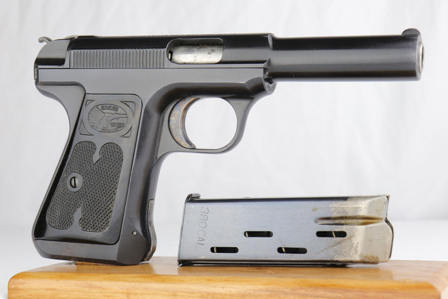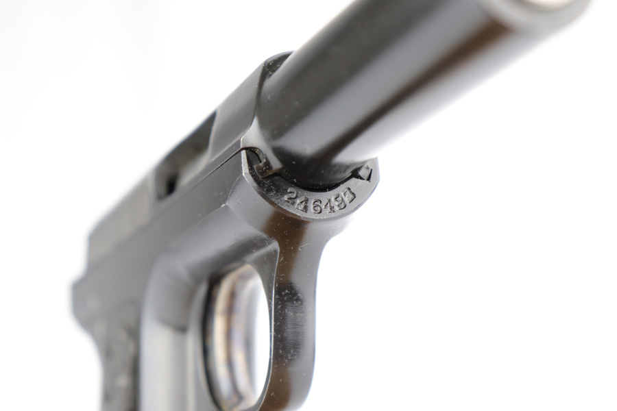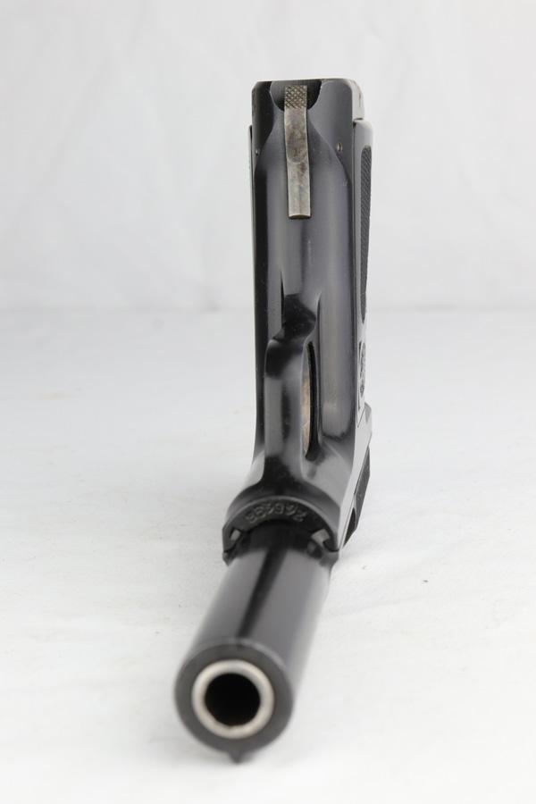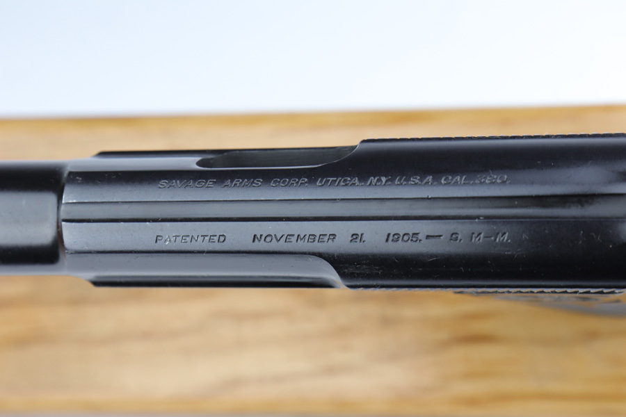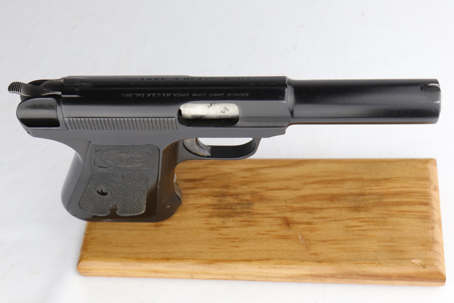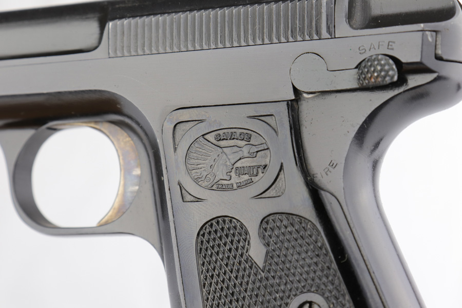 3/20/19 – This is a near-mint condition Savage Model 1917 pistol, in nearly perfect original configuration. The model 1917 is a variant of the model 1907 that was manufactured from 1920-28 in .32 caliber, and it is easily distinguishable by the oversized grip. The finish rates at 99+% or so, with only a hint of muzzle and edge wear, but there is a small area of surface pitting on both sides of the grip frame. Excellent original grips and magazine. Bore has no notable flaws.