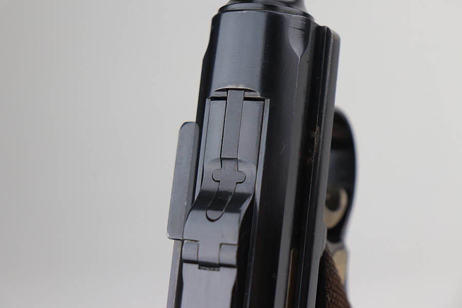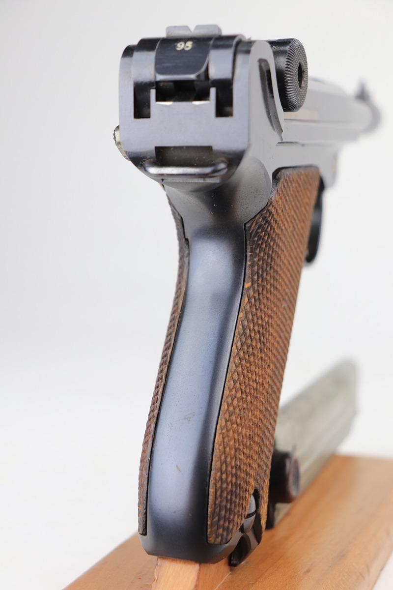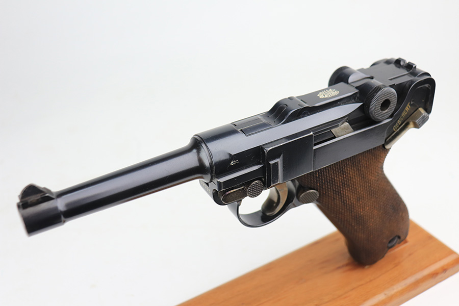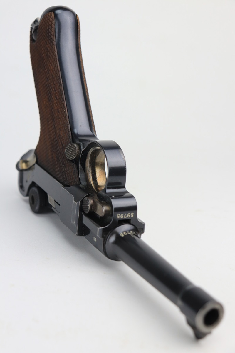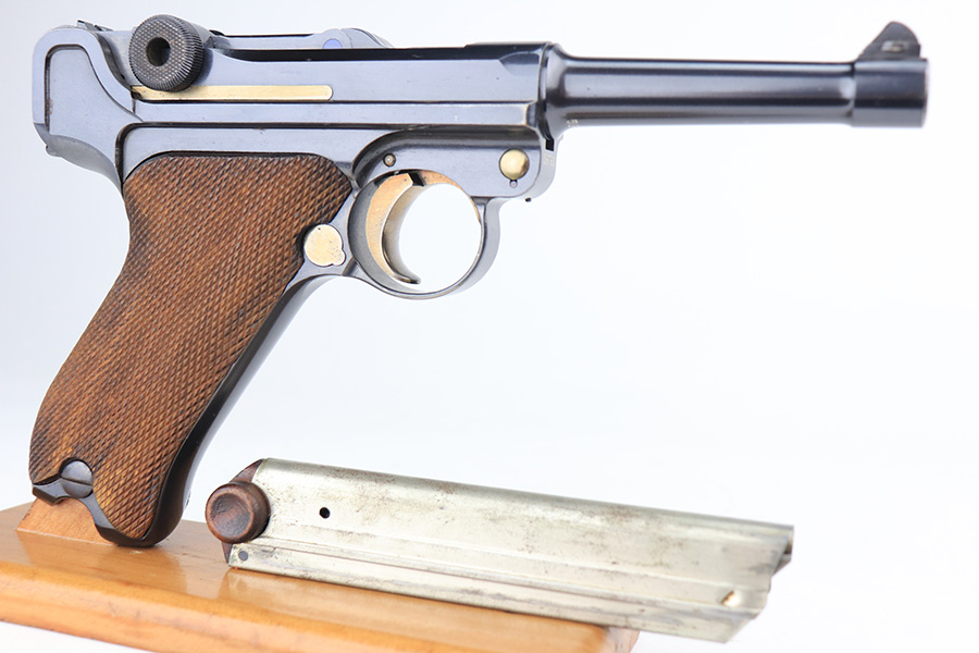 2/3/22 – This is a gorgeous, original example of a scarce 1908 commercial DWM Luger from the early 1910s. One of only 9,000 produced, all from 1908-1913. This variation features no hold open and no stock lug. It’s all matching with 98% of the original blue, and 90+% of the original straw. Just a bit of high point wear, and a spot of finish loss on the bottom of the front strap. Fantastic, sharply checkered grips. Correct commercial magazine with blank wood base. Bore has strong rifling but some frost throughout and a tiny bit of freckling.