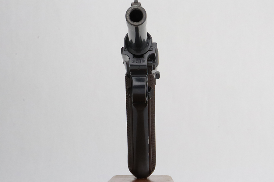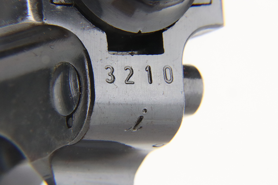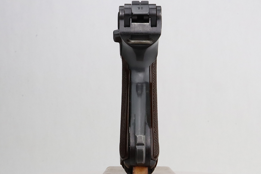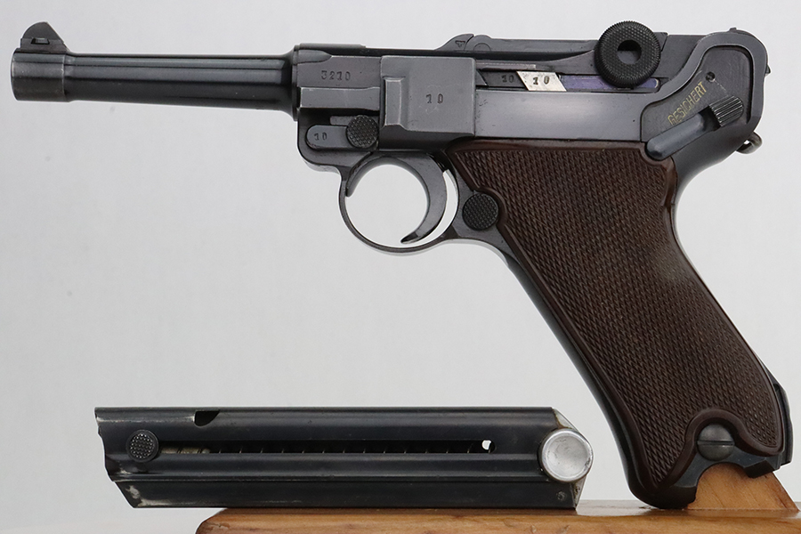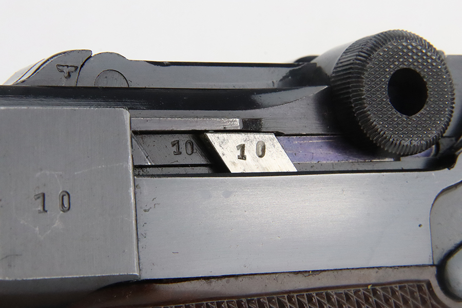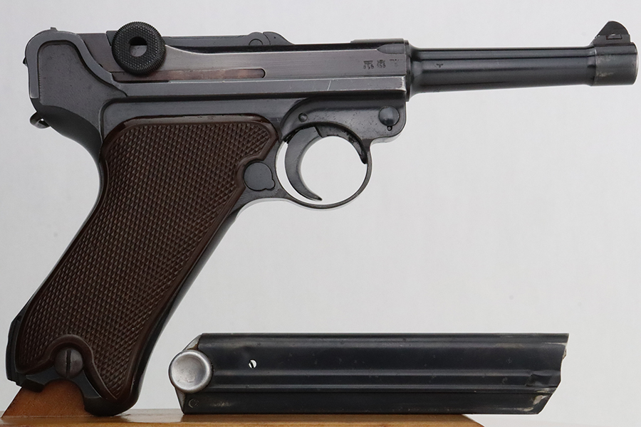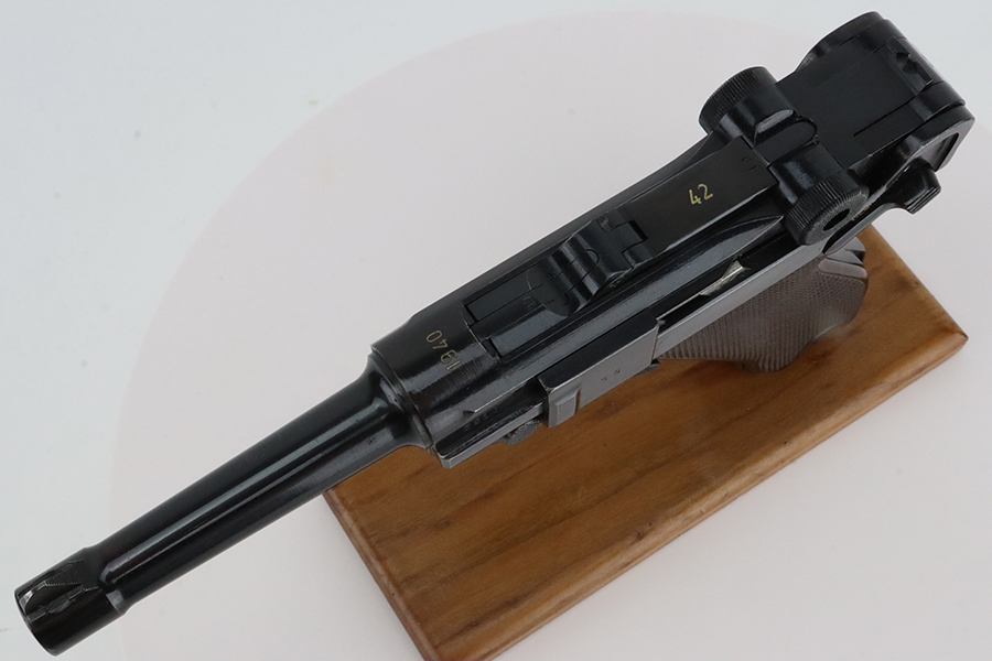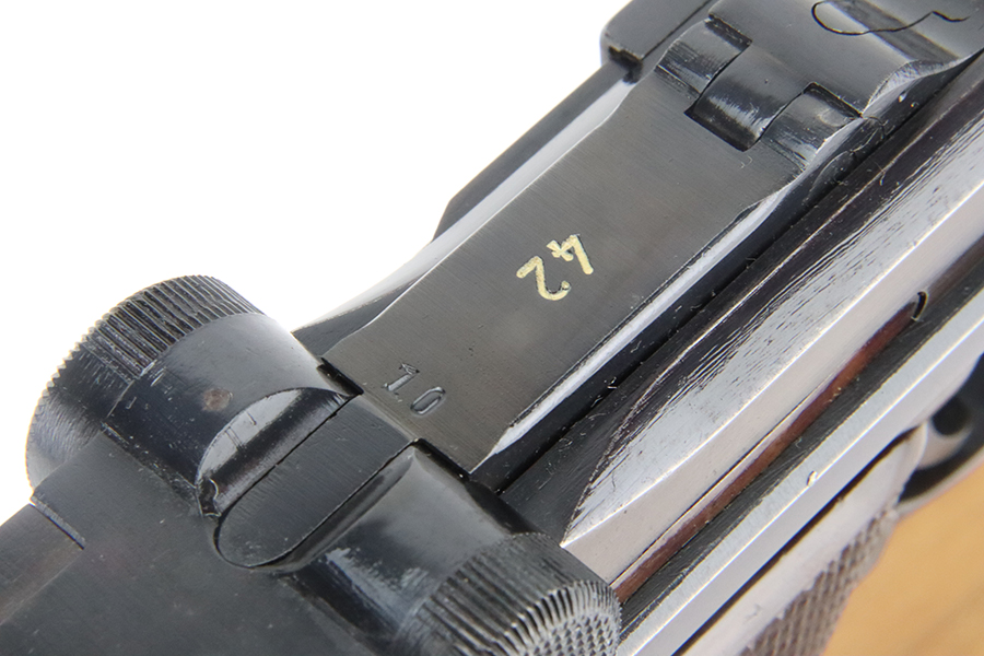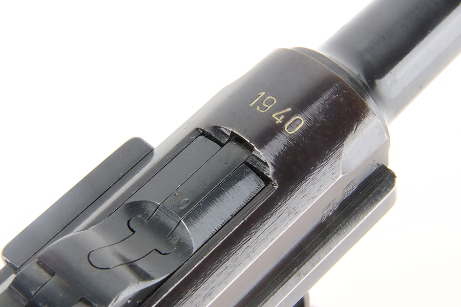 2/26/24 – This 1940 dated Mauser Luger is all original and has the rare, reddish Krieghoff grips on it. A very small set of 1940 lugers have these grips on them from the factory. It is assumed that they experimented with the HK grips as an option before they started making their own black plastic grips. These grips are found in the G to K blocks. This one is all matching, and comes with a ’42’ code replacement mag that has been force-matched to this pistol. It has retained nearly all of its finish with one small area of very light thinning on the left side and hints of pin-pricking along the barrel, on the chamber, and on the grip straps. The bore has good rifling, but there is some light freckling in the grooves.