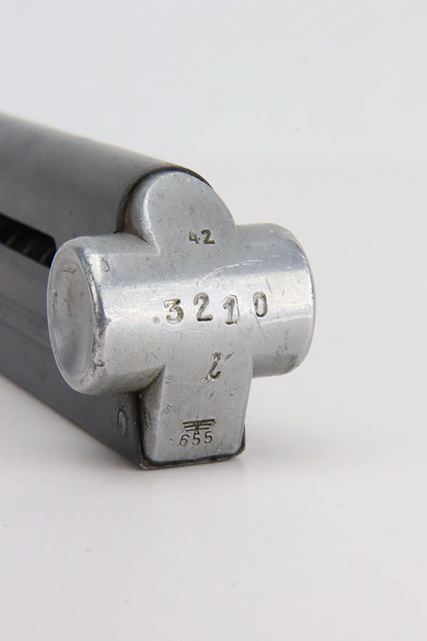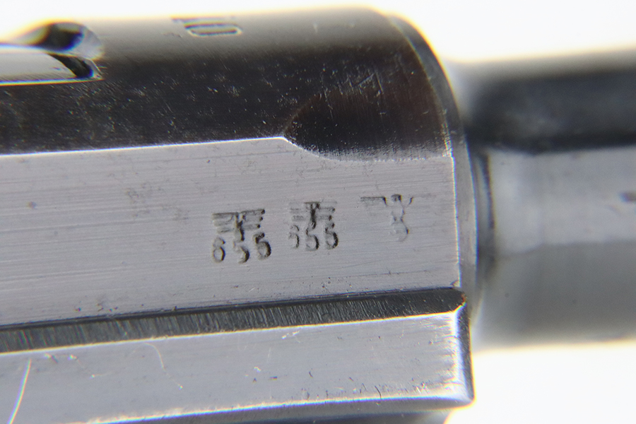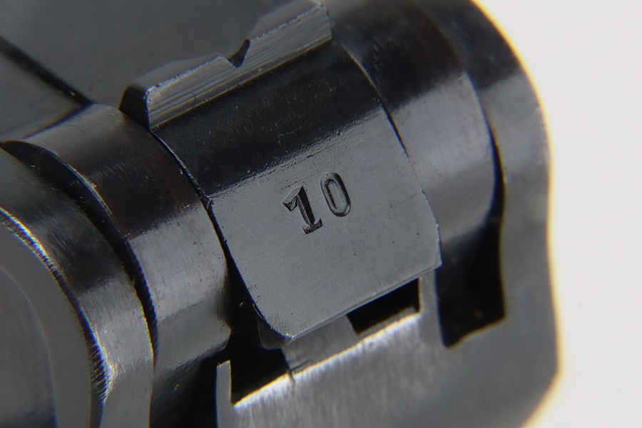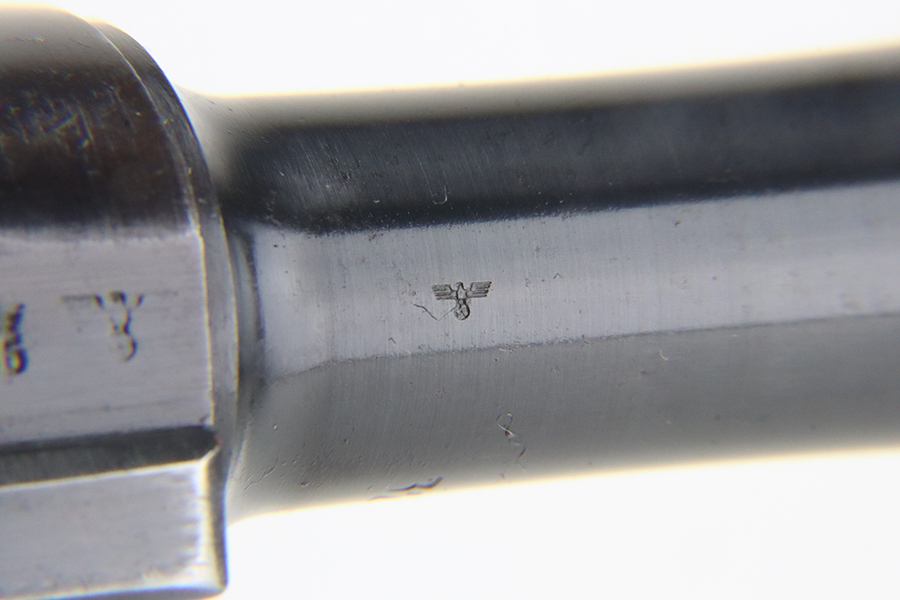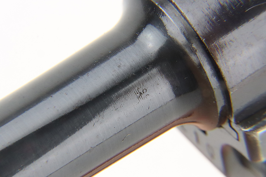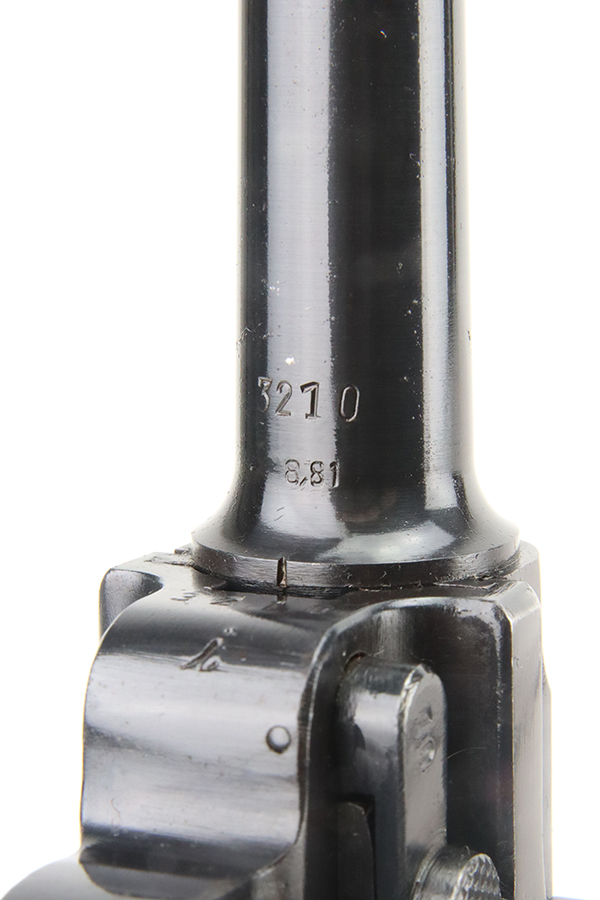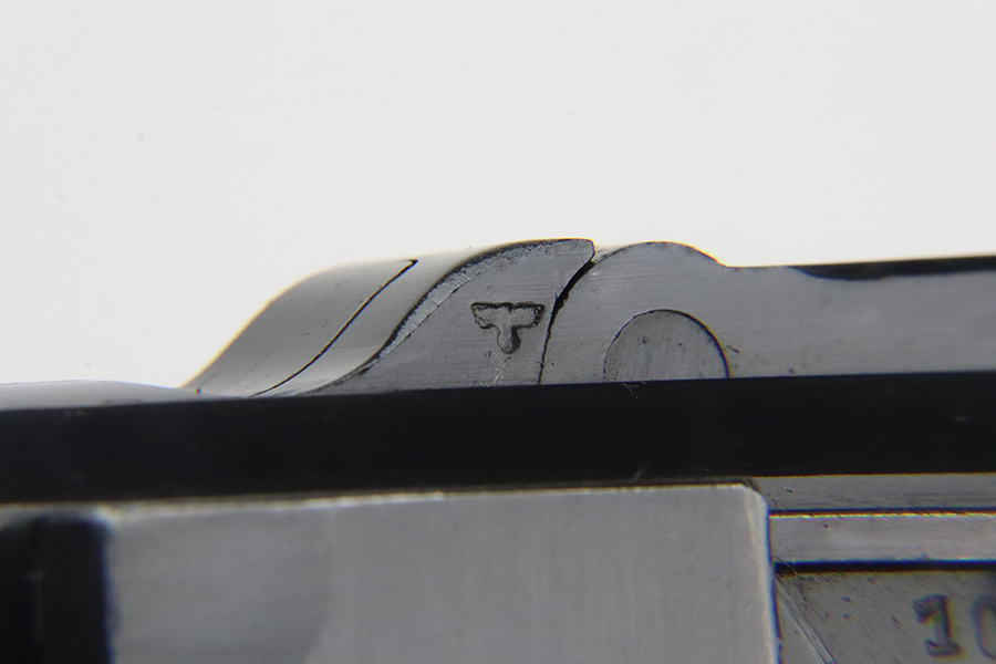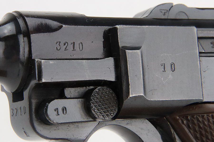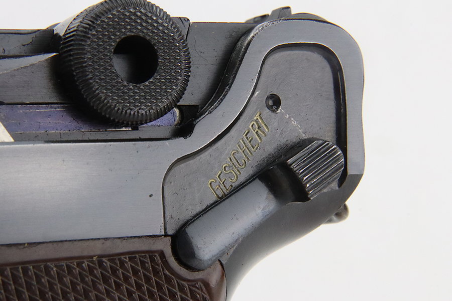 2/26/24 – This 1940 dated Mauser Luger is all original and has the rare, reddish Krieghoff grips on it. A very small set of 1940 lugers have these grips on them from the factory. It is assumed that they experimented with the HK grips as an option before they started making their own black plastic grips. These grips are found in the G to K blocks. This one is all matching, and comes with a ’42’ code replacement mag that has been force-matched to this pistol. It has retained nearly all of its finish with one small area of very light thinning on the left side and hints of pin-pricking along the barrel, on the chamber, and on the grip straps. The bore has good rifling, but there is some light freckling in the grooves.
