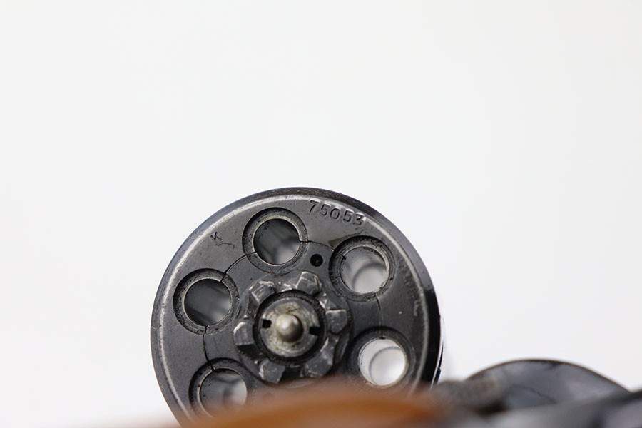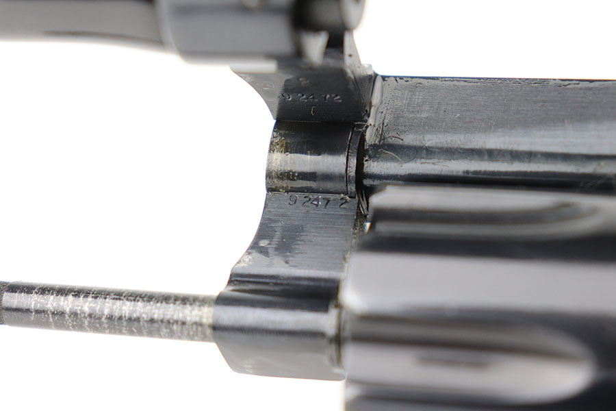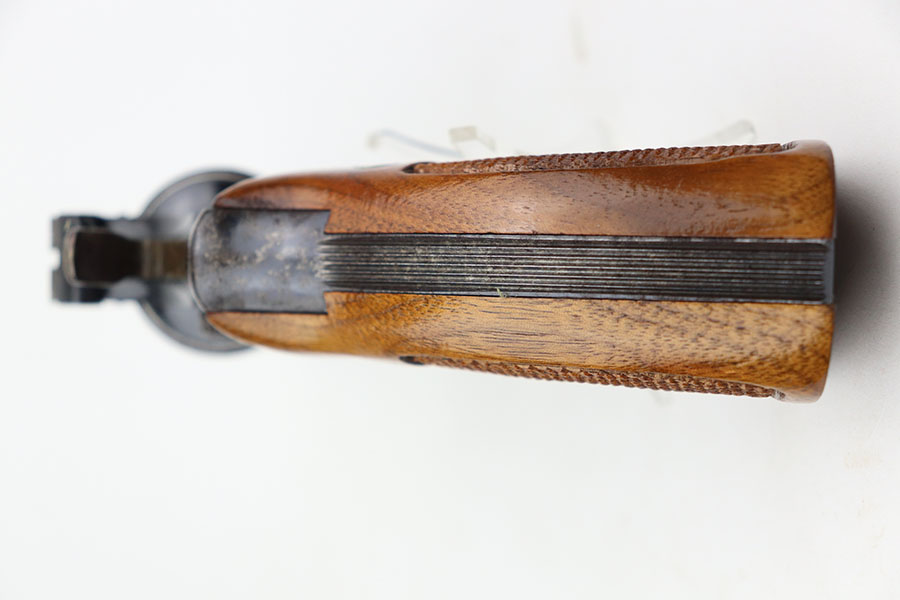 4/22/21 – This is a beautiful Smith & Wesson K-22 Masterpiece Pre-17 model revolver from 1950. All matching and original with 96-97% of the original blue. The gun is in near-mint condition aside from a patch of wear and freckling on the back of the frame. Mint bore and grips. Six inch barrel. C&R eligible. Hischier collection.