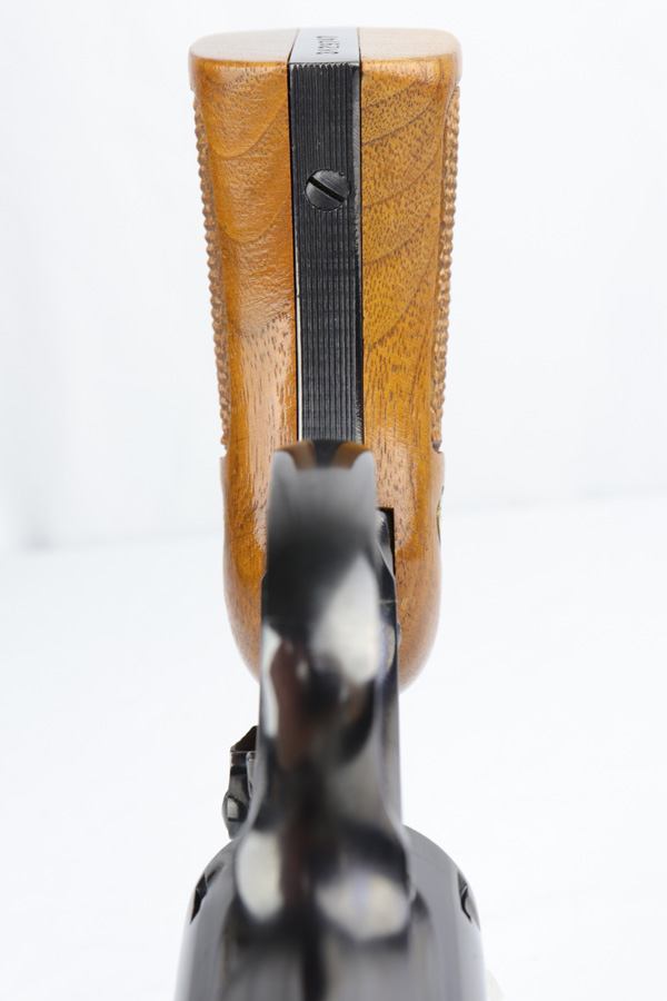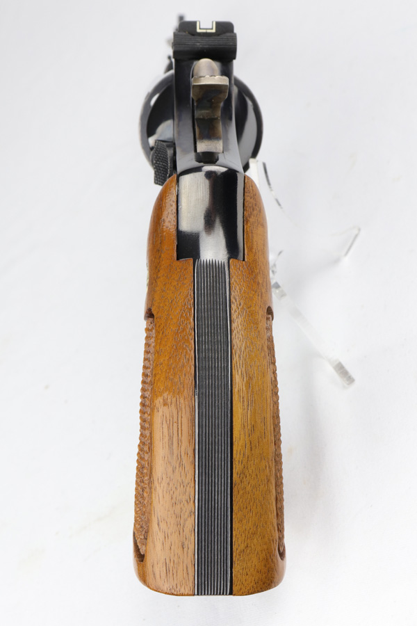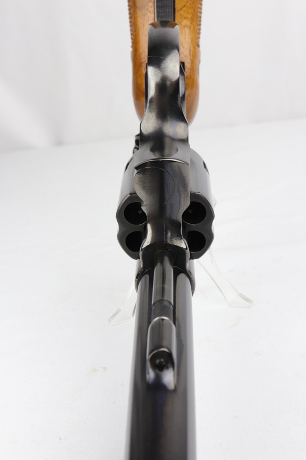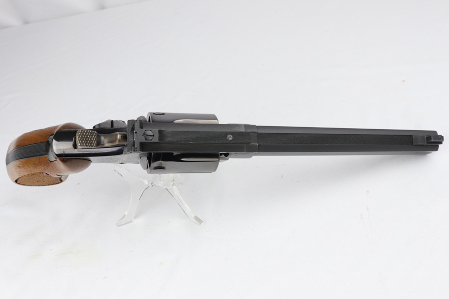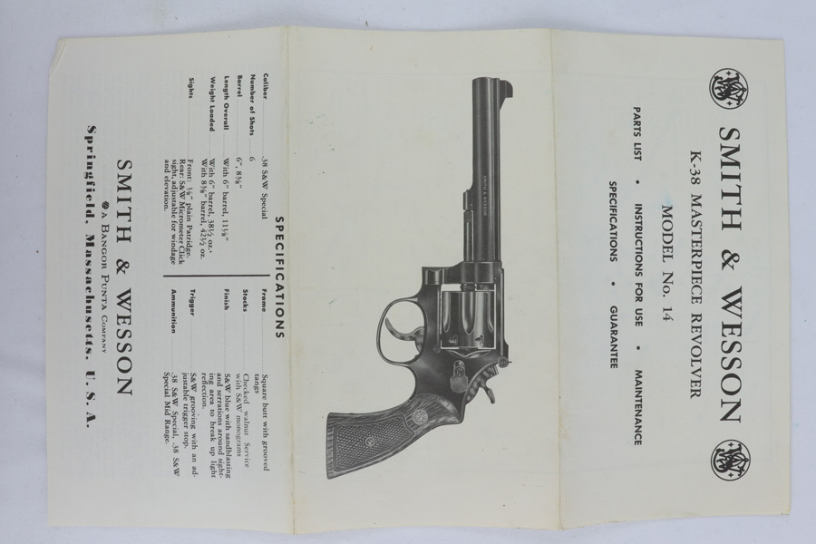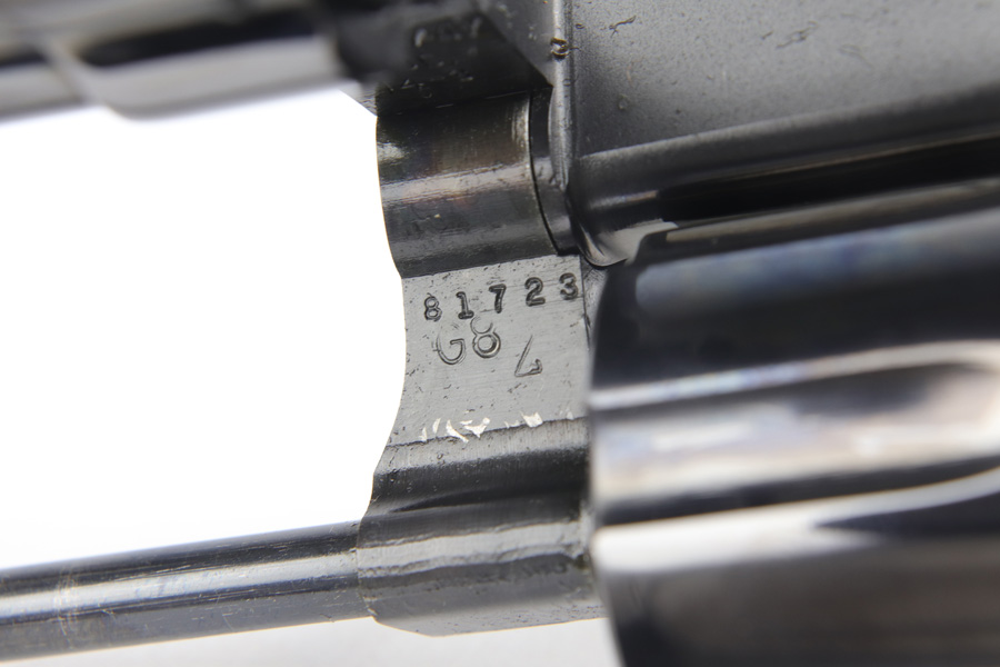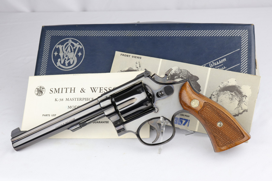 12/6/18 – This is a near-mint Smith & Wesson Model 14-3 revolver in the original matching box. The serial dates this gun to about 1970-71, so FFL is required. The high-polish blue rates at 98-99% with only minor muzzle wear and roll marks. Fantastic bore and grips. Right panel is numbered and matching to the gun. The box includes basic S&W paperwork.