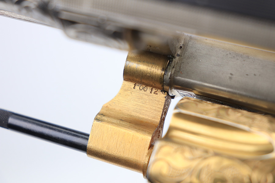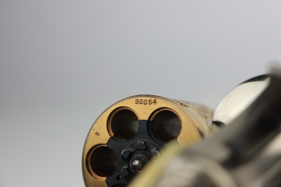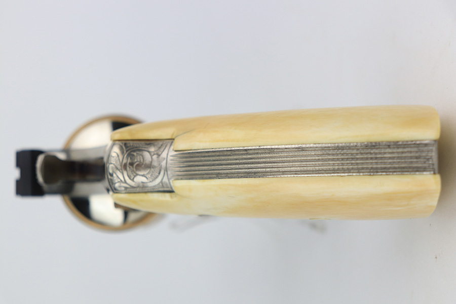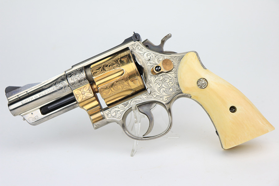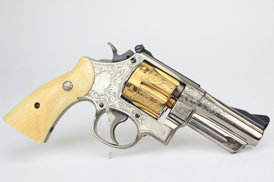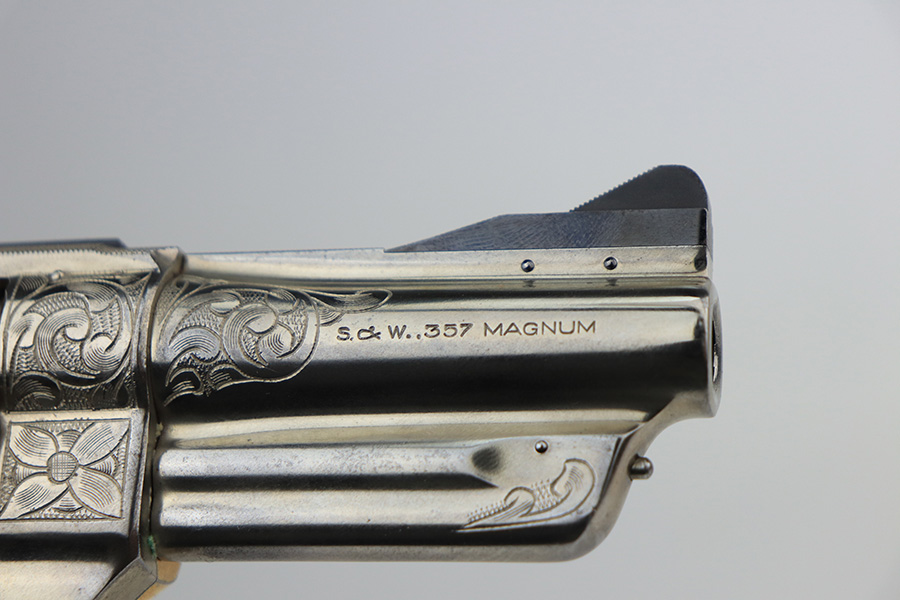 12/20/21 – This is a beautifully engraved Smith & Wesson Pre-27 revolver with original ivory grips. It has a 3.5 inch barrel and comes in .357 Magnum. The engraving is done in the “scroll” style by Cole Agee. This pistol was done sometime in the 1950’s and Cole is well known in the collector community as a Master Engraver. His work is very desirable and tends to increase in value over time. The gun is all matching and original and in excellent condition. There’s a minor turn line on the cylinder and in great condition overall. The grips are original ivory and have a nice patina with nice graining on the bottom. Original nickel finish with beautiful gold wash on cylinder and cylinder release. Excellent bore and functions perfectly. This is considered an investment grade gun!