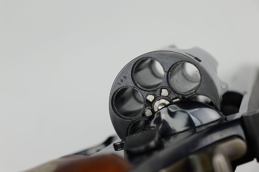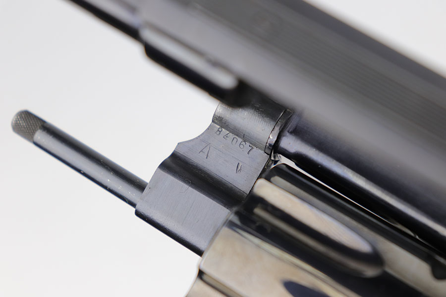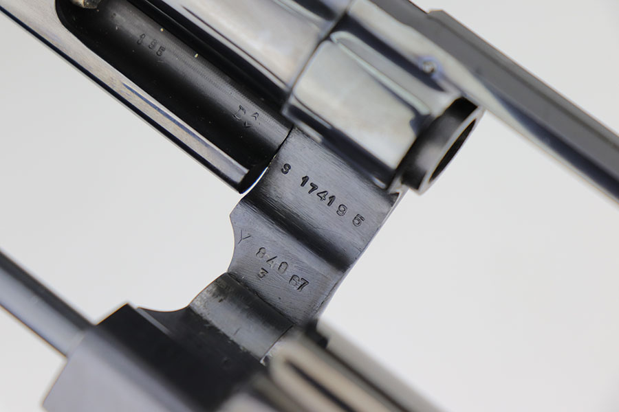 11/23/20 – This is a beautiful example of a Smith & Wesson Model 29 made in 1958. Barrel is 6.5 inches and chambered for .44 magnum, and it has the four screw frame design. Original blue rates at 96-97% with muzzle wear on both sides, and roll mark on cylinder. Nice case hardening on hammer and trigger and a minty bore. Beautiful, unmarked grips.