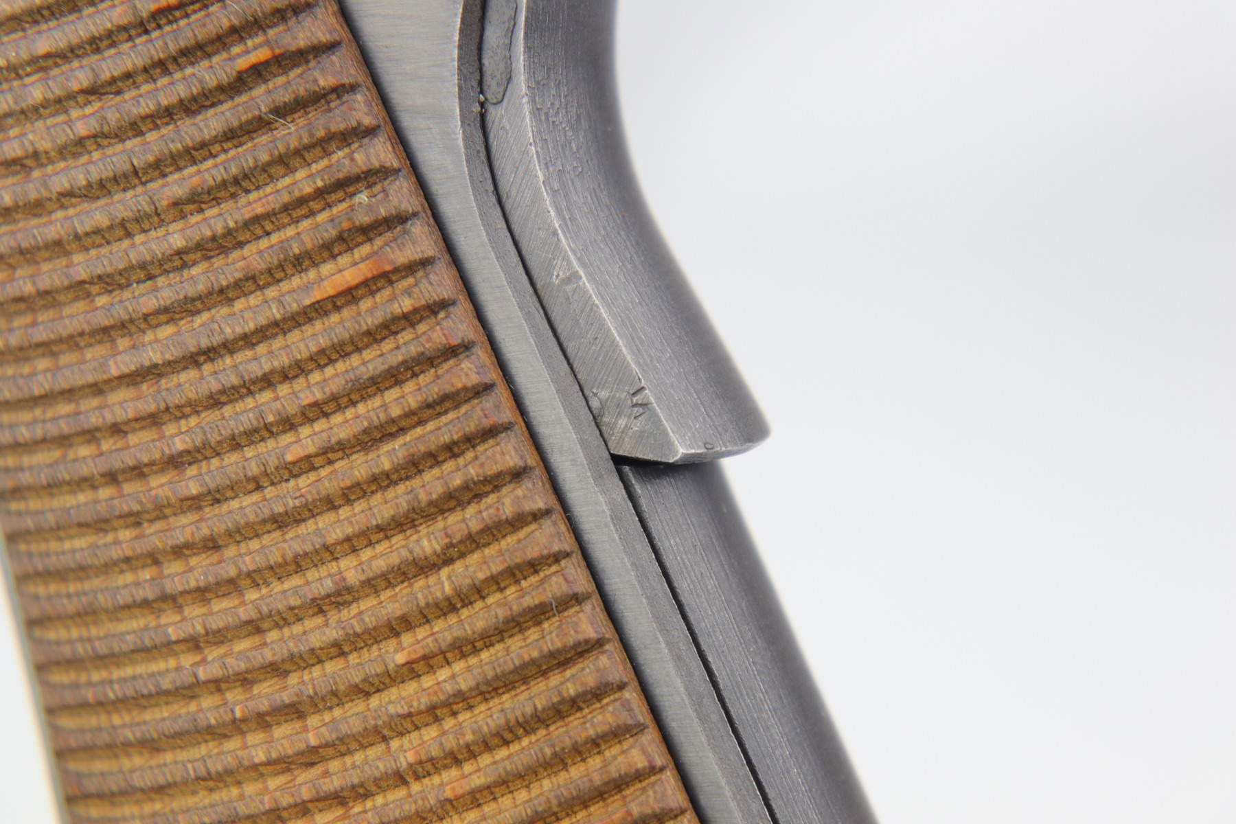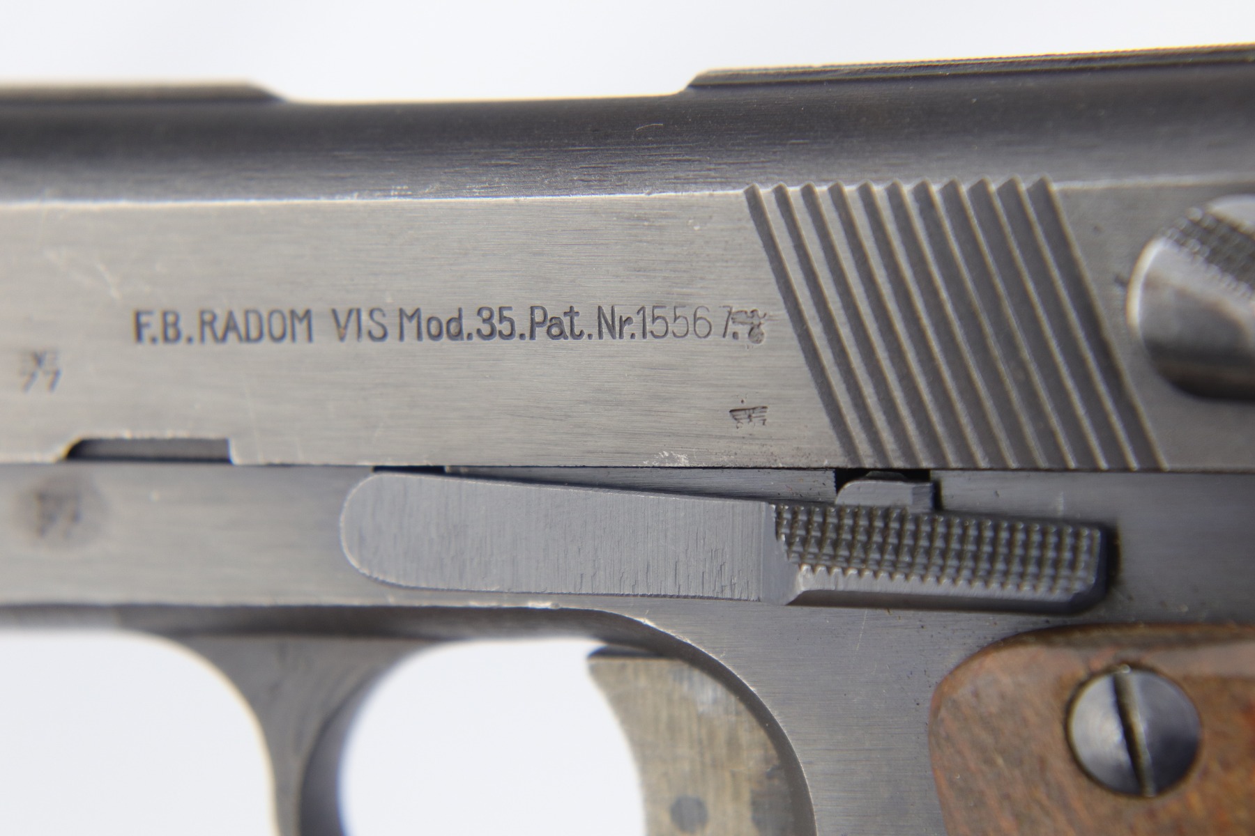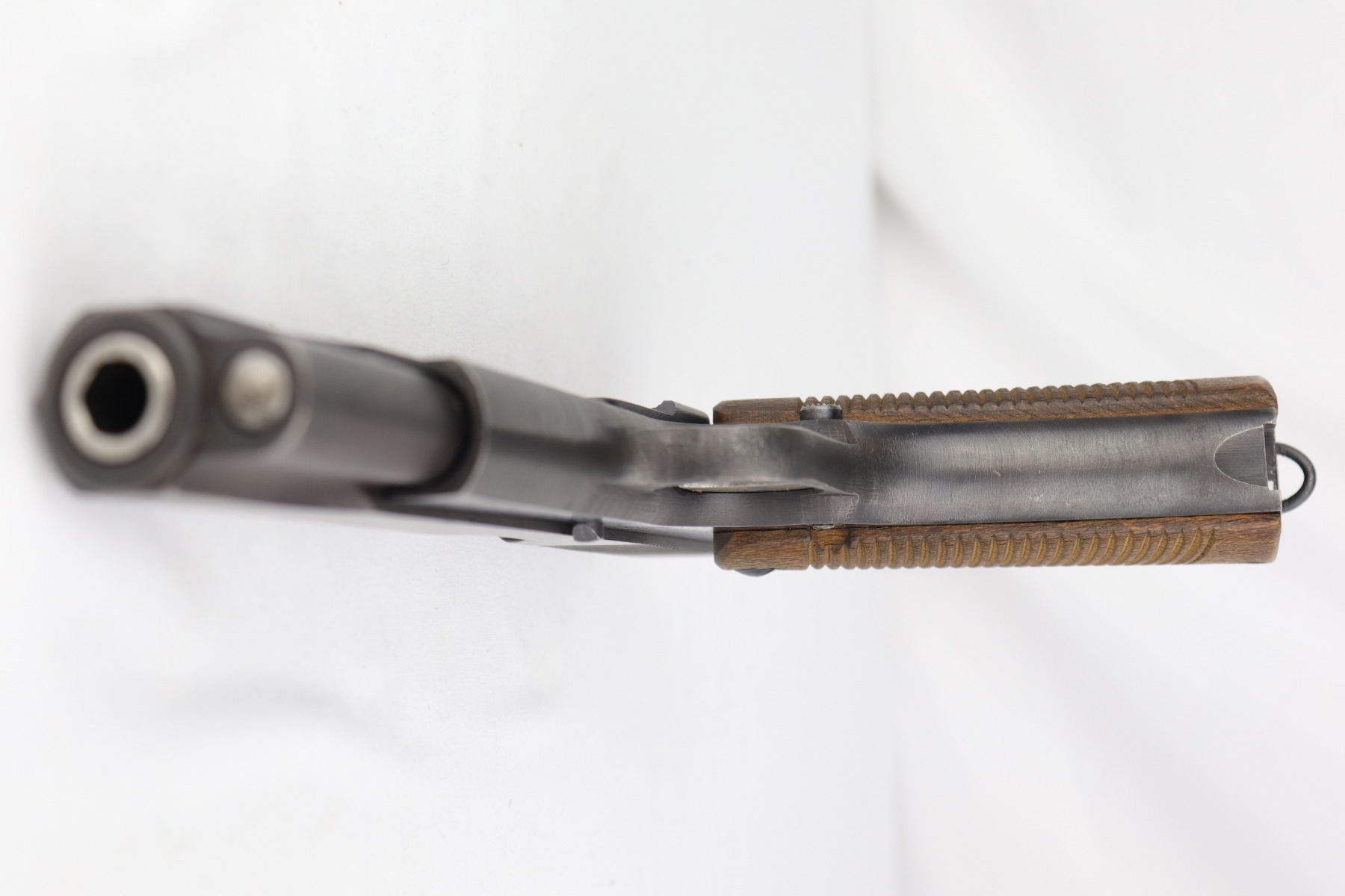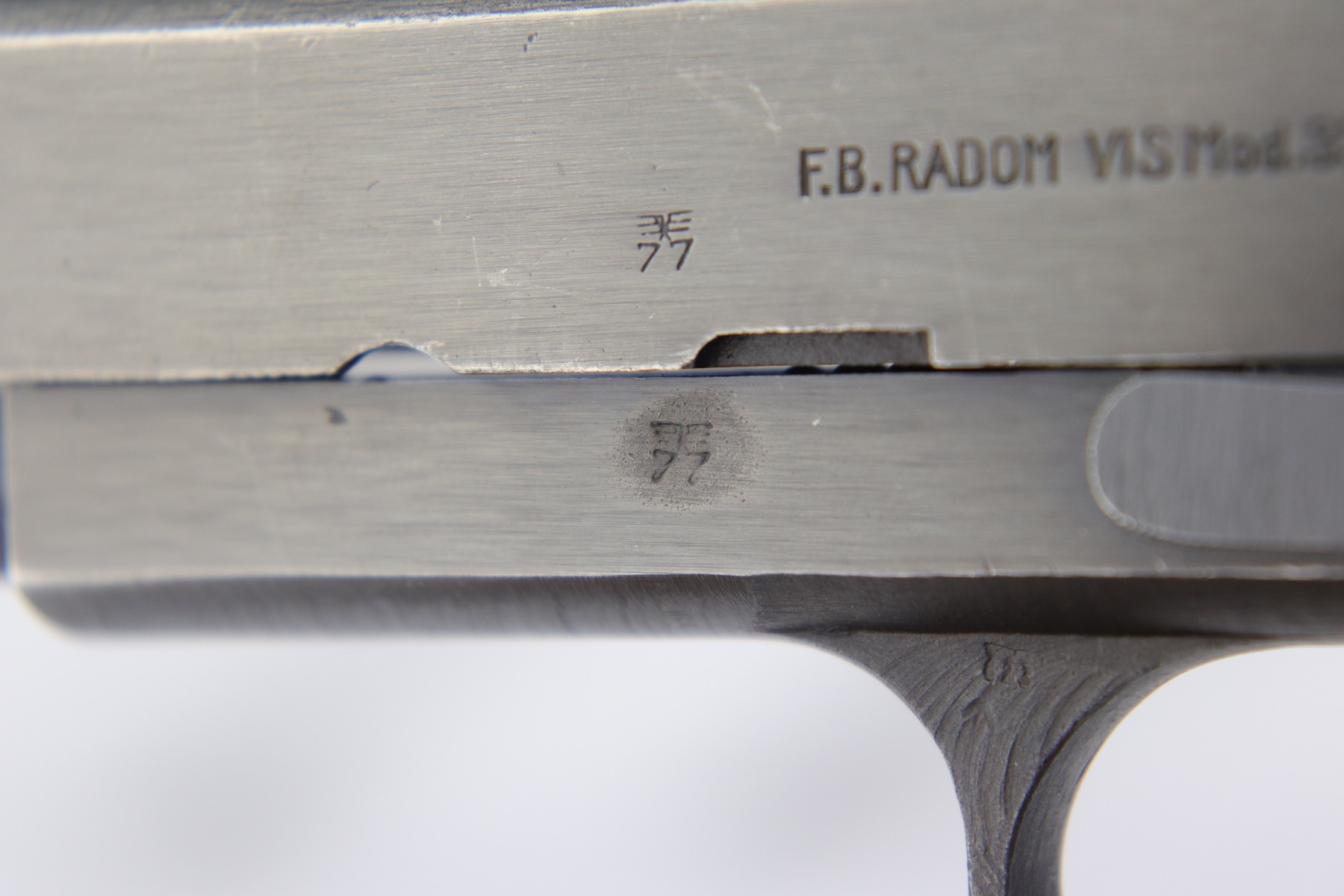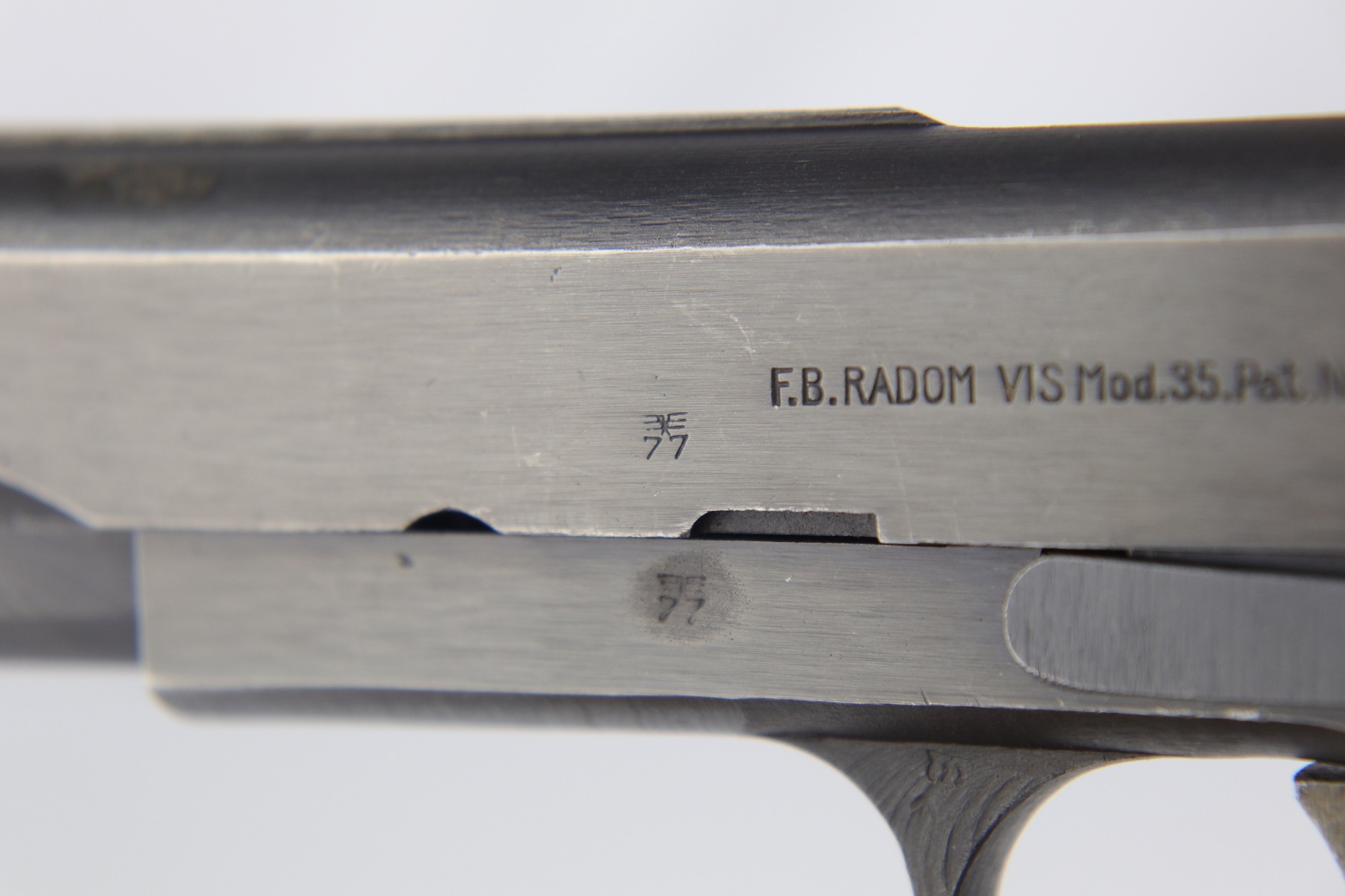 12/19/18 – This is a fantastic example of a scarce subvariation of the VIS M1935. It’s a Grade III, Subvariation 2 as it is produced by Steyr with E/623 stamp on slide and trigger guard. Also in proper serial range (B2000-B6000). There were only ~22,000 of this variation produced. The gun is all matching and original with 98% blue remaining, showing only minor high edge wear from the holster. Comes with two total magazines, both of which are waffen marked. The holster is in very good condition with minor age/handling wear, and a clear internal inkstamp. Excellent, shiny bore.