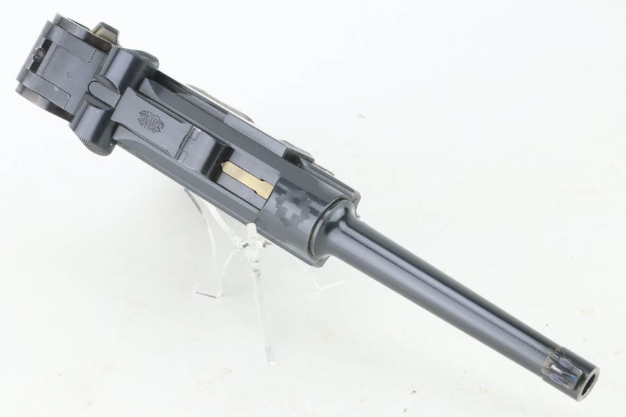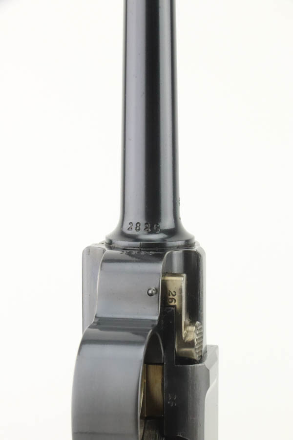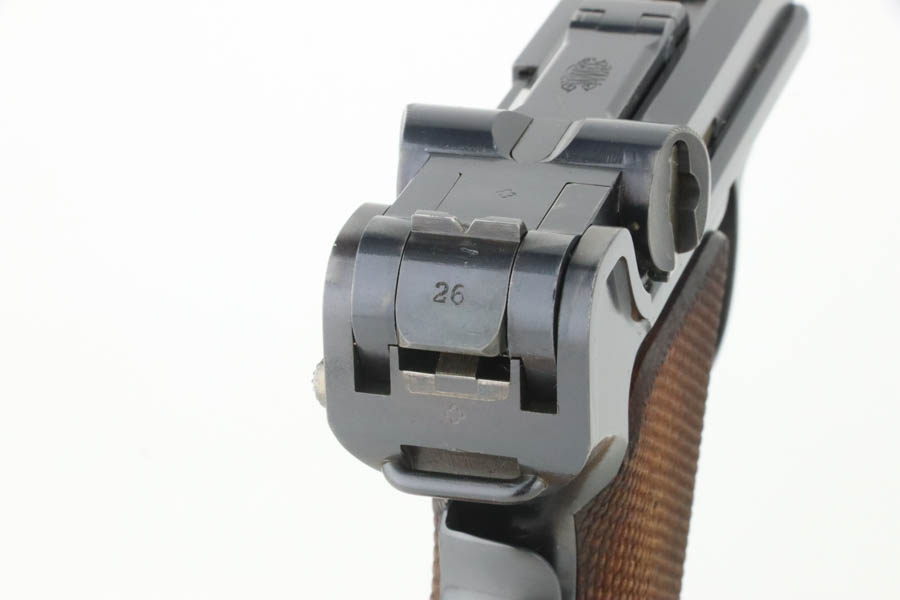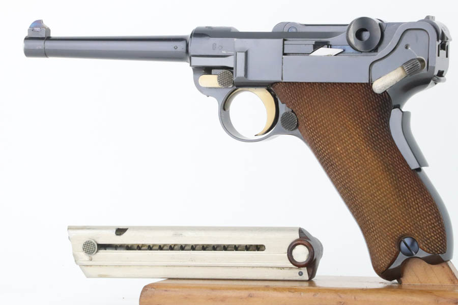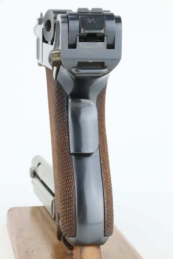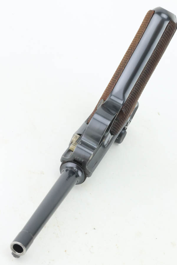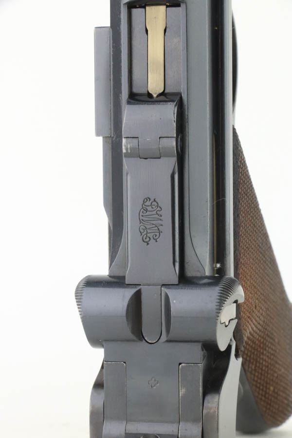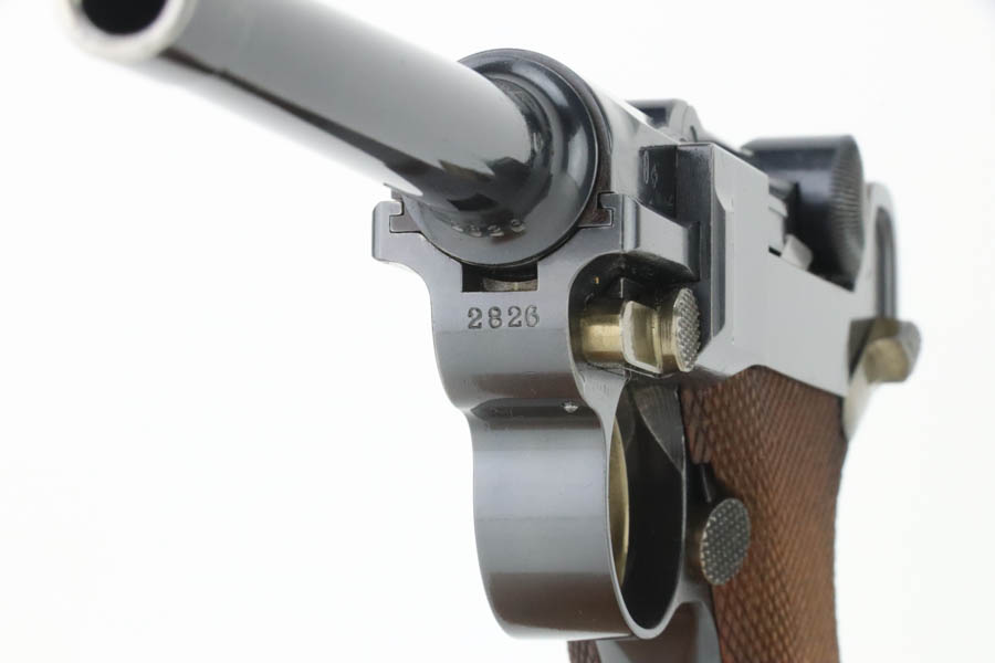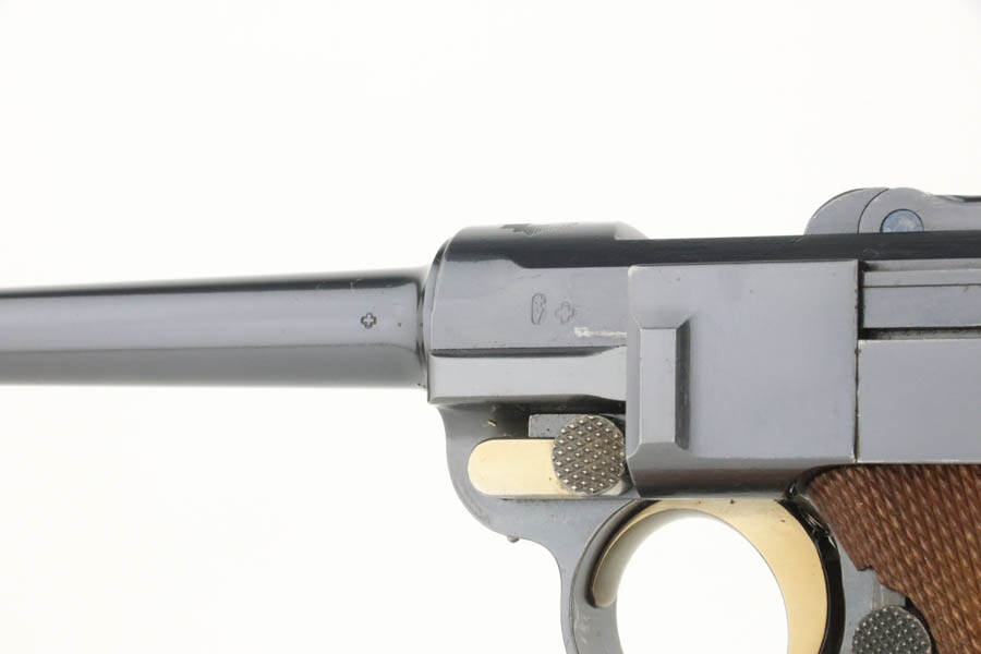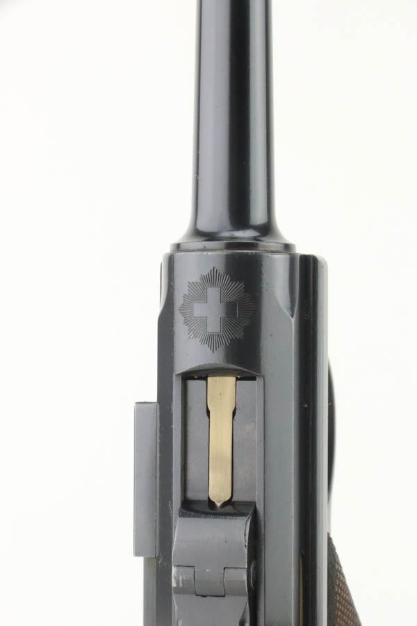 8/14/24 – This is a beautiful example of an early Swiss contract DWM Luger. It’s a Model 1900 variation with dish toggle and wide trigger guard All matching, Swiss cross in sunburst over chamber, and Swiss cross markings throughout. It is all matching and has retained nearly all of its bluing. There is just a hint of wear around the muzzle. Fitted with mint matching-numbered wood grips and comes with a proper Swiss magazine. Mint bore.