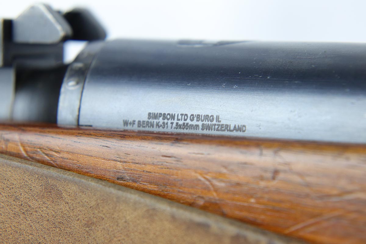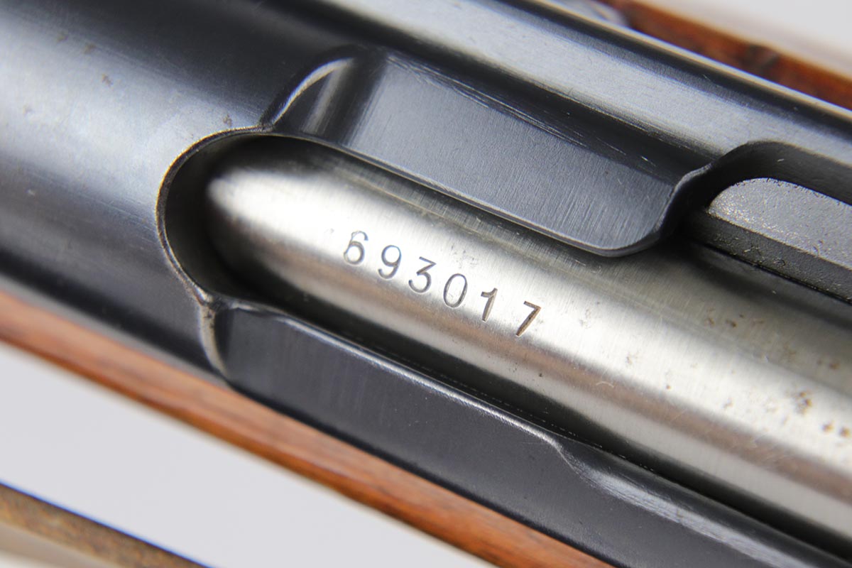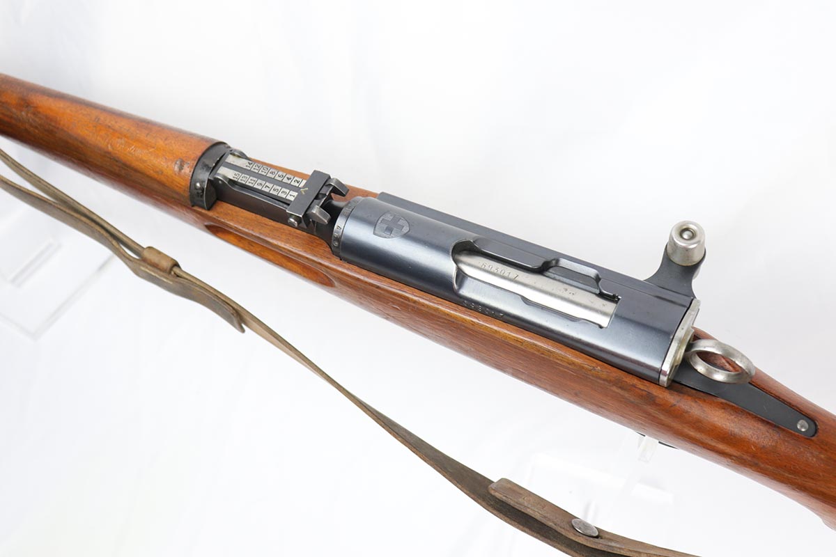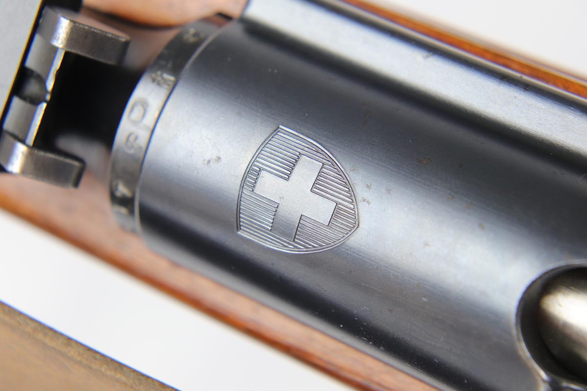 8/9/18 – This is one of the best examples of a Swiss k31 rifle that you could find – a walnut stock rifle in excellent original condition, great bore and excellent wood with minimal wear. Many of these rifles were imported over the past 20 years and are considered by many to be the most accurate surplus rifle available for a collector and marksman alike. 99% of the imported guns saw heavy use by Swiss Army and show significant wear. Others were rearsenaled to near new condition. This gun has NOT been rearsenaled and shows very little field wear. All the numbers match including bolt and the magazine. Sharp Swiss cross in shield cartouche on the right side of the stock. Metal retains around 97-98% of its original blue with the wear found on the barrel. The walnut stock is yet another bonus. There’s a very discreet import mark on the left side of the receiver. A great example of K31 battle rifle.