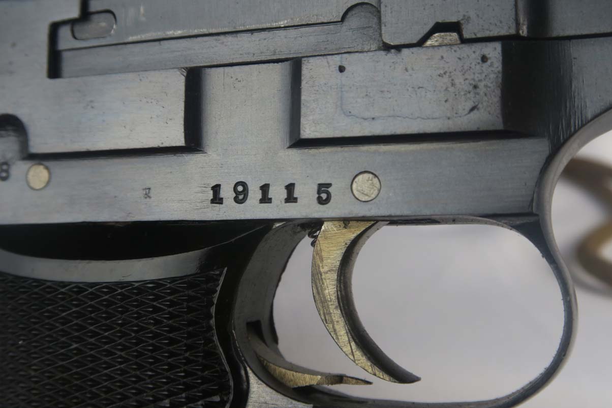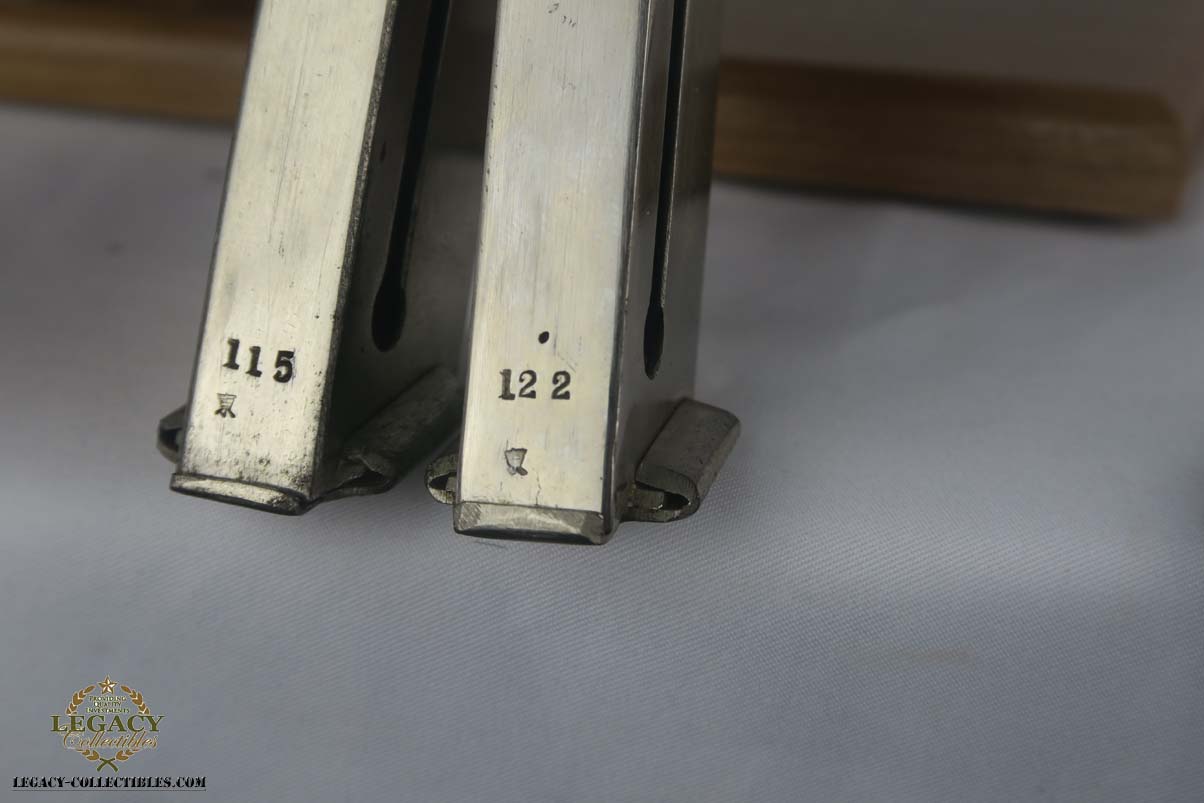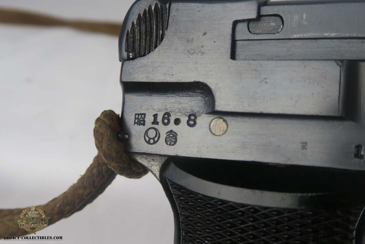 7/6/17 – This is a gorgeous Type 94 Nambu rig, with rare shoulder holster and lanyard, and one matching magazine.  The finish on the pistol rates at about 98-99% with minor patina in some places but very little finish loss.  One magazine is original and matching, and the other is a nice early example.  The rare lanyard and shoulder holster have sold independently for us at over $400 apiece in the past.  Also included is the original cleaning rod.  Mint bore.